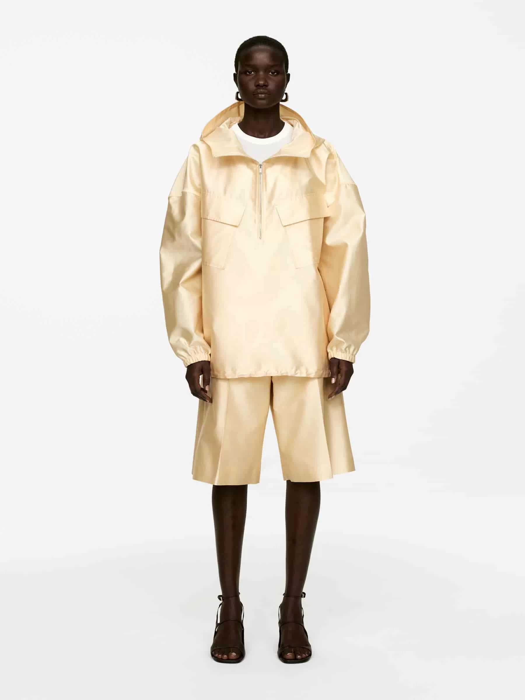 Anorak mit Kapuze aus einer Mischung aus Polyester und Maulbeerseide. Gummizüge am unteren Saum und an den Manschetten. Aufgesetzte Taschen mit Klappen auf der Brust und Reißverschluss.