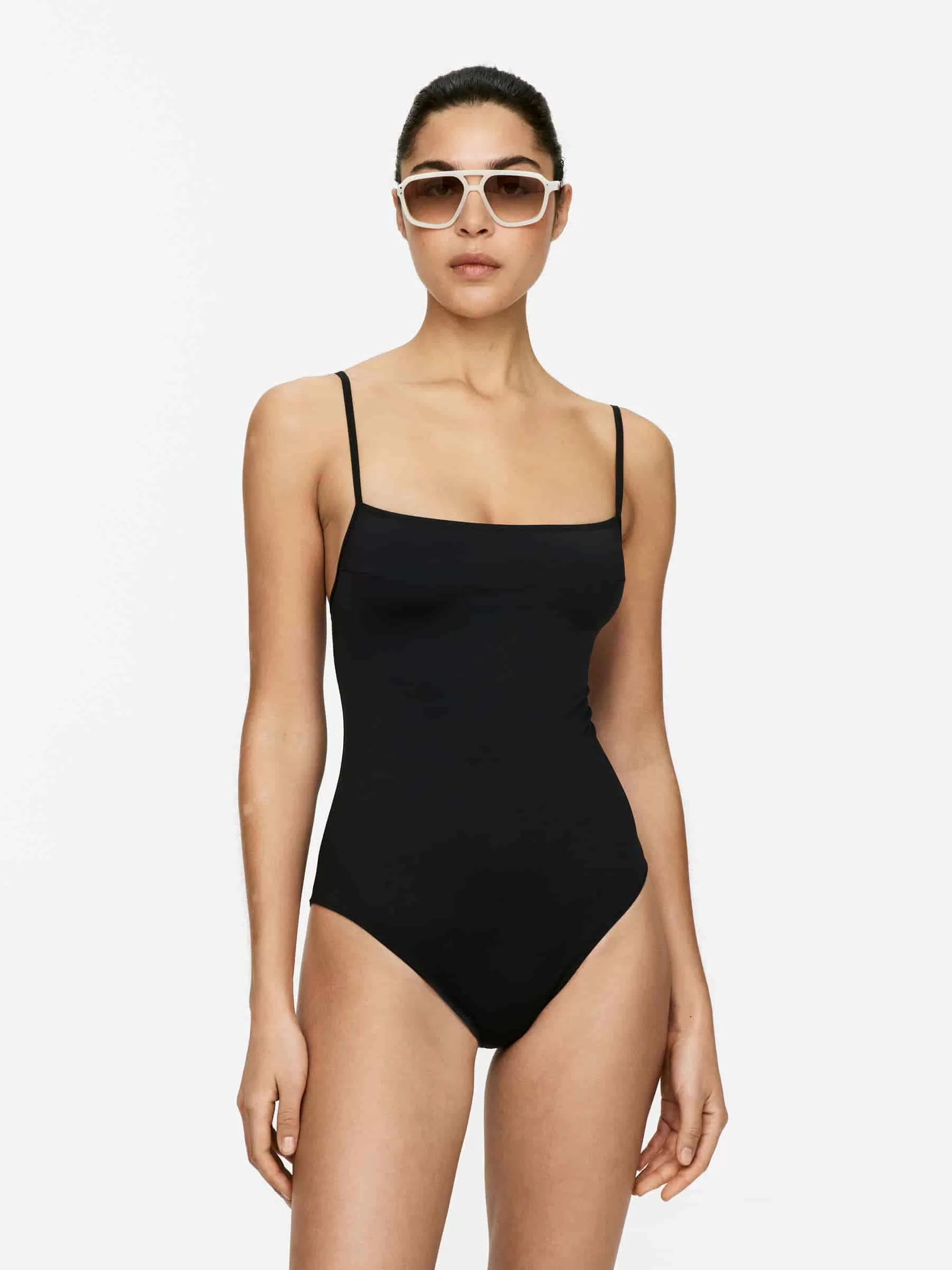 Badeanzug mit geradem Ausschnitt, schmalen, verstellbaren Trägern und Brustabnähern für eine glatte Form und eine gute Passform. Komplett gefüttert.