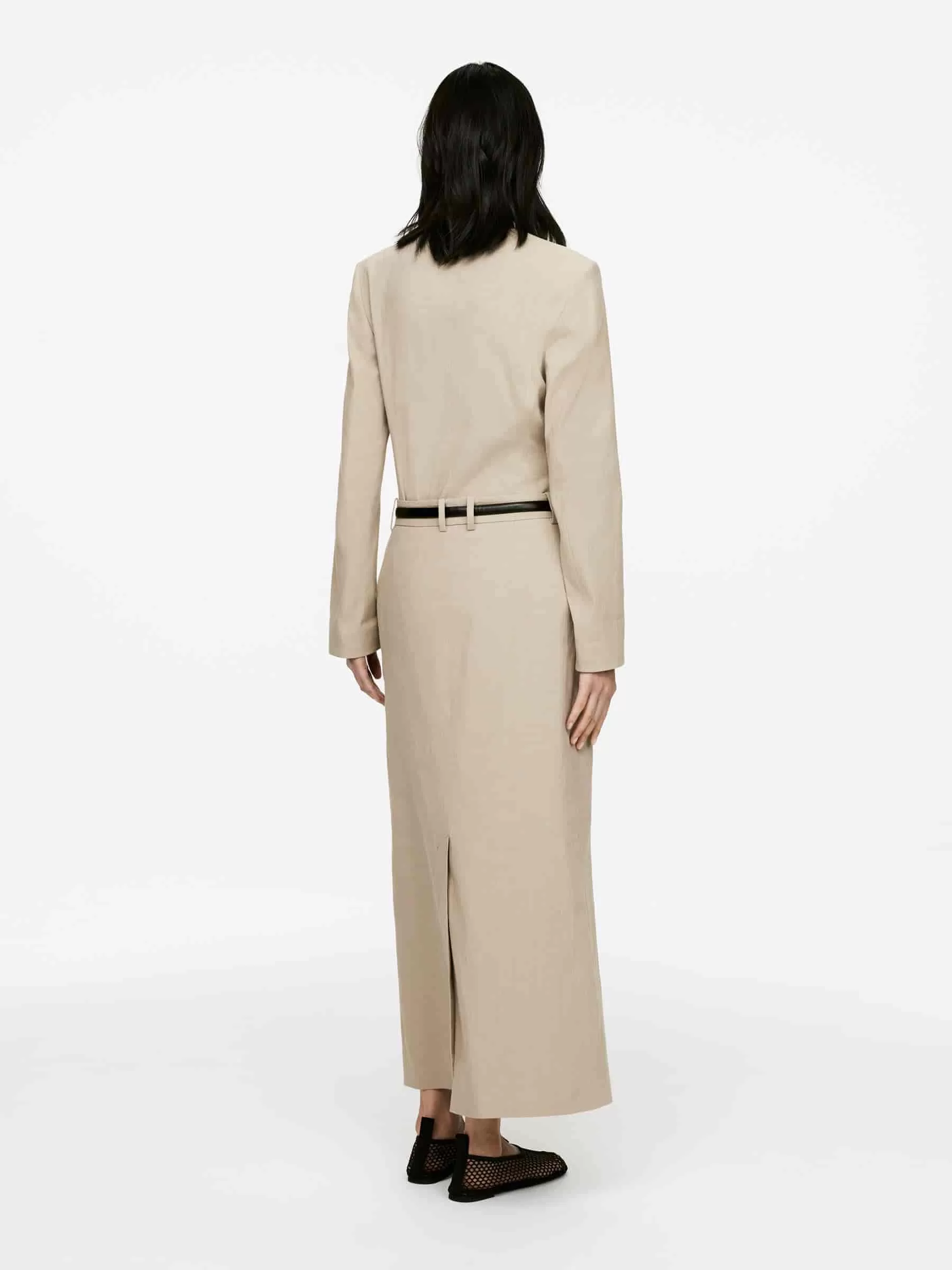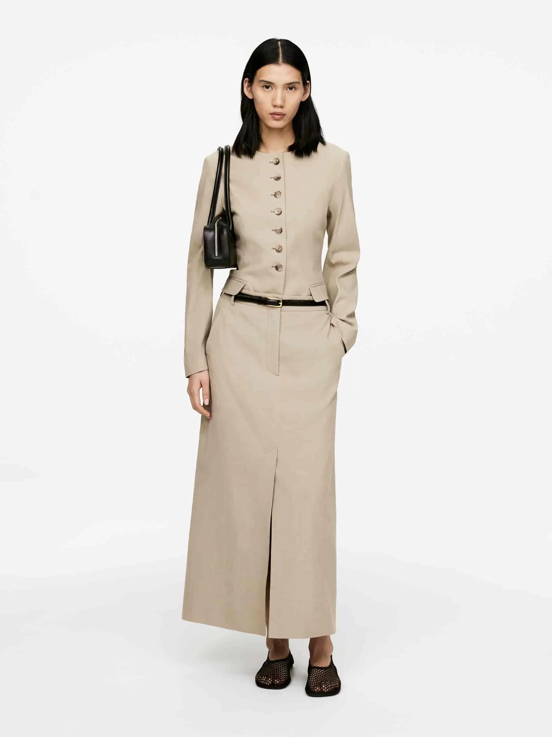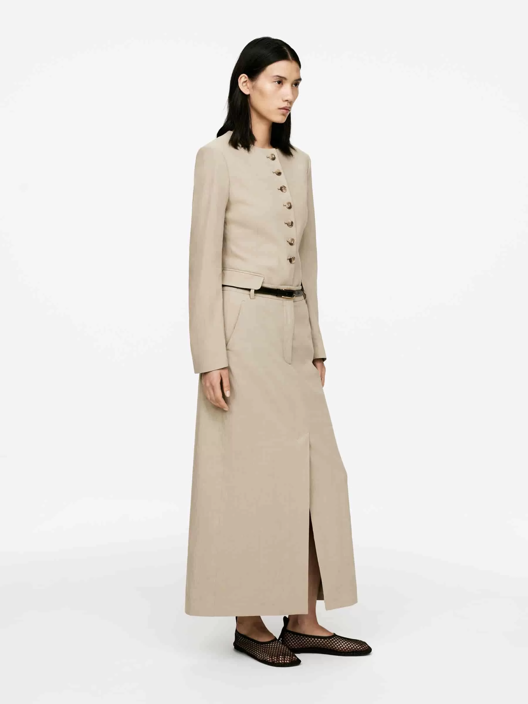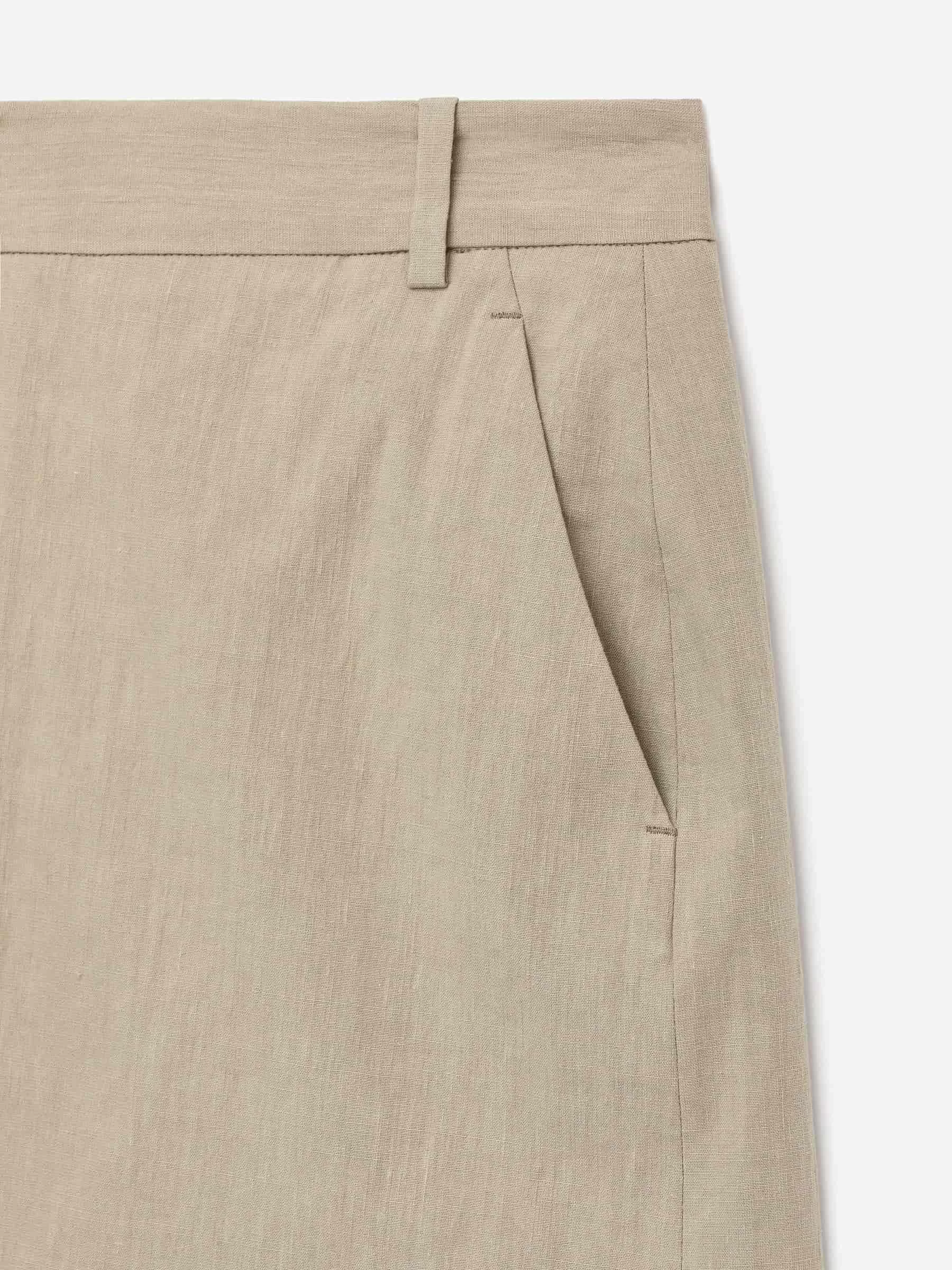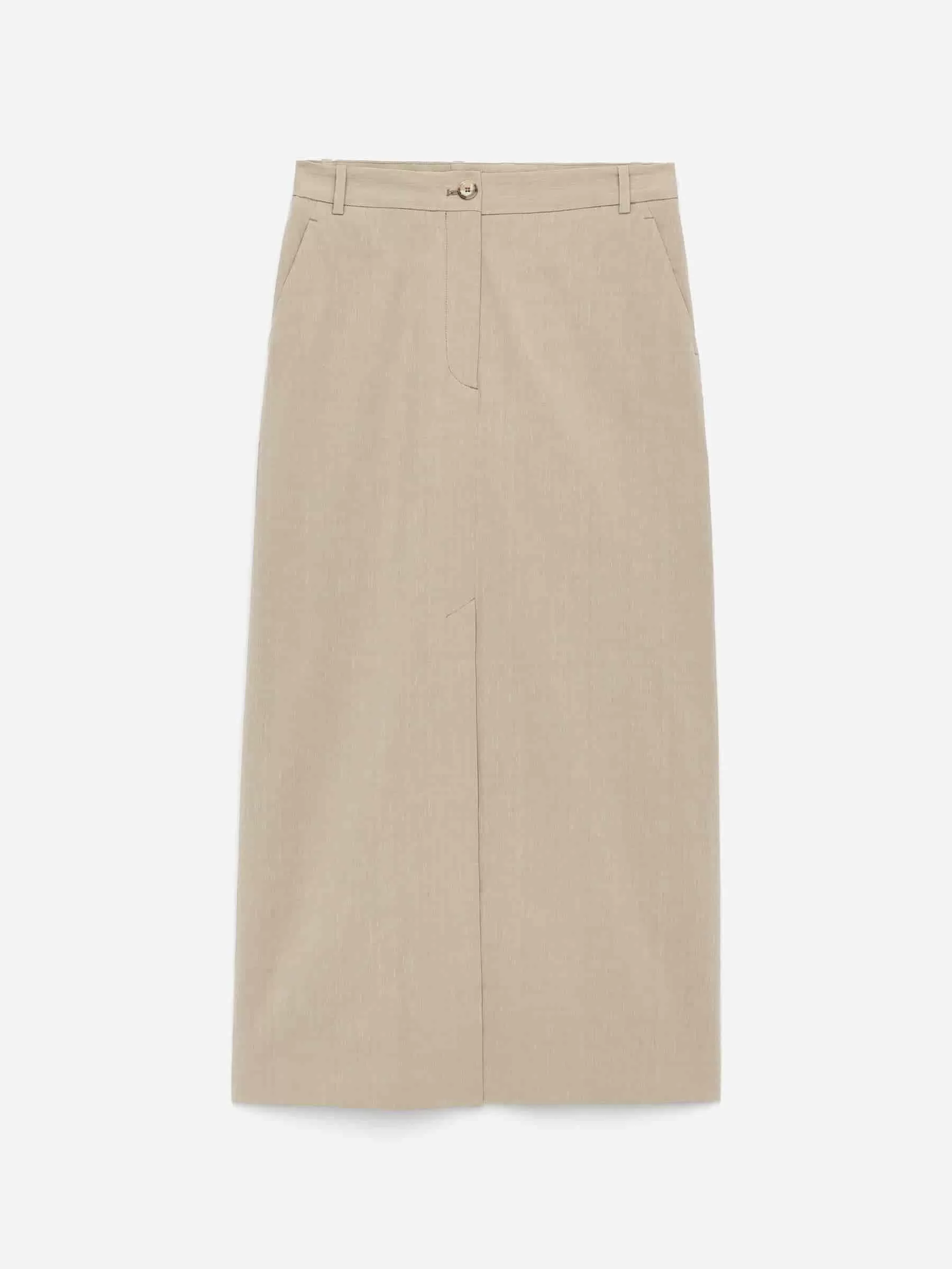 Rock aus Leinen-Baumwolle mit einem Hauch Elastan für Dehnbarkeit. Ausgestattet mit einem hohen Schlitz vorne in der Mitte und schrägen Seitentaschen.