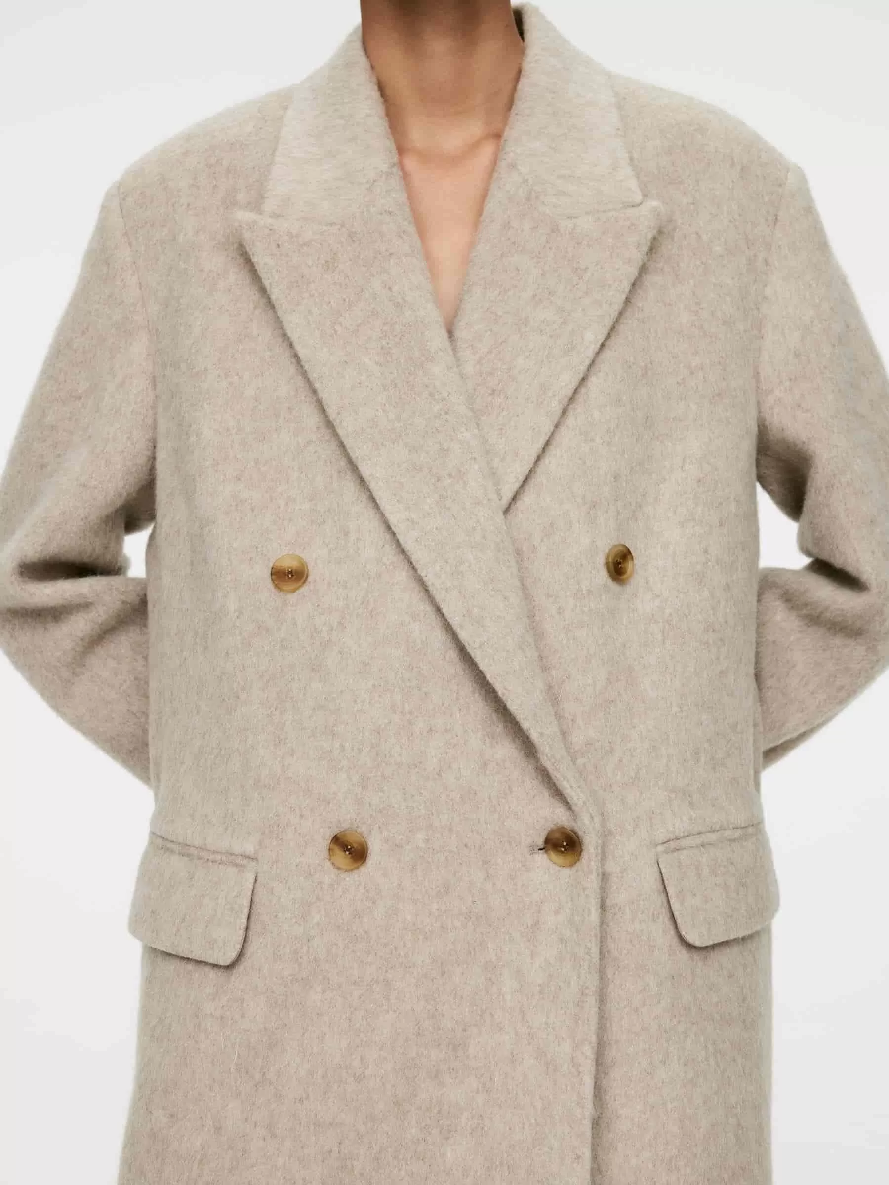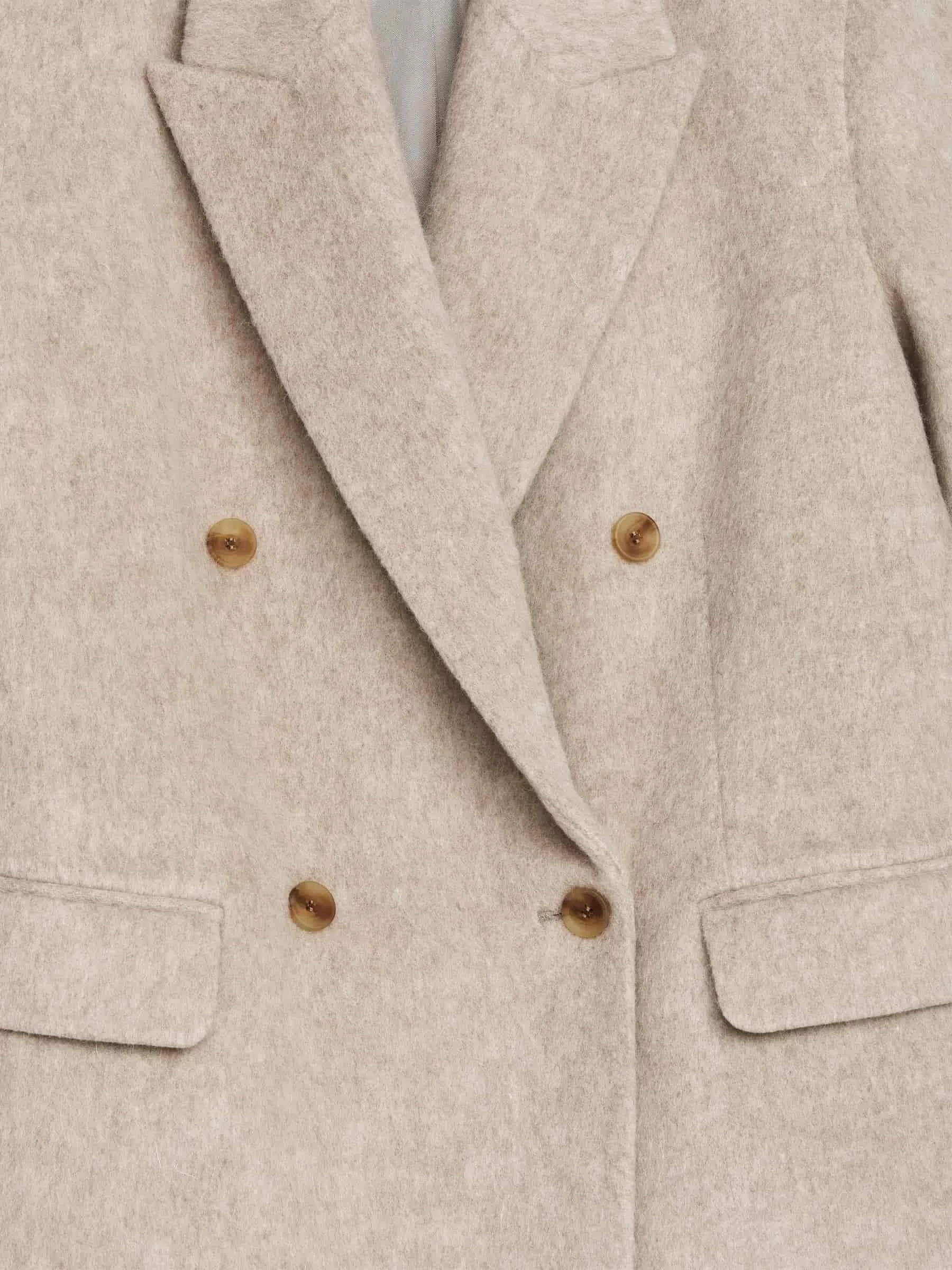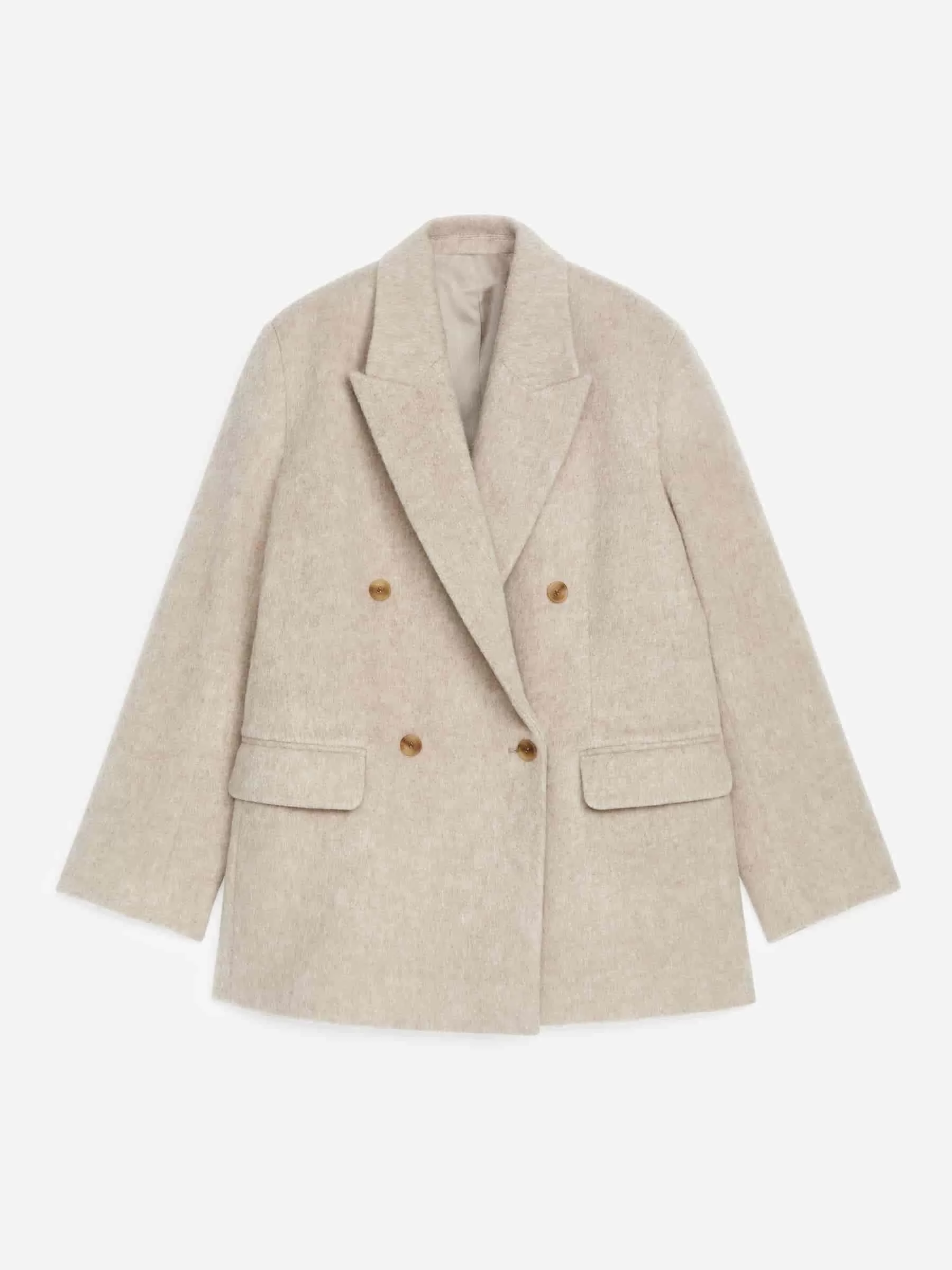 Zweireihiger Blazer aus einer Wollmischung mit gebürsteter Oberfläche. Ein vollständig gefütterter Stil mit breitem Revers, Leistentaschen mit Patte vorne und Schlitz hinten. Übergroße Passform.