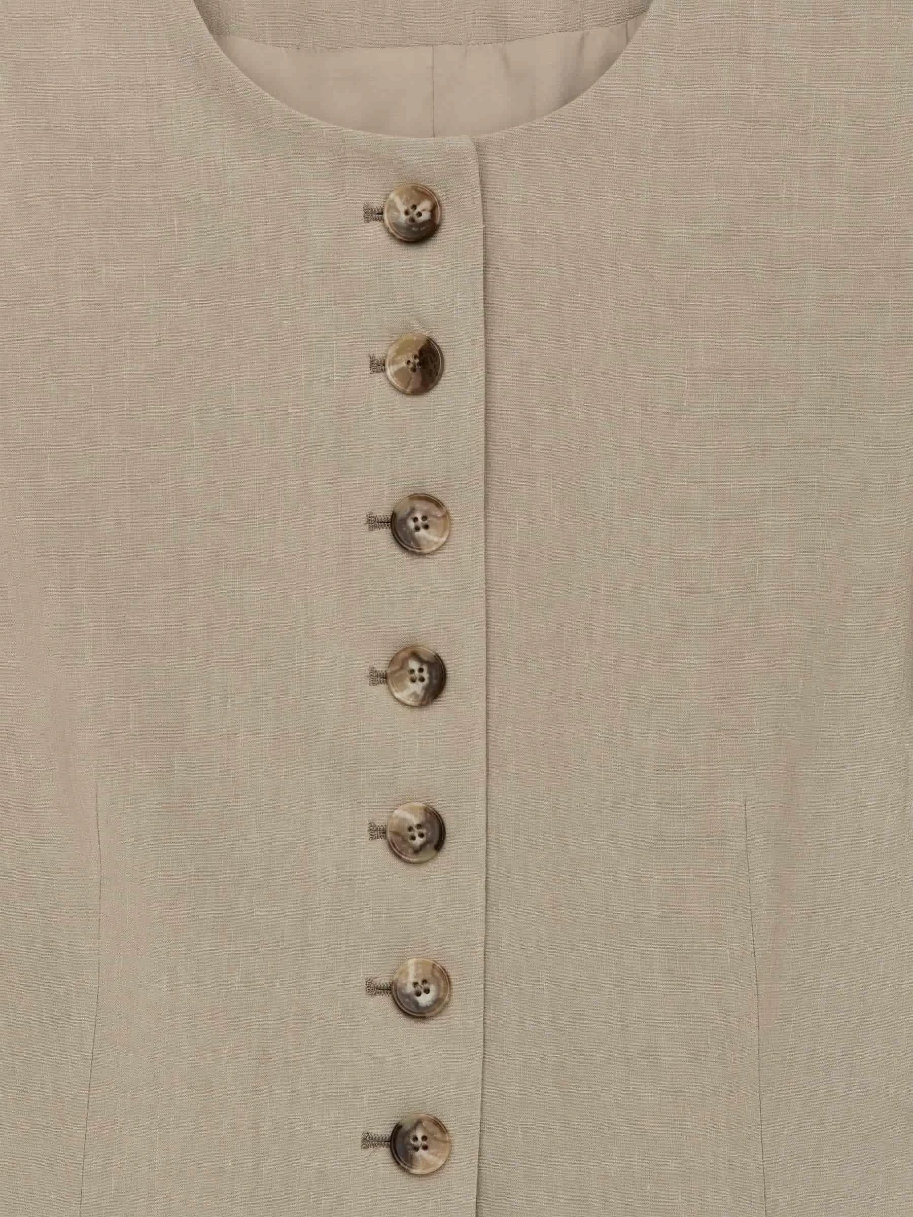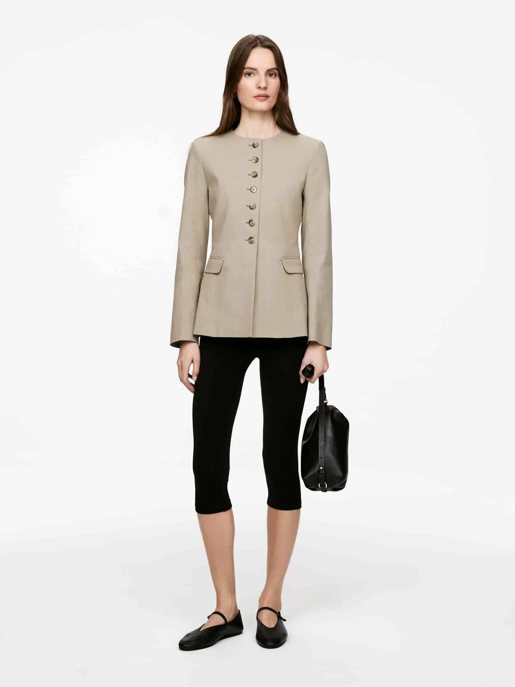 Kragenloser Blazer mit Knopfverschluss, Abnähern und Pattentaschen. Dieses gefütterte Modell ist schmal geschnitten.