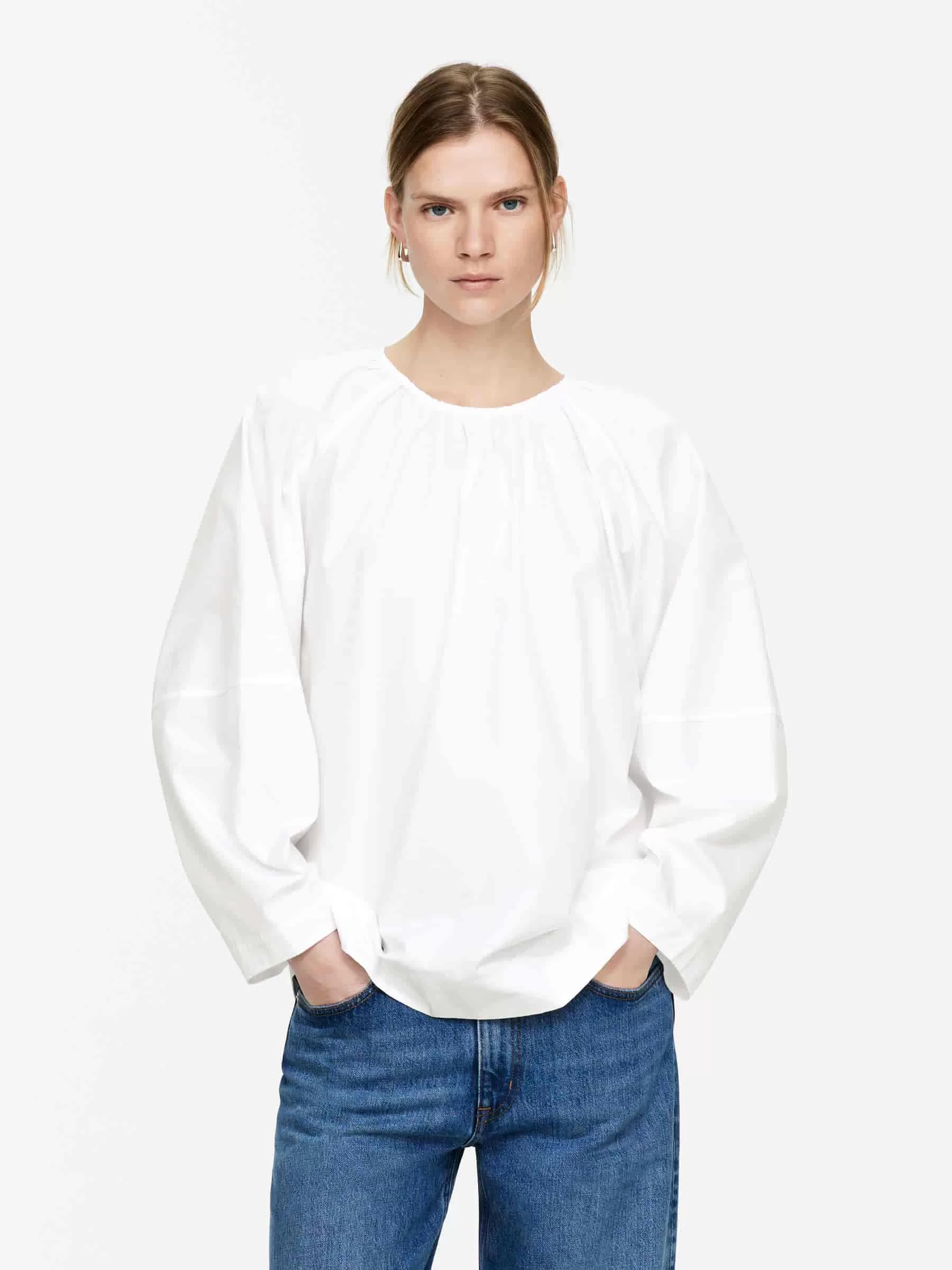Baumwollbluse mit offenem Rücken, Raffungen am Hals und Bindebändern in der Mitte des Rückens. Lockere Passform.