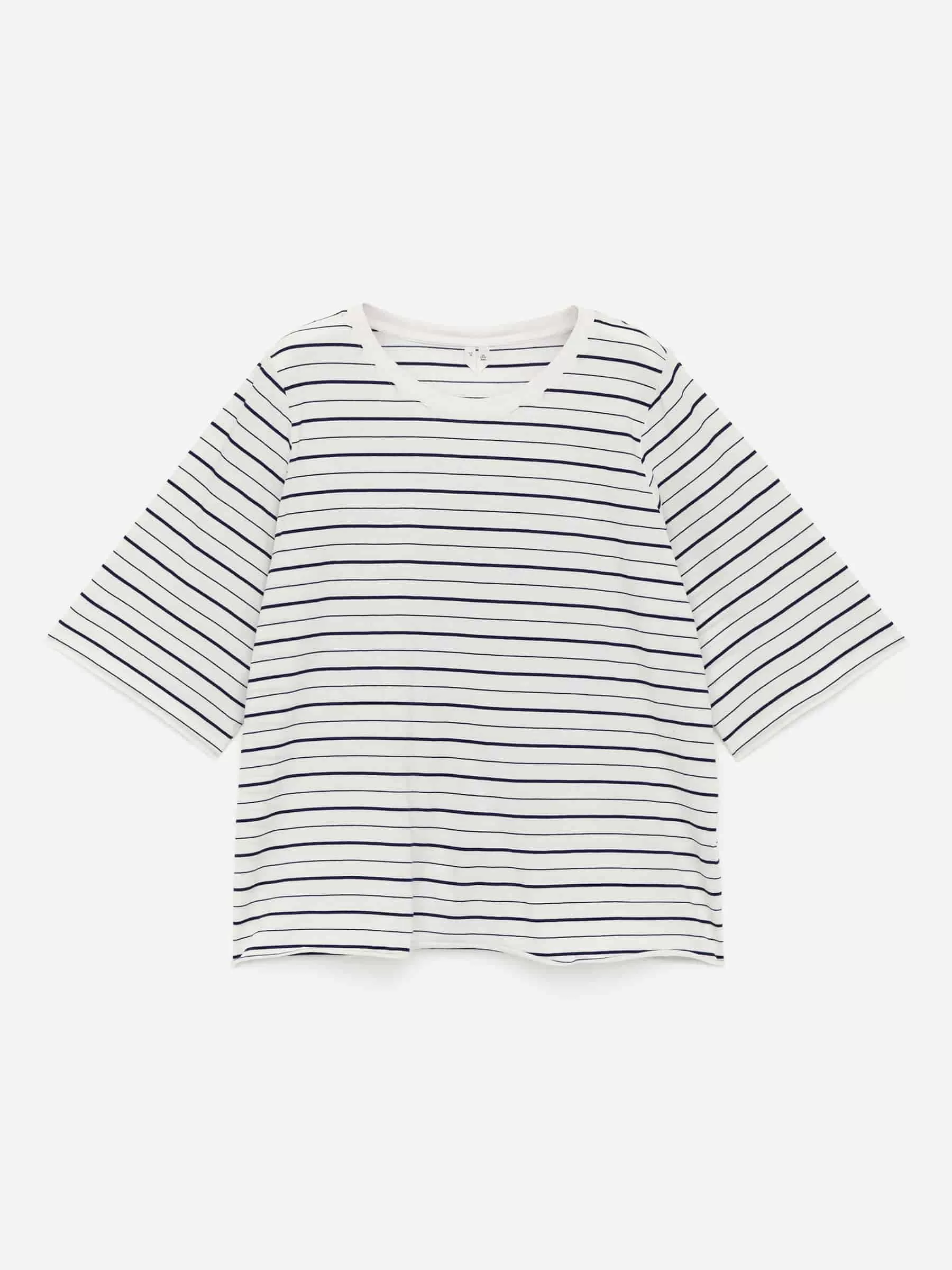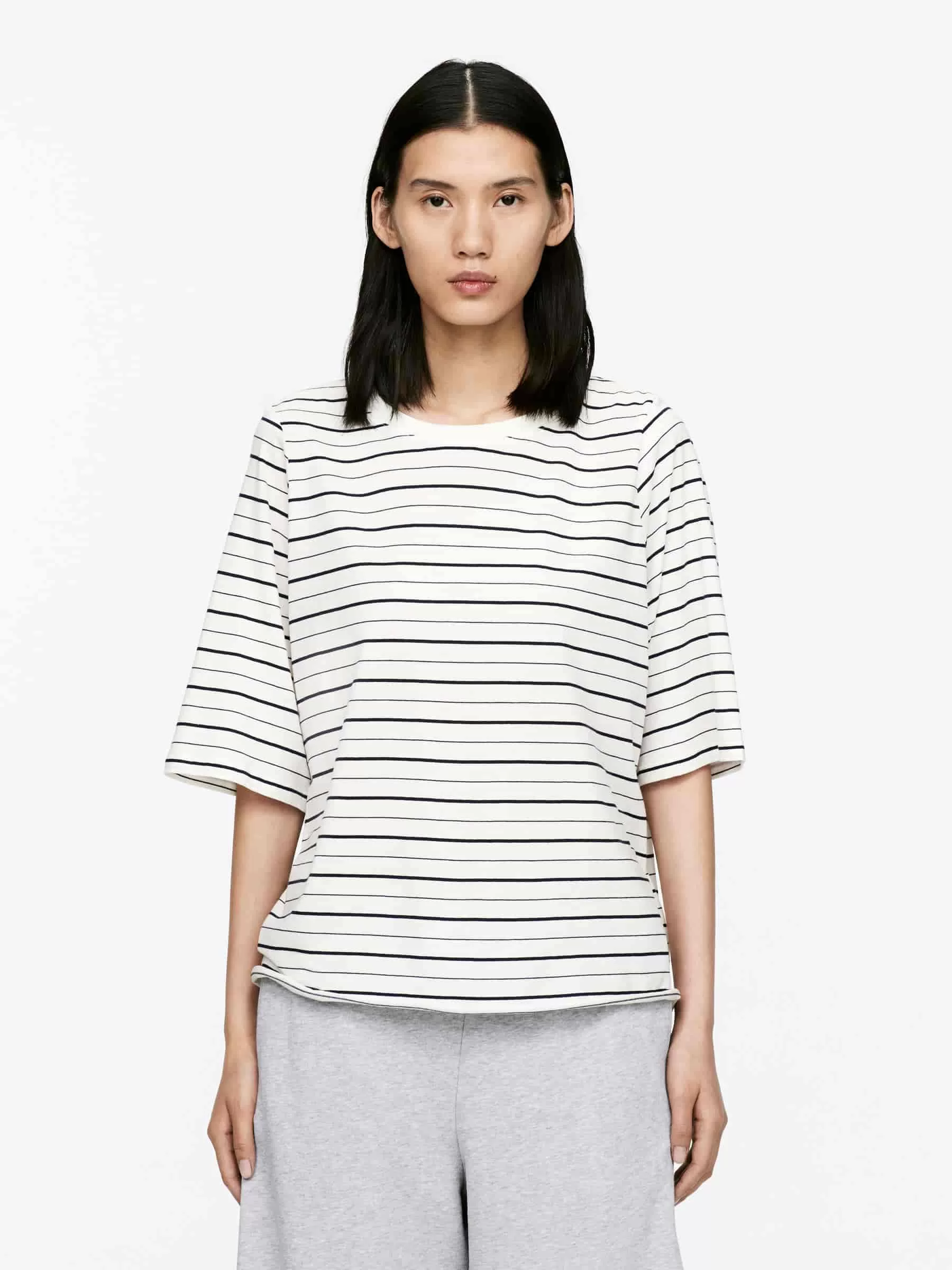 Leichtes T-Shirt mit entspannter Passform und Ärmeln, die bis zu den Ellenbogen reichen. Rohkante am unteren Saum.