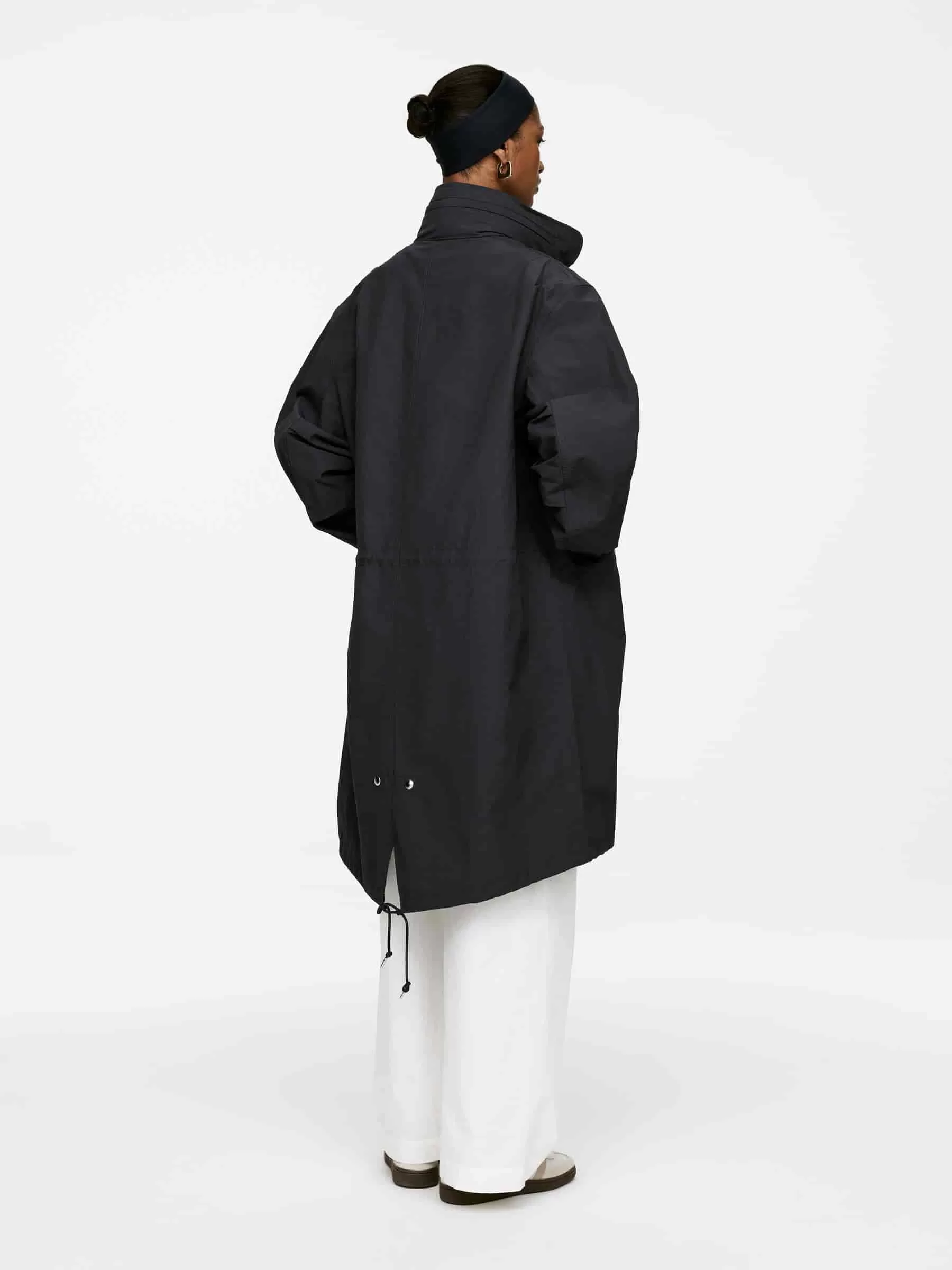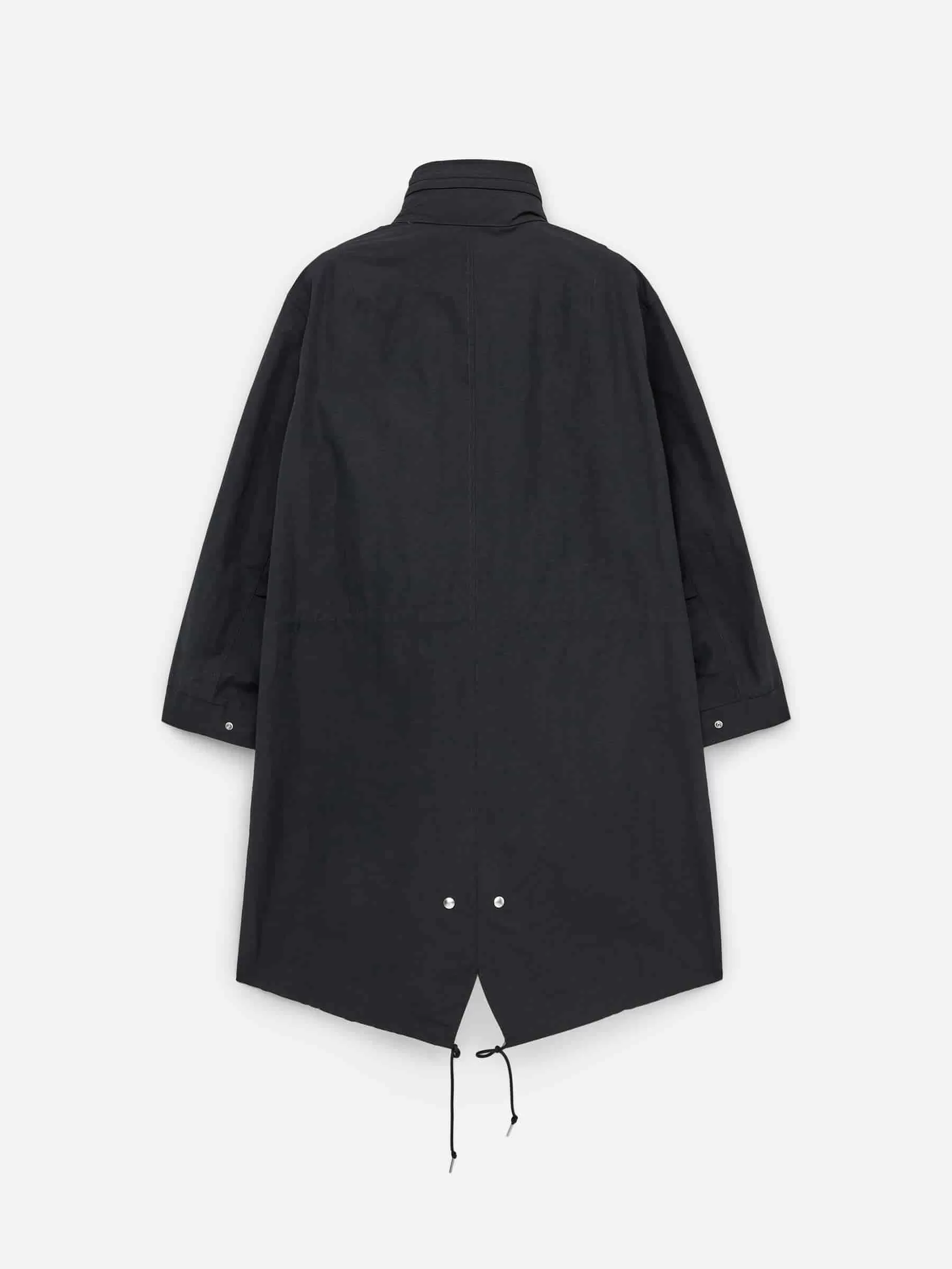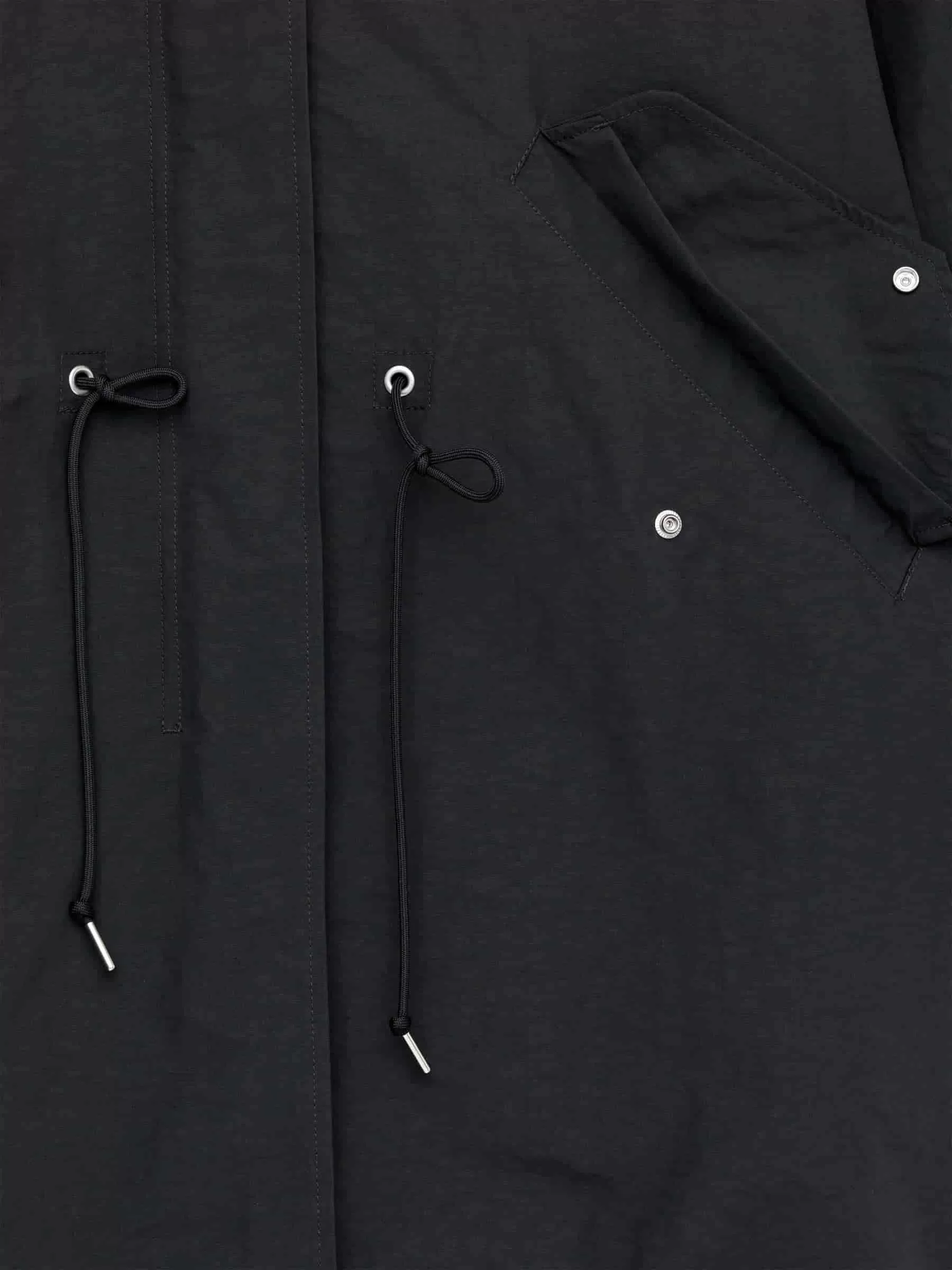 Ungefütterter Parka mit Fischschwanz und hohem Kragen, in dem die Kapuze verstaut ist. Vordere Knopfleiste mit Reißverschluss und verdeckten Druckknöpfen. Schräge Taschen mit verdeckten Druckknöpfen. Kordelzug an der Taille und am unteren Saum.