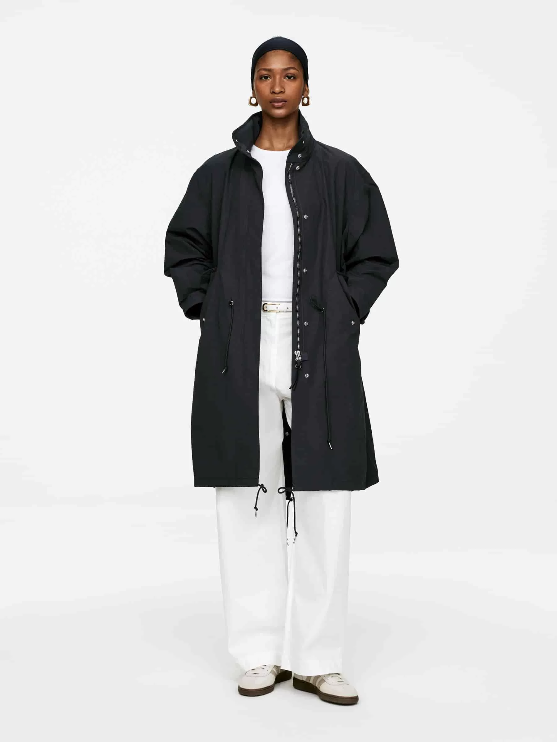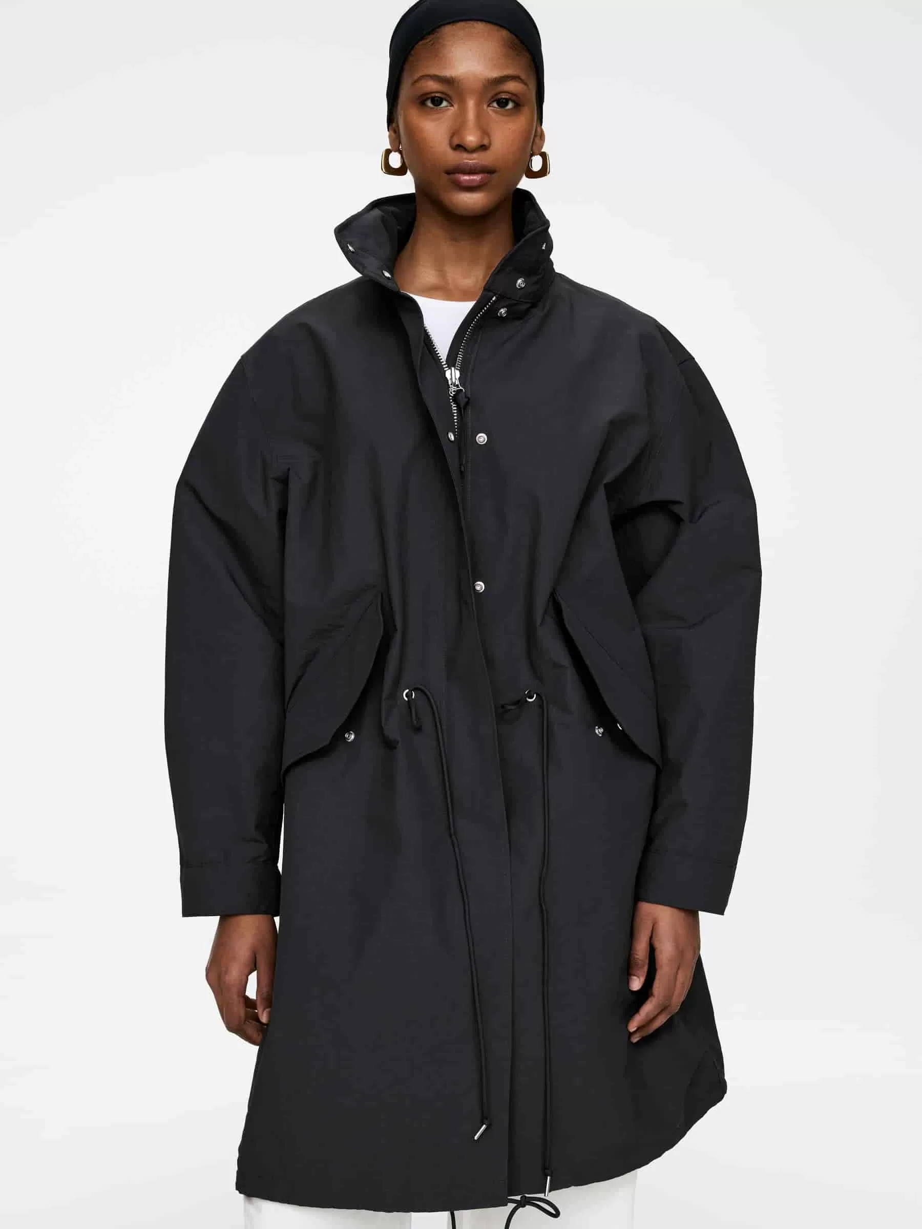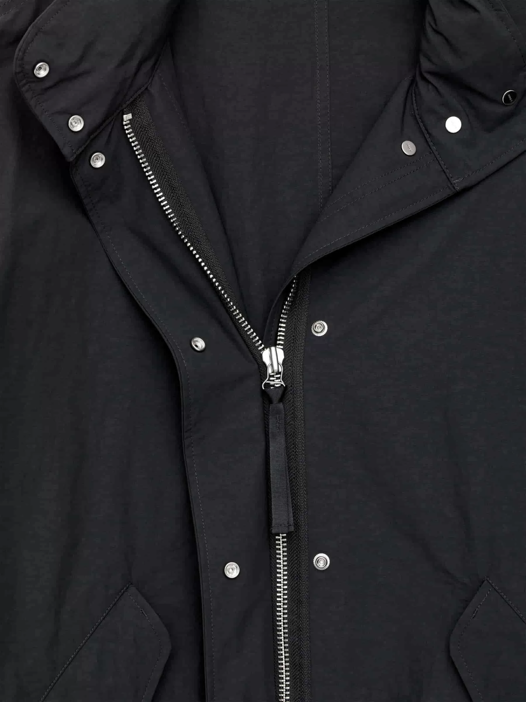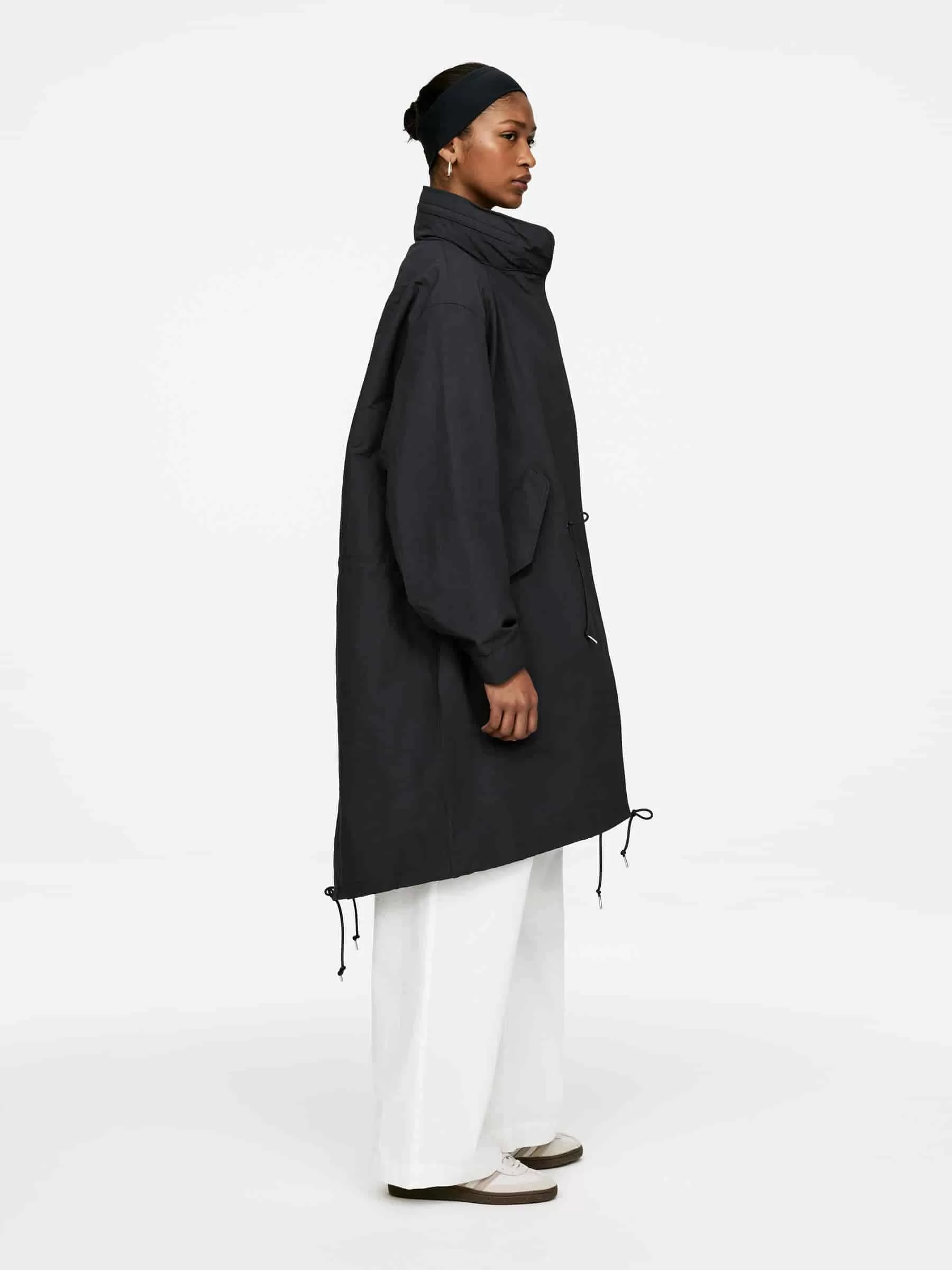 Ungefütterter Parka mit Fischschwanz und hohem Kragen, in dem die Kapuze verstaut ist. Vordere Knopfleiste mit Reißverschluss und verdeckten Druckknöpfen. Schräge Taschen mit verdeckten Druckknöpfen. Kordelzug an der Taille und am unteren Saum.