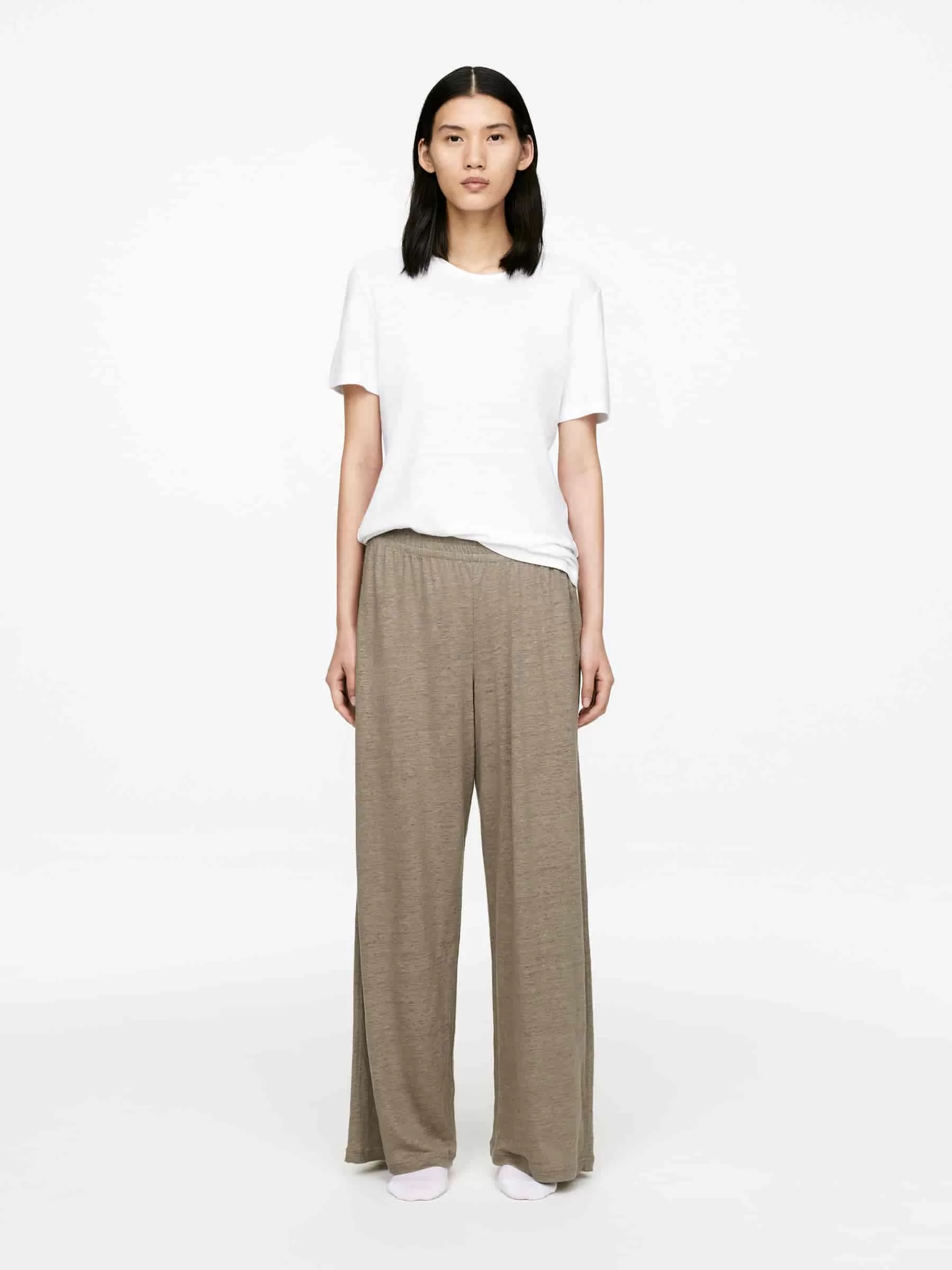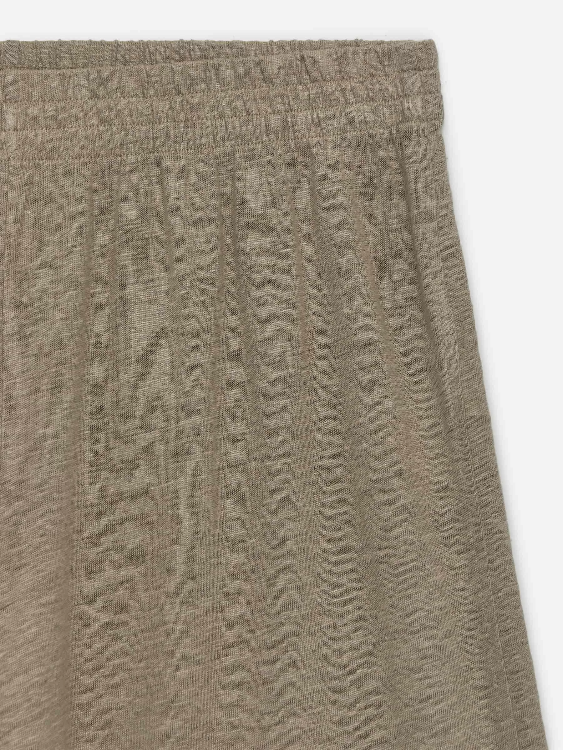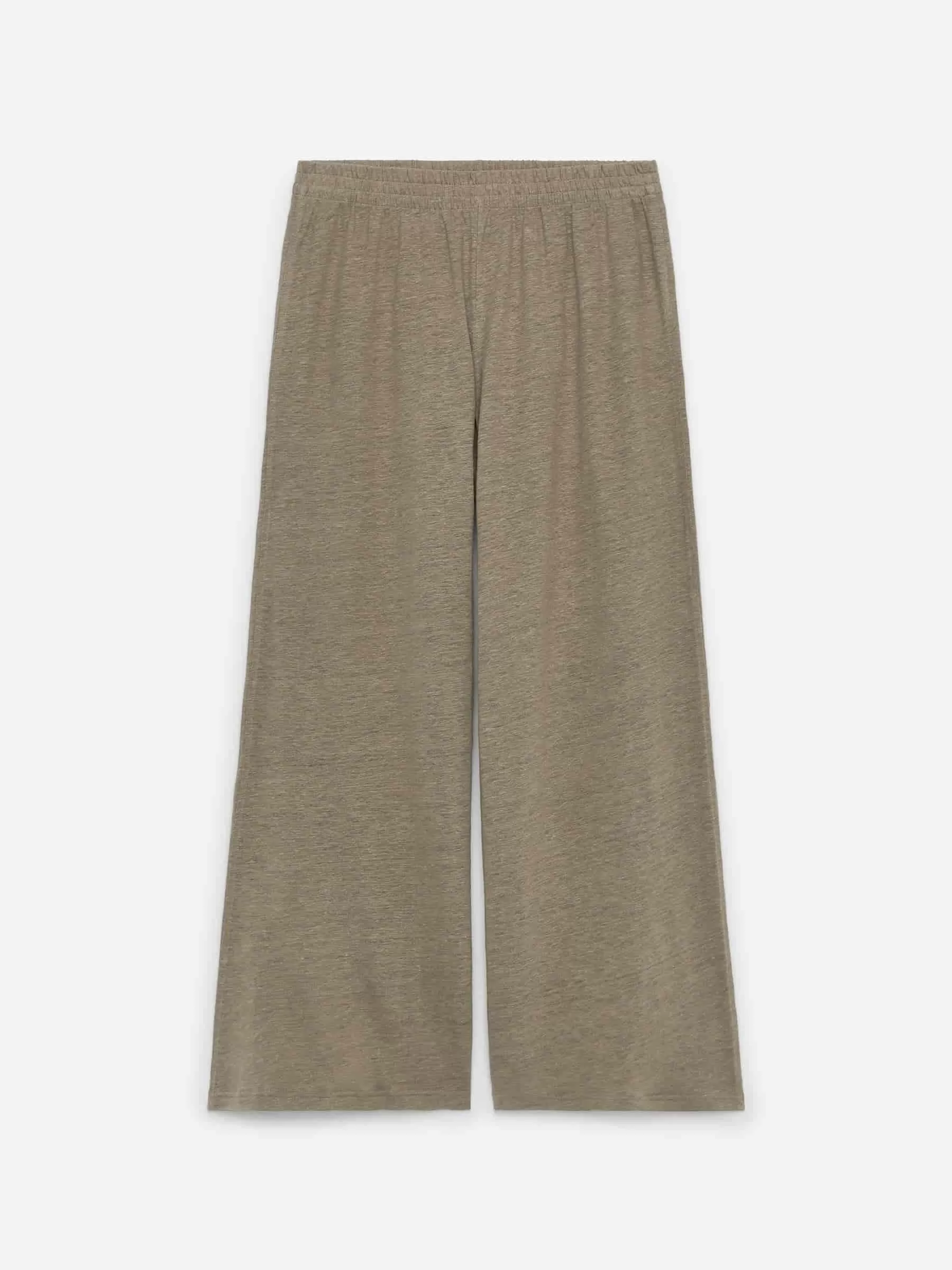 Hose mit weitem Bein aus weichem Leinen-Jersey-Stoff. Dies ist ein mittelhohes Modell mit bequemen Gummizügen in der Taille.