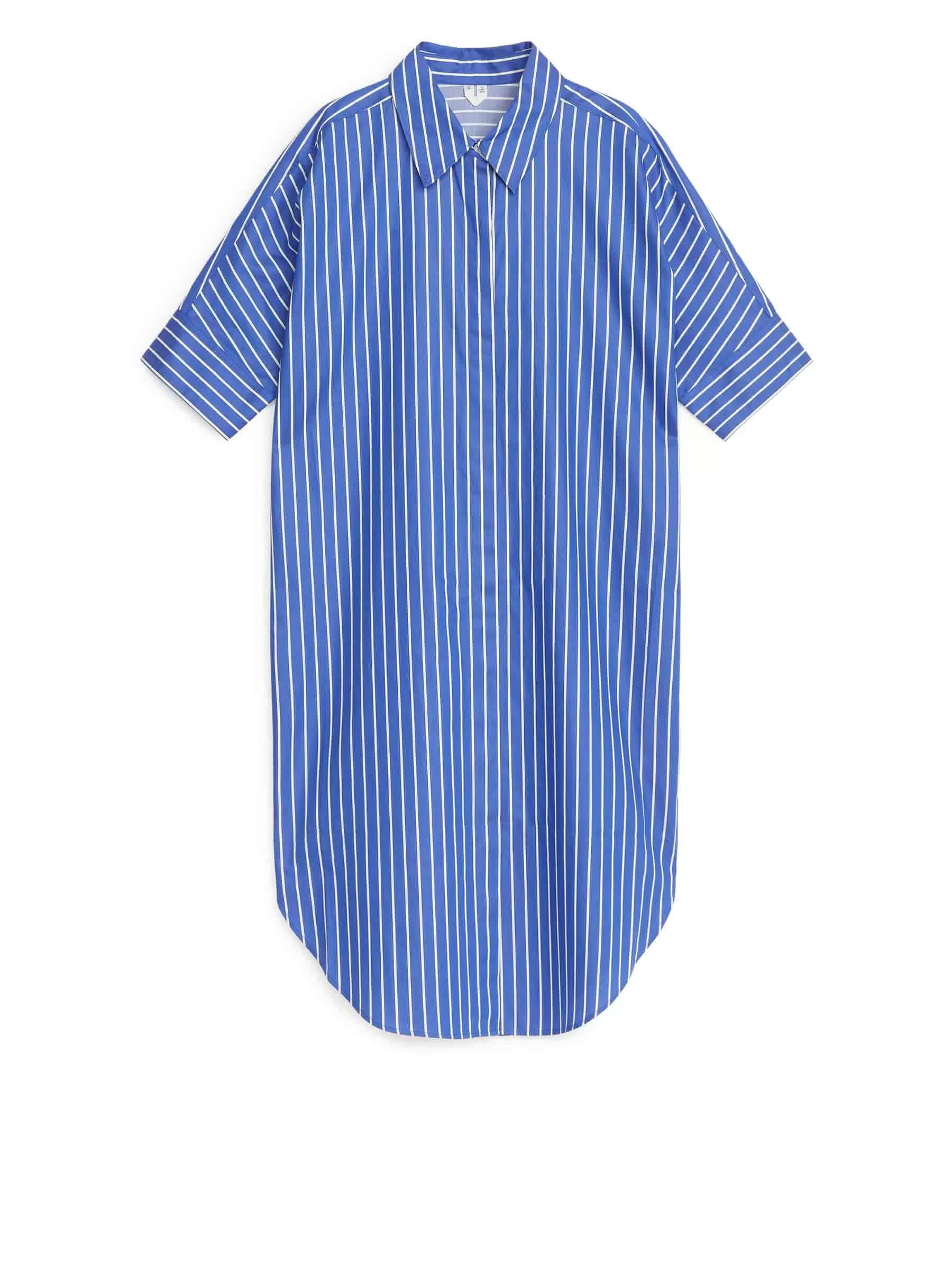 Kurzärmeliges Hemdblusenkleid aus Pima-Baumwolle. Ein übergroßer Stil mit verdeckter Knopfleiste, Hemdkragen und Hemdmanschetten mit Knopfverschluss. Doppellagige Rückenpasse mit Kellerfalte.