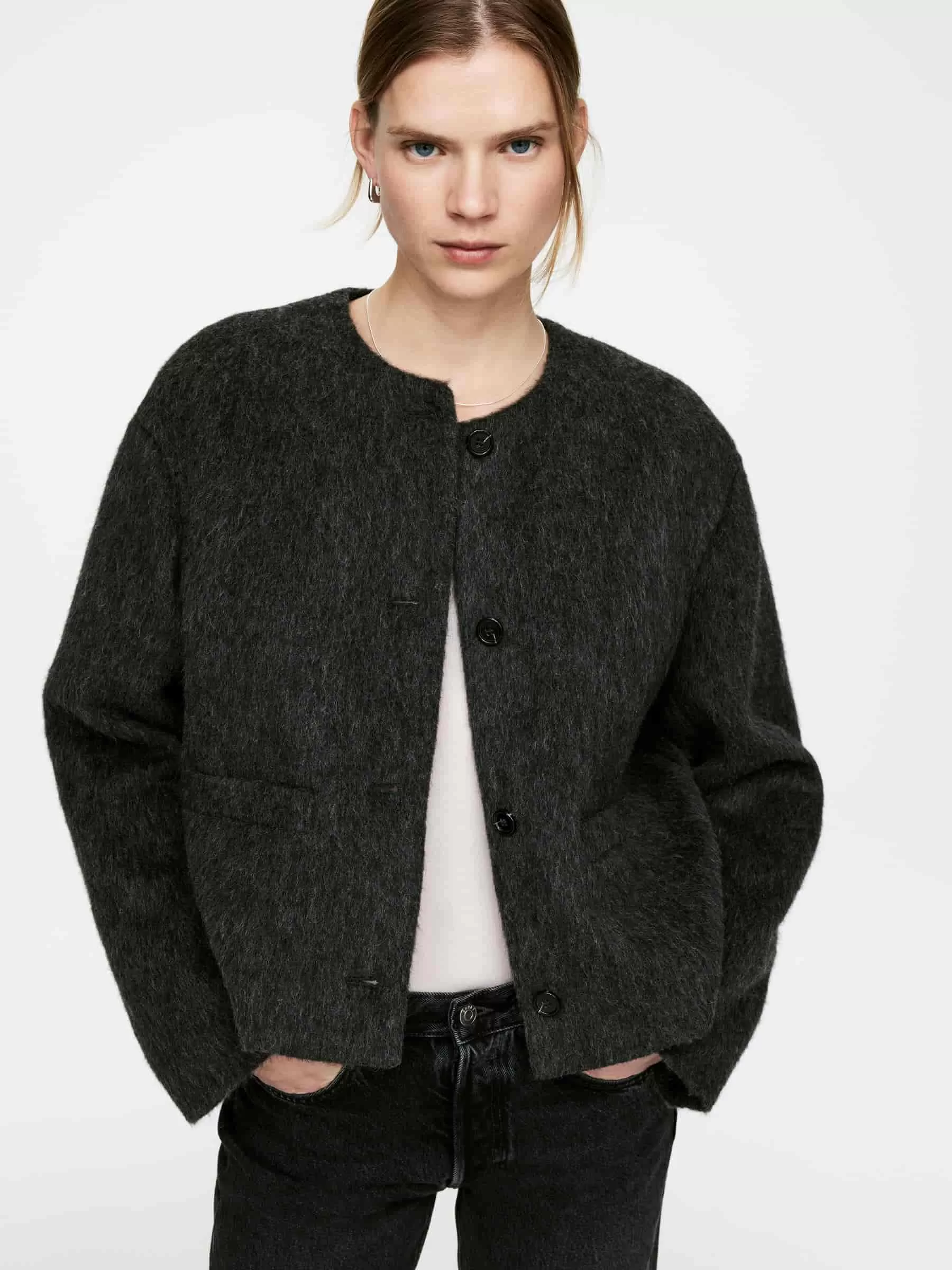 Einreihige Jacke aus einer gebürsteten Wollmischung. Ein gefütterter Stil mit Knopfverschluss, Vordertaschen und normaler Passform.