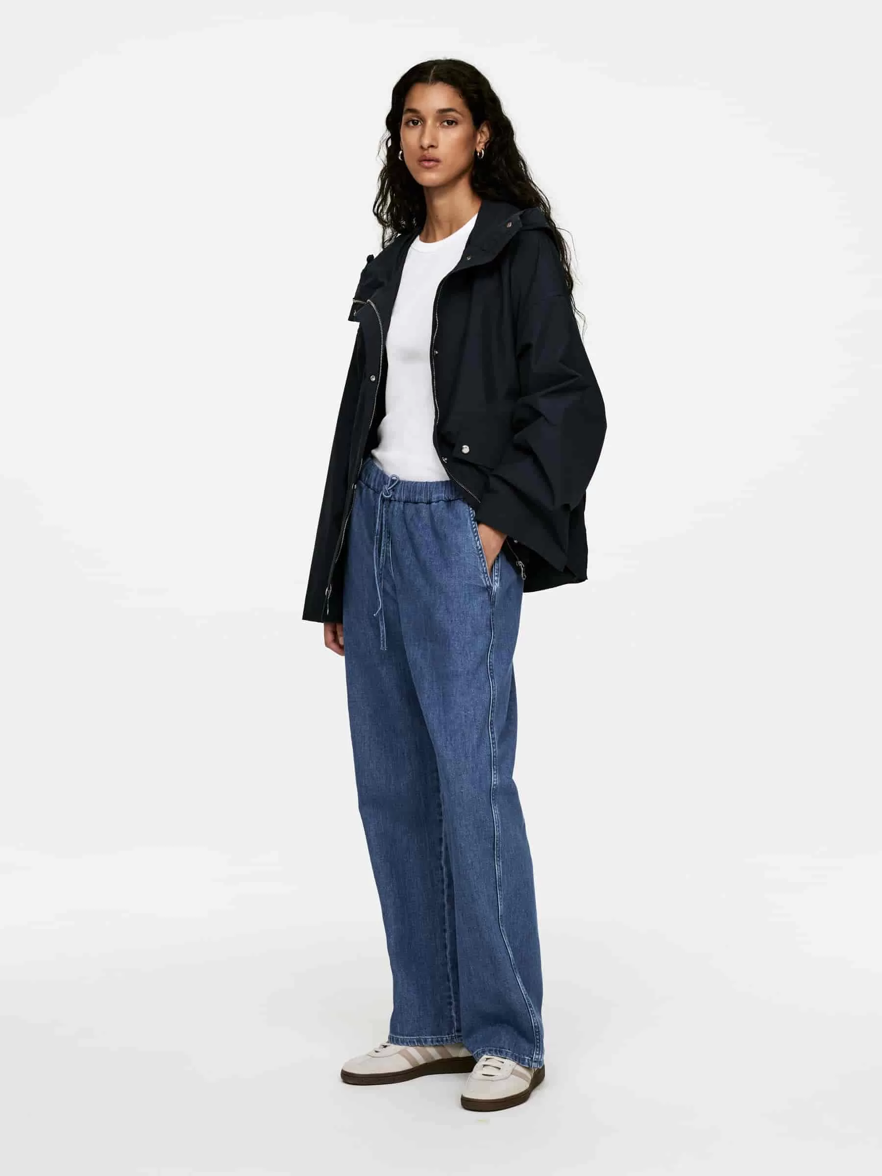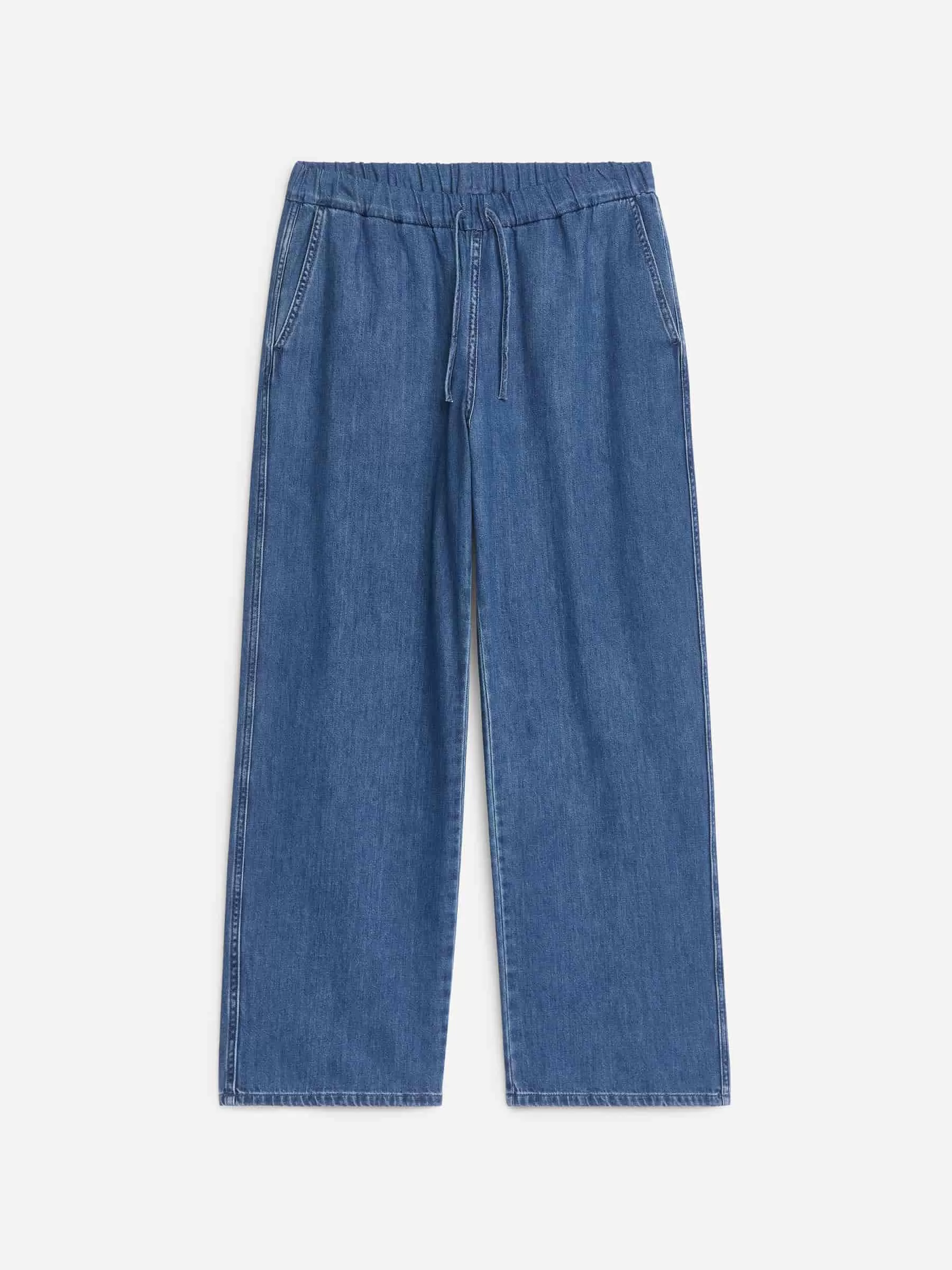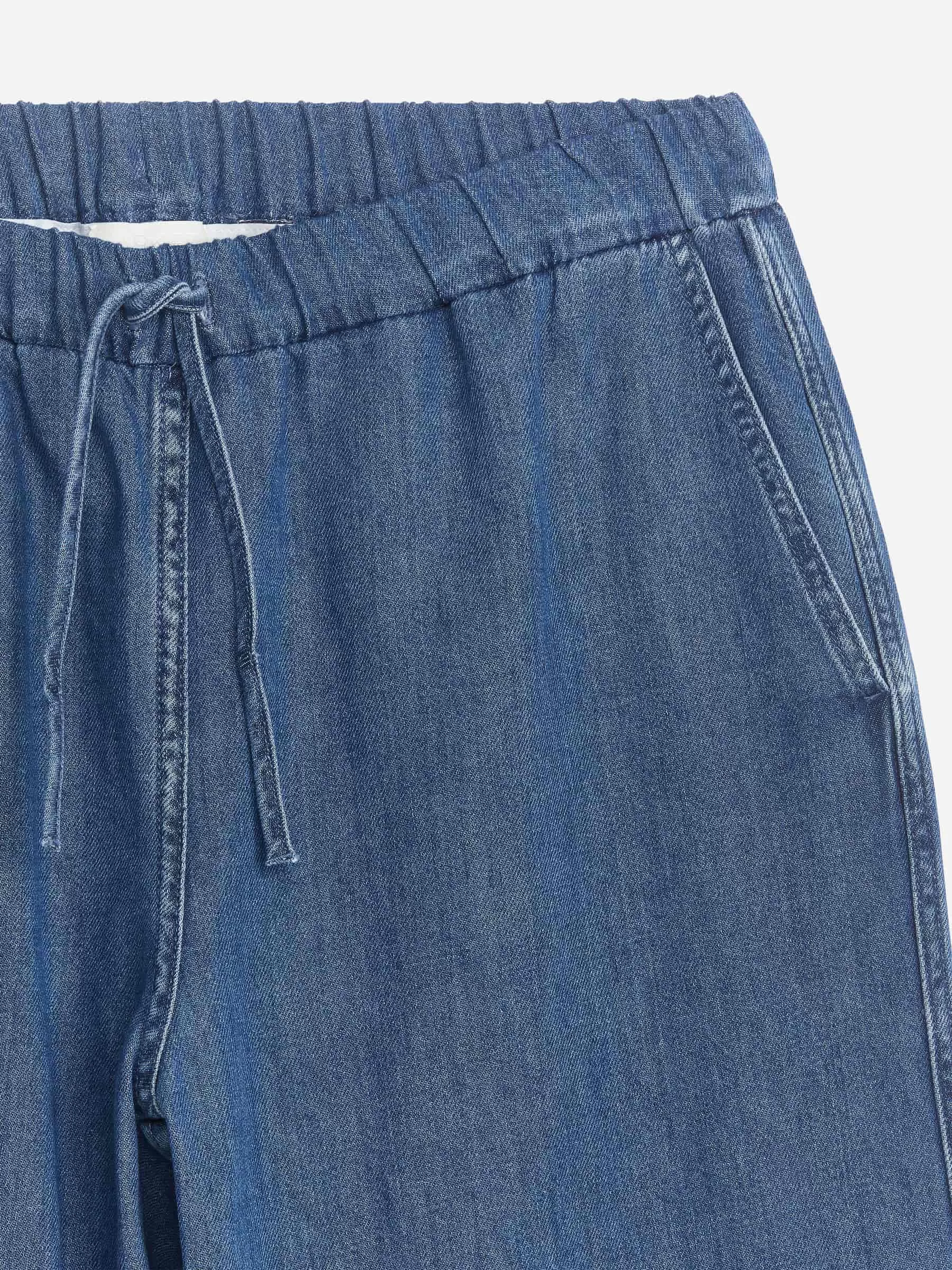 Jeanshose aus weichem Baumwollgewebe. Dies ist ein nicht dehnbarer Stil mit Gummizügen und Kordelzug in der Taille und Taschen an den Seitennähten.