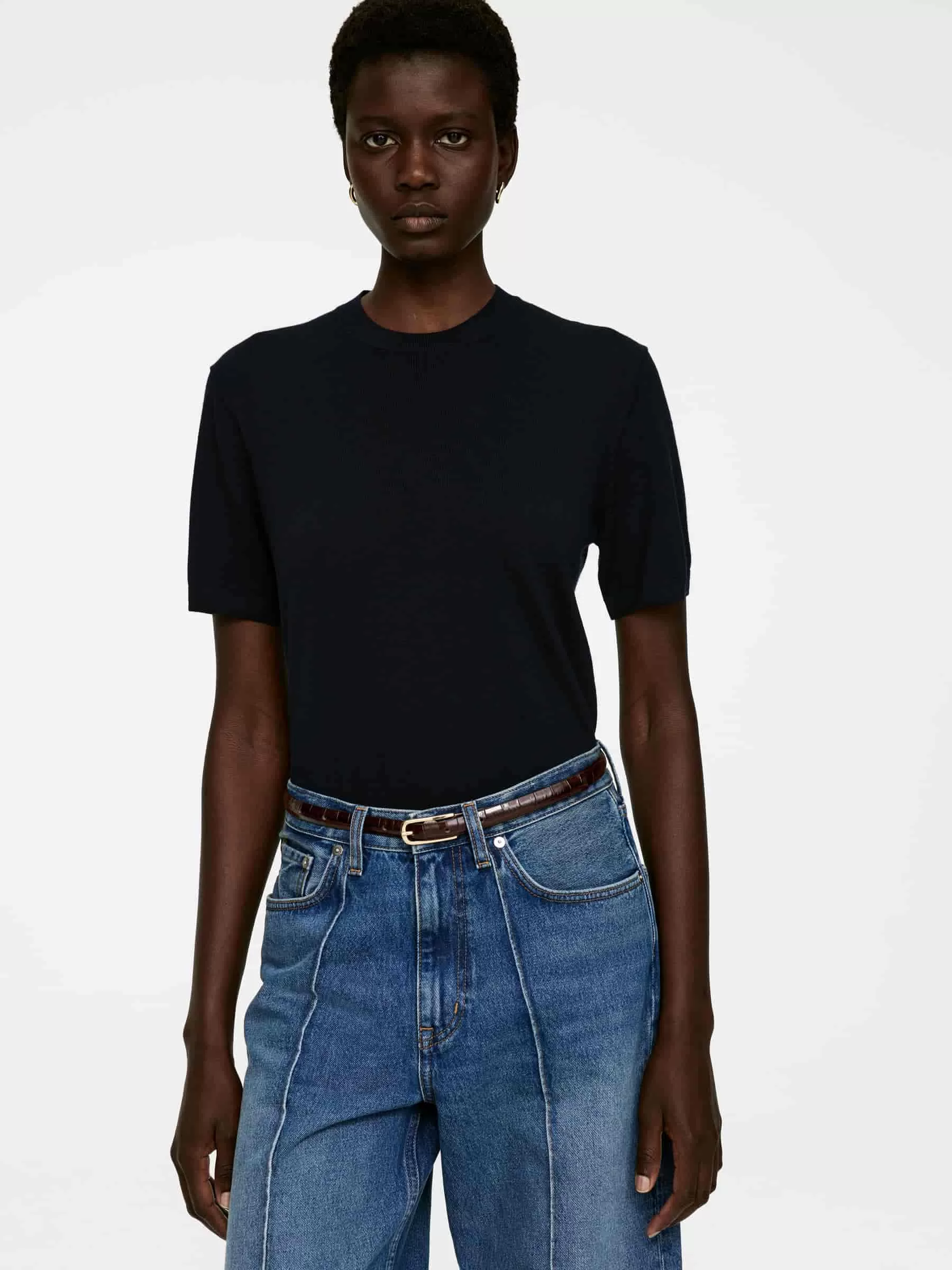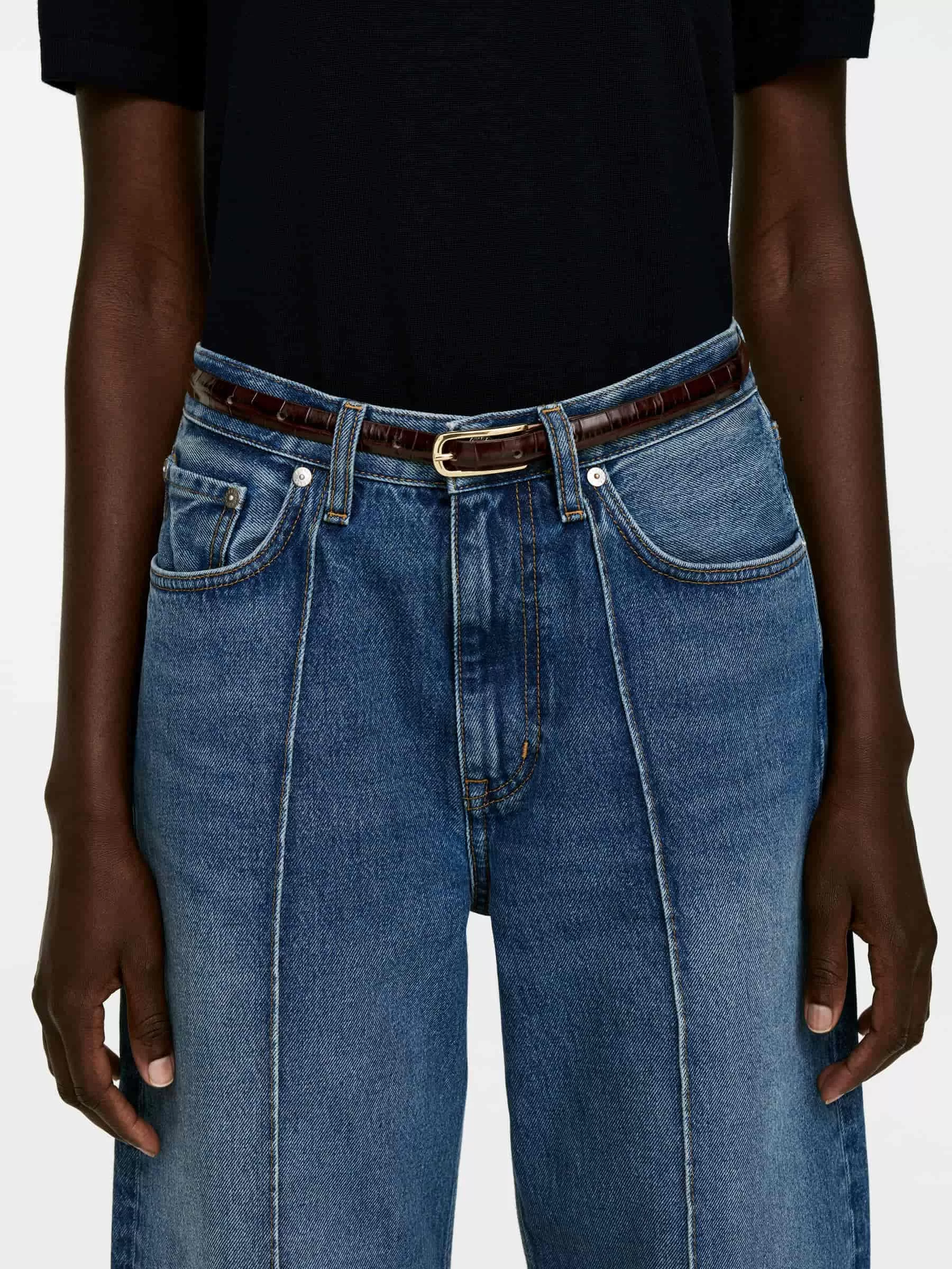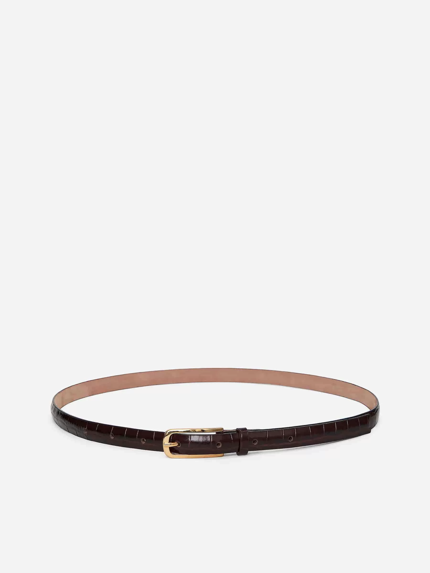 Schmaler Gürtel aus Leder mit geprägtem Krokomuster. Vergoldete Schnalle mit halbrunden Ecken. Breite 1,5 cm.