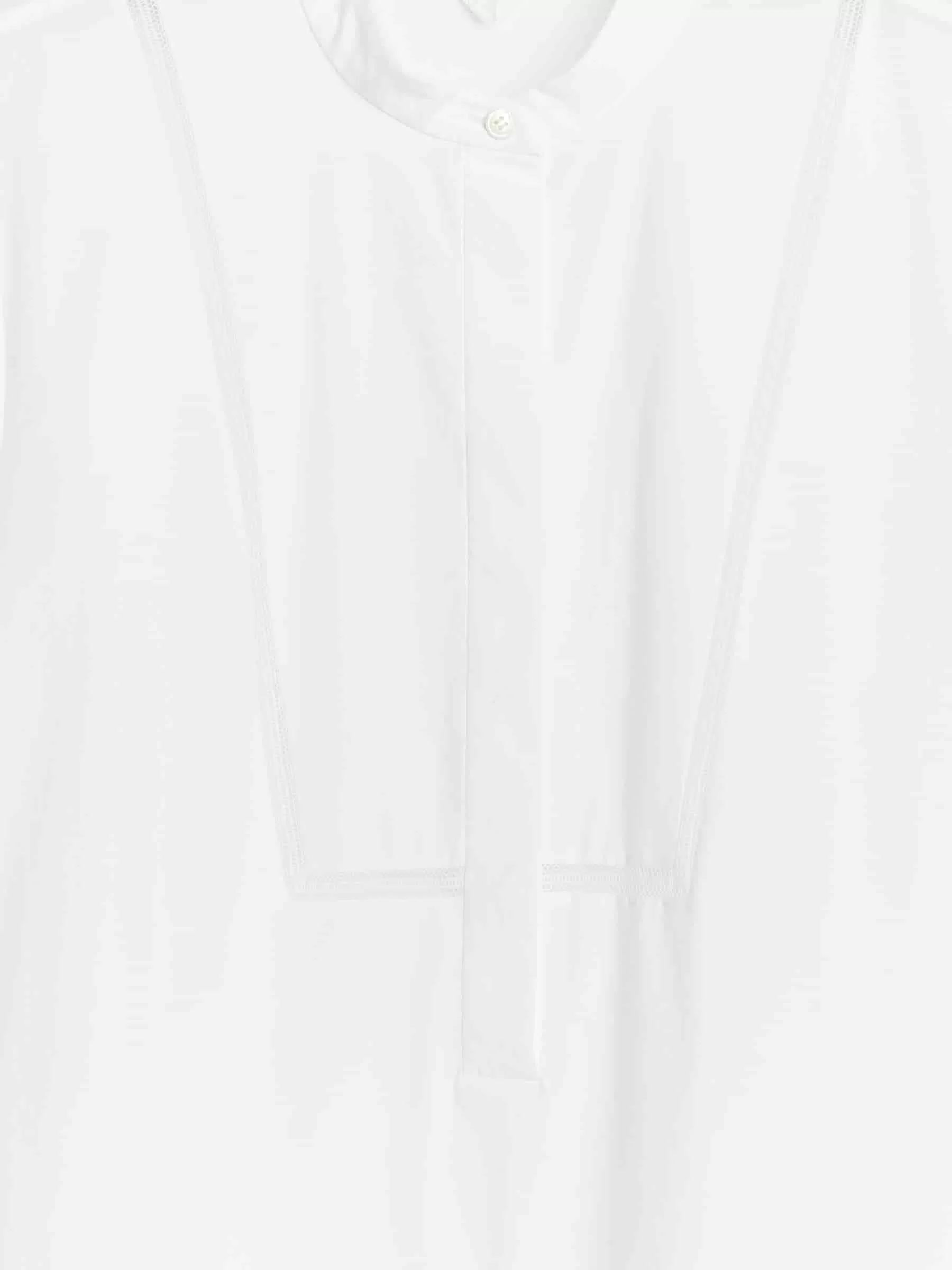 Kurzärmelige Tunika aus Pima-Baumwolle. Dieses Modell hat eine normale Passform und verfügt über einen Stehkragen, eine geknöpfte halbe Knopfleiste und Spitzenbanddetails.