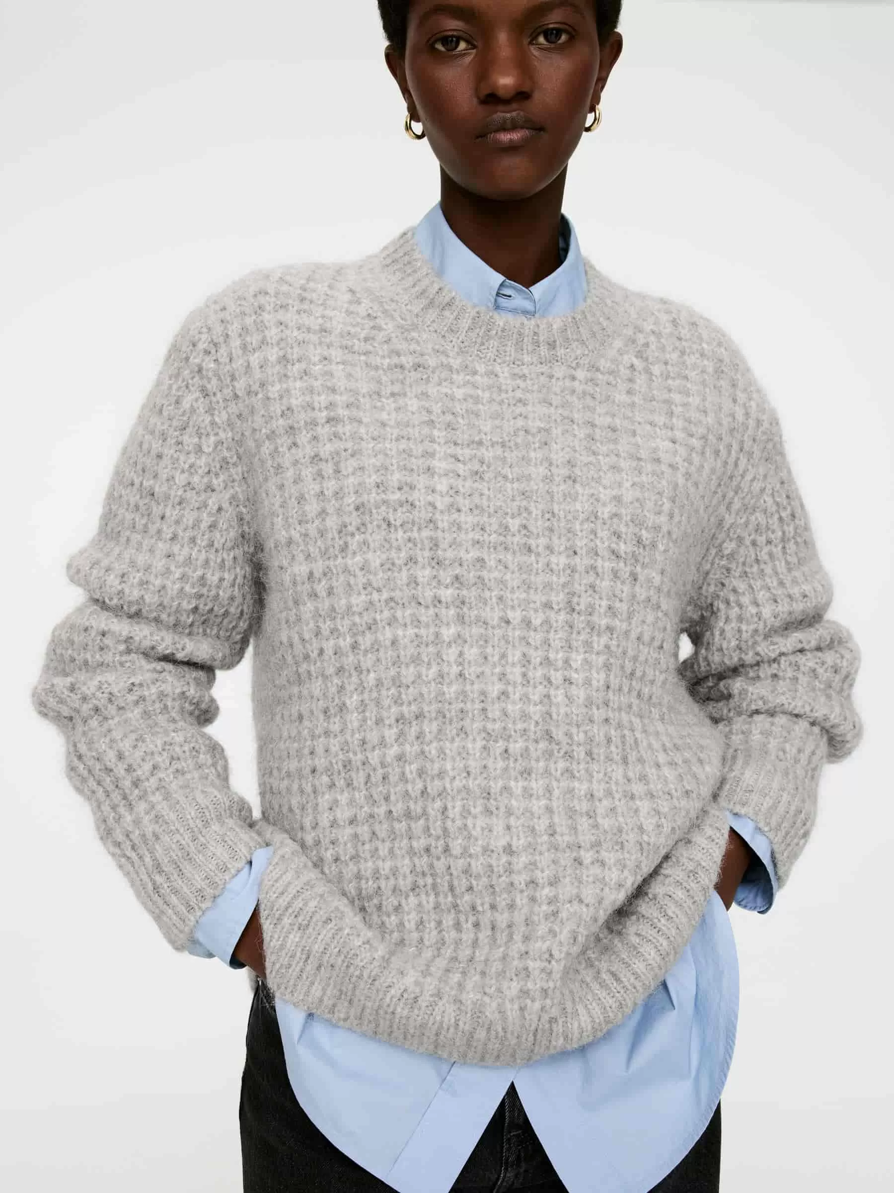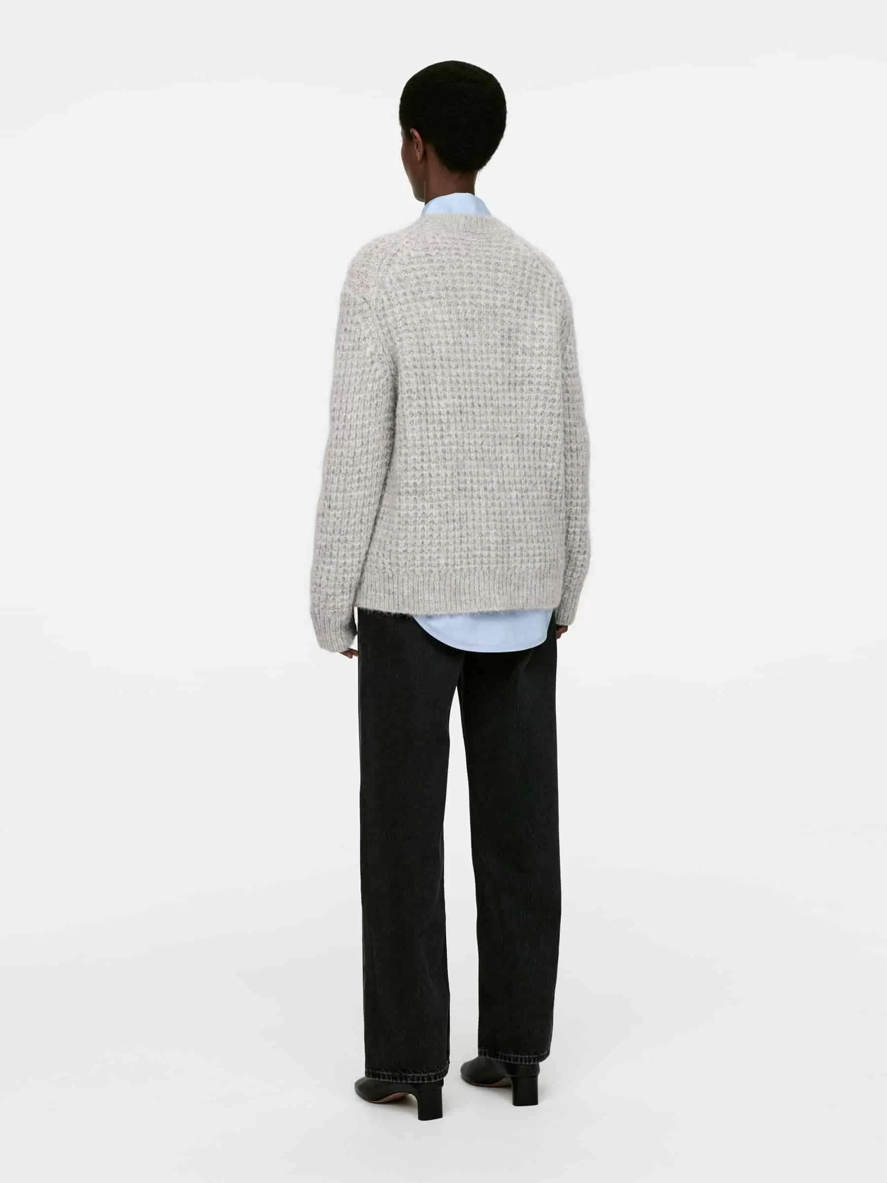 Pullover mit Rundhalsausschnitt aus einer Woll-Alpaka-Mischung im halben Cardigan-Stich. Gerippte Abschlüsse. Entspannte Passform. Dieser Stil besteht aus 44 % RAS-Alpaka und 56 % RWS-Wolle (TE-00047206). Produkte, die nach dem Responsible Wool Standard (RWS) und dem Responsible Alpaca Standard (RAS) zertifiziert sind, enthalten Wolle und Alpakafasern von Farmen, die unabhängig nach Tierschutz- und Landmanagementanforderungen zertifiziert sind.