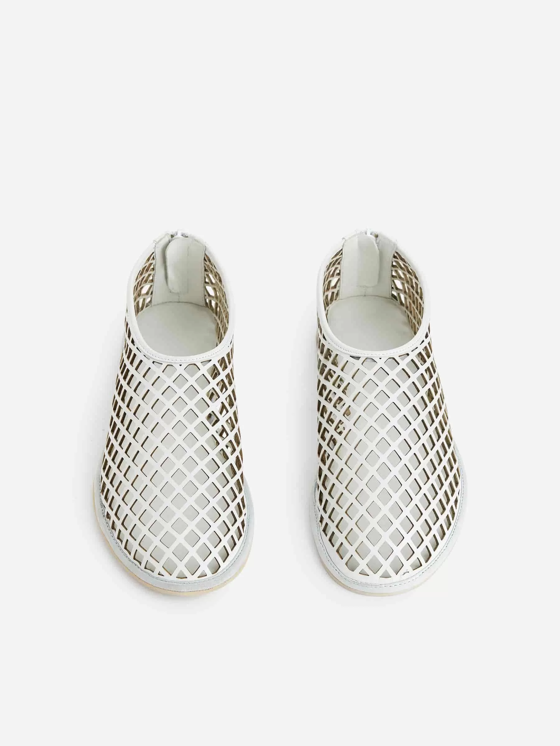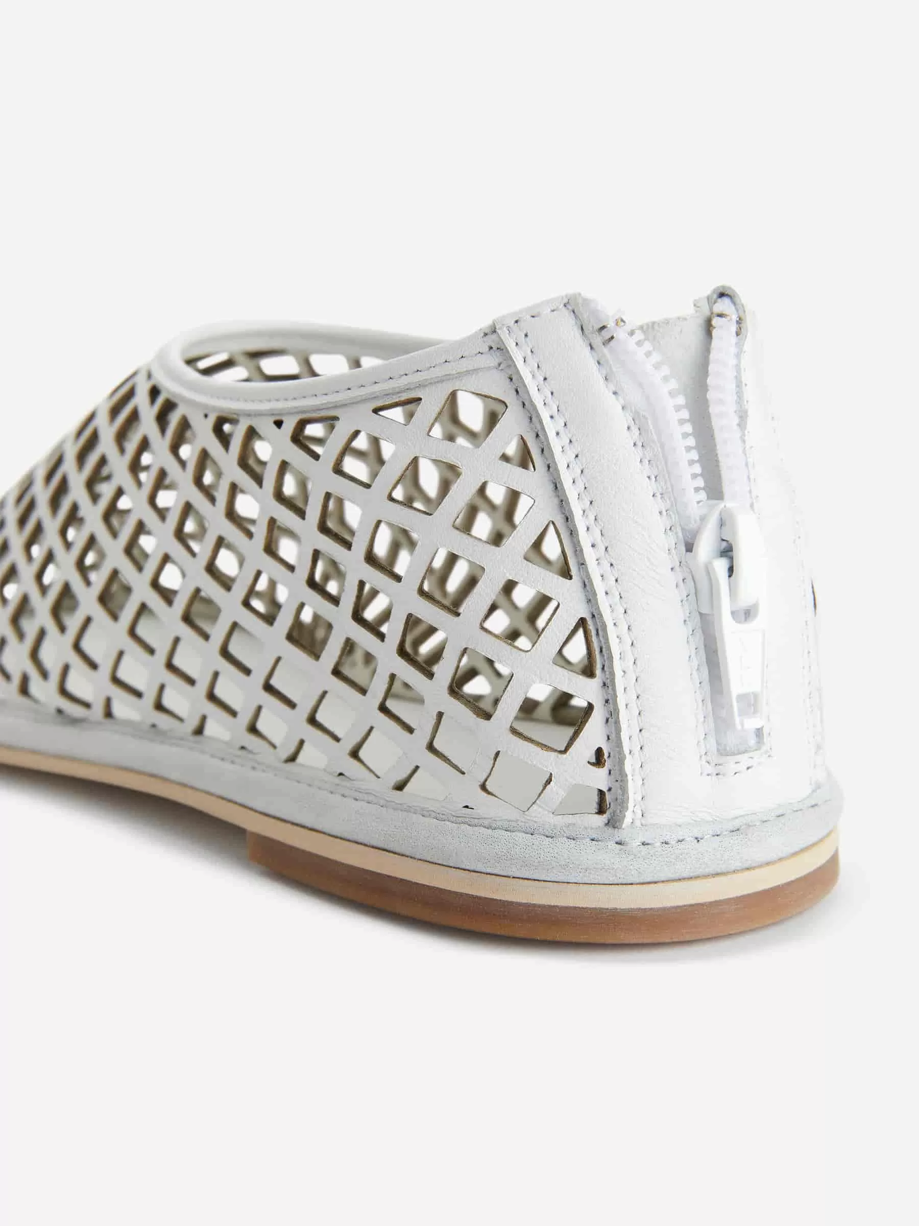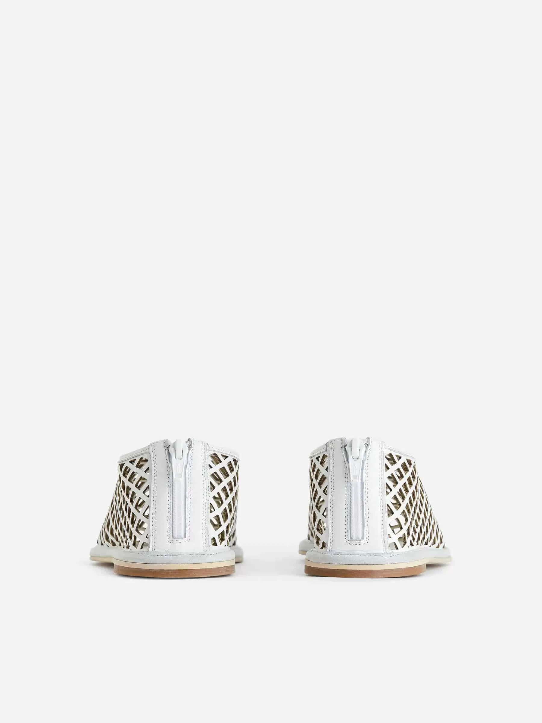 Slipper aus Leder mit Käfig-Obermaterial. Mit dünner Sohle und Reißverschluss hinten in der Mitte.