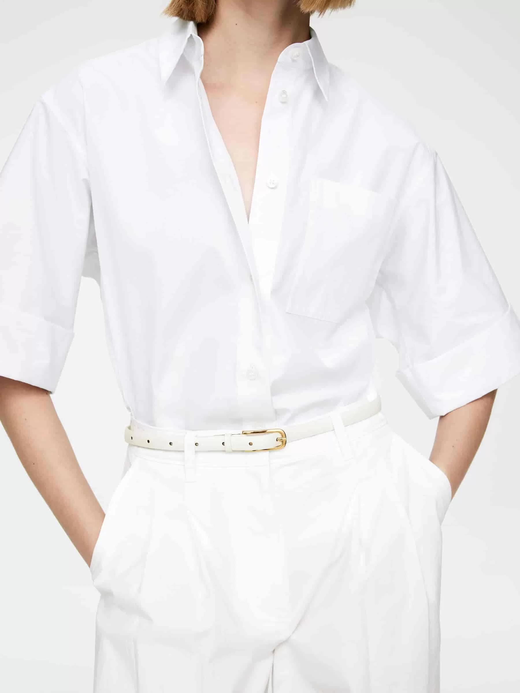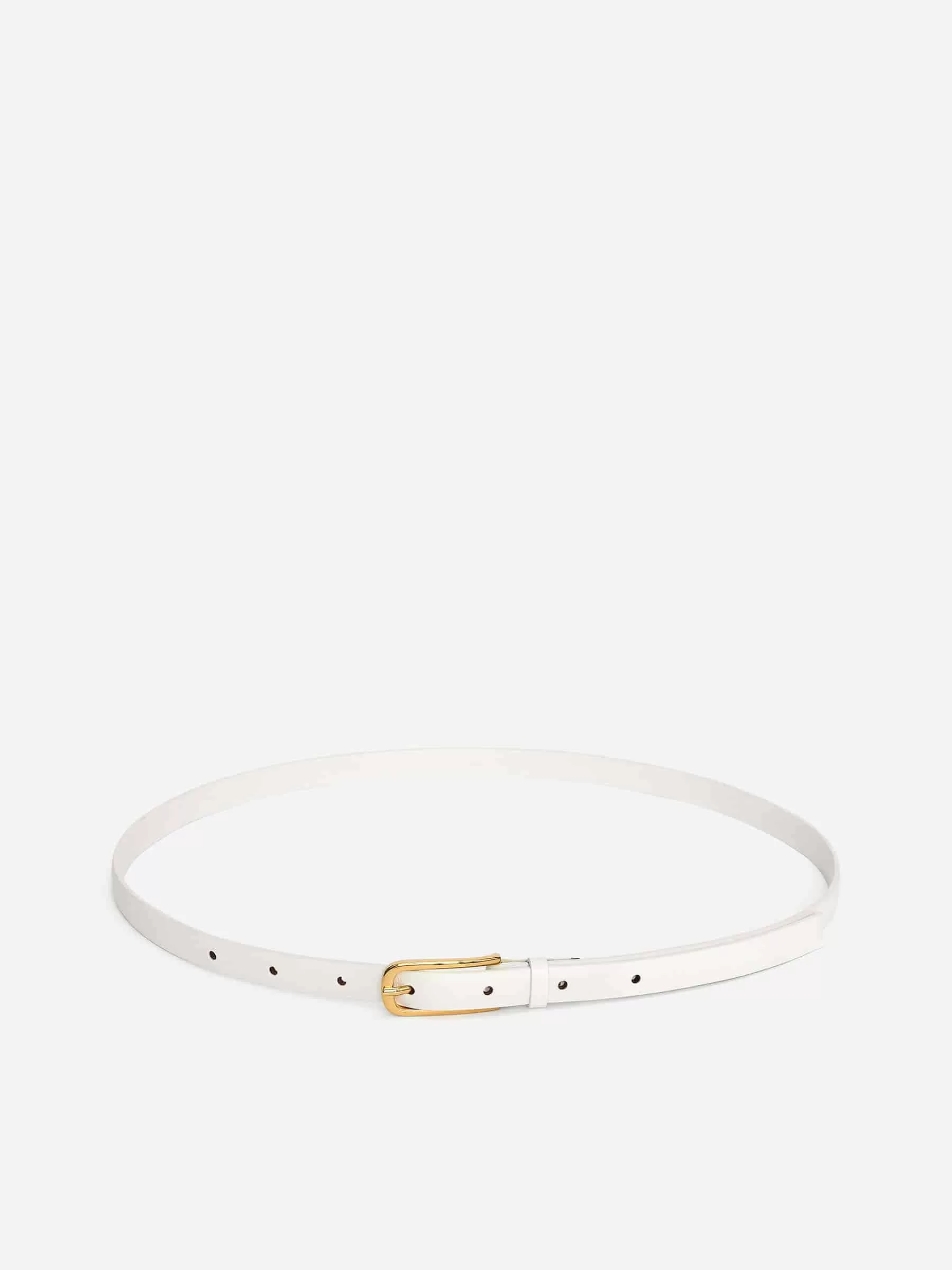 Schmaler Gürtel aus chromfreiem Leder. Vergoldete Schnalle mit halbrunden Ecken. Breite 1,5 cm.