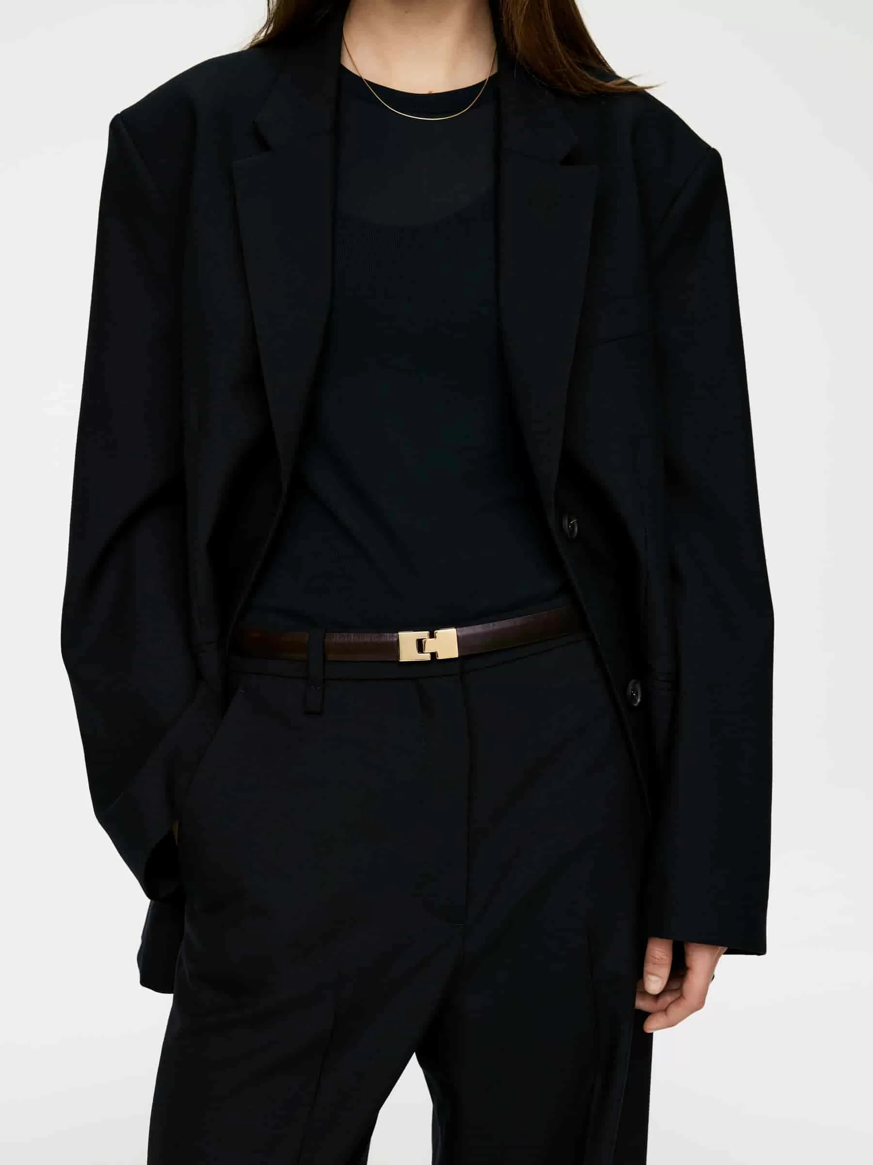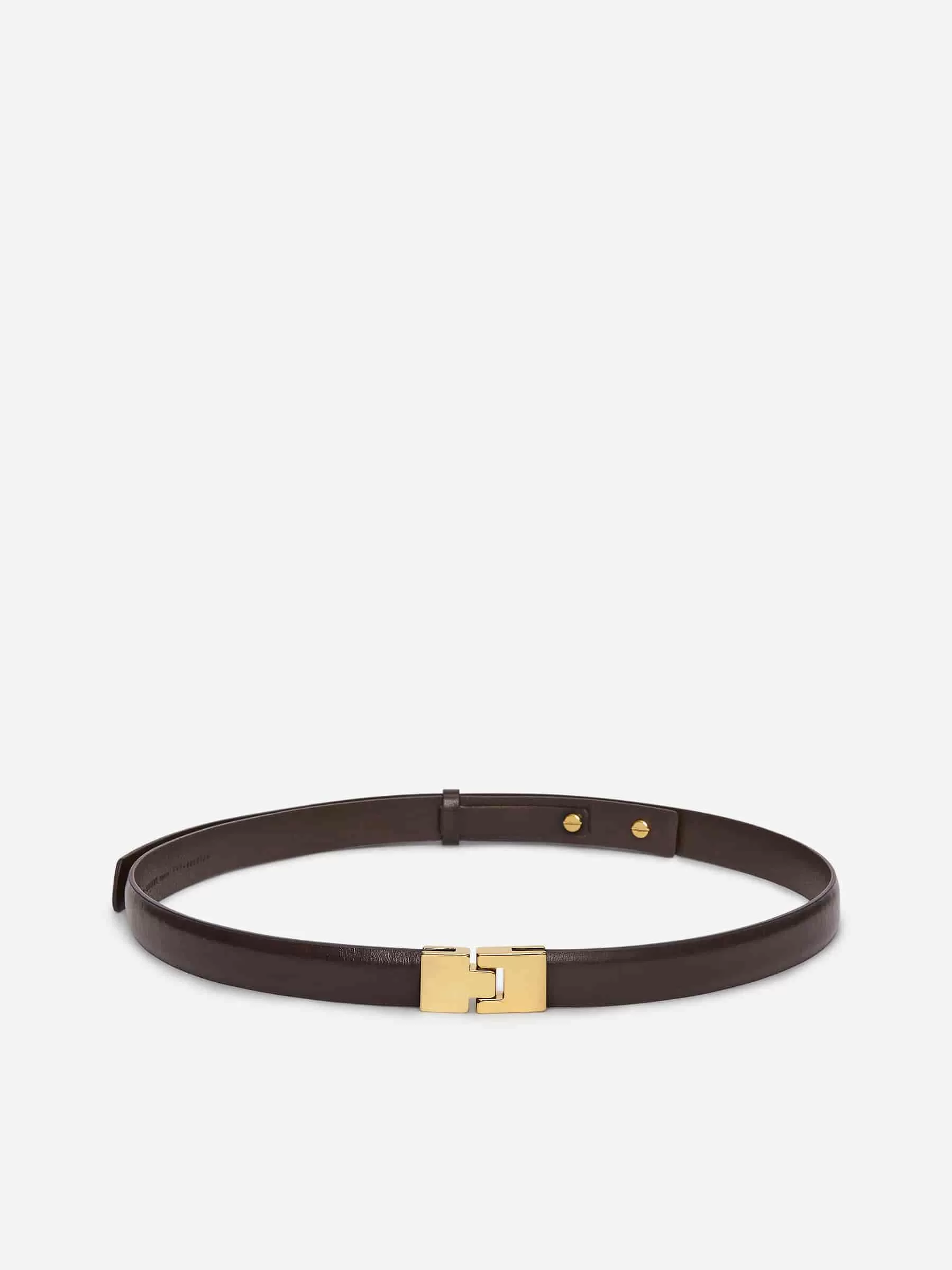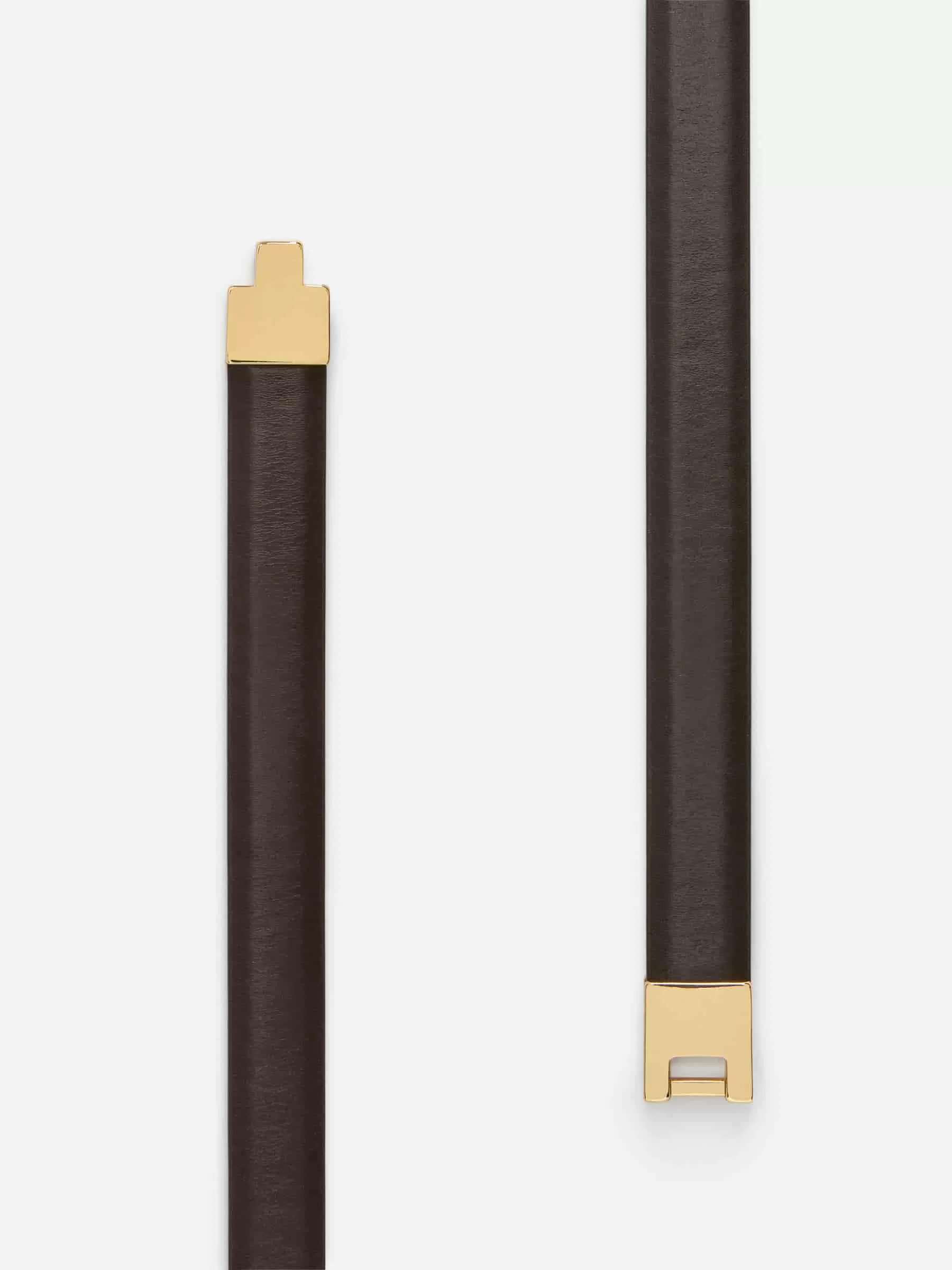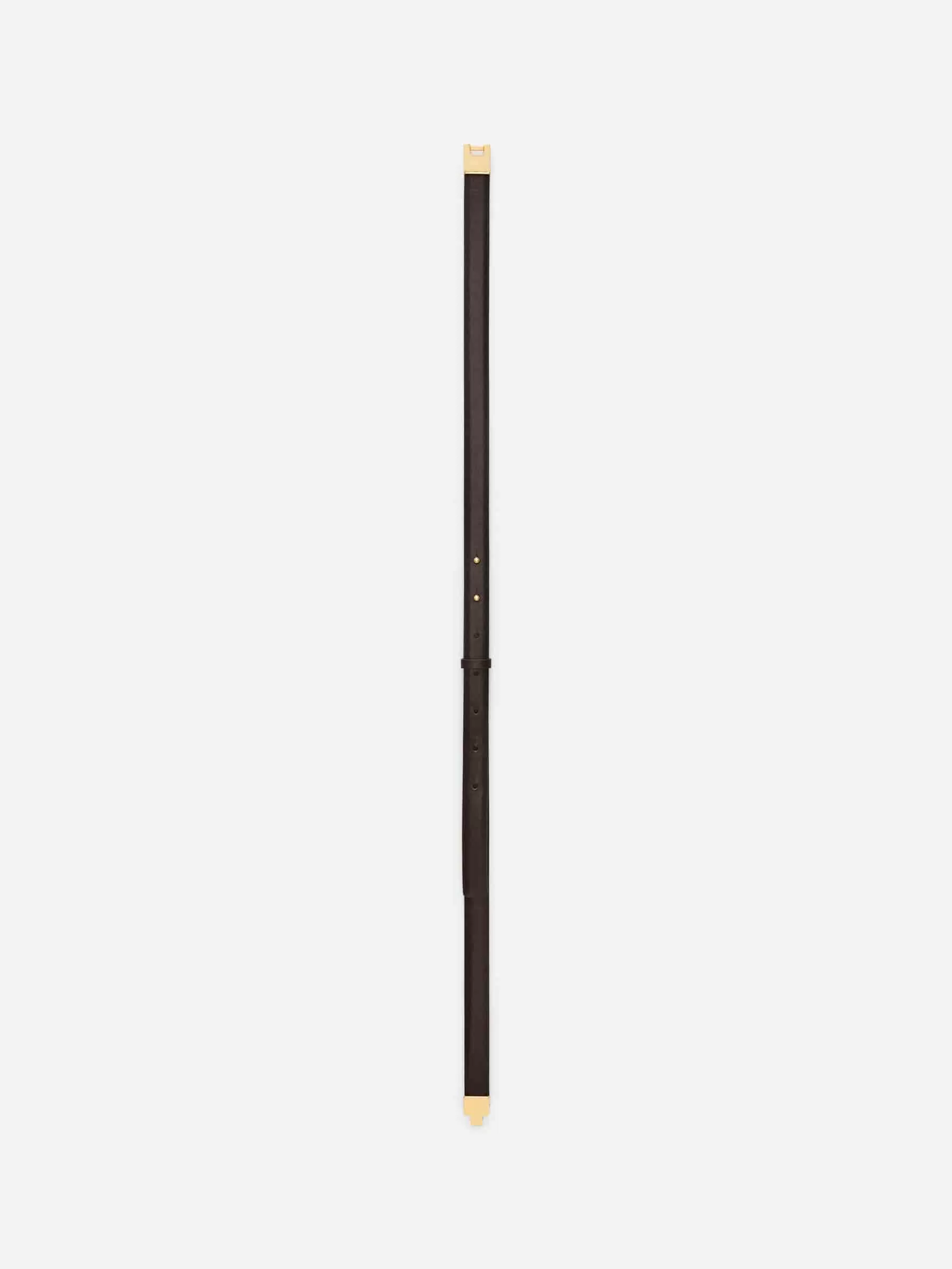 Schmaler Hüftgürtel mit dekorativer vergoldeter quadratischer Schnalle vorne. Verstellbarer Druckknopfverschluss hinten. XS/S 105,5 cm, M/L 116,5 cm.