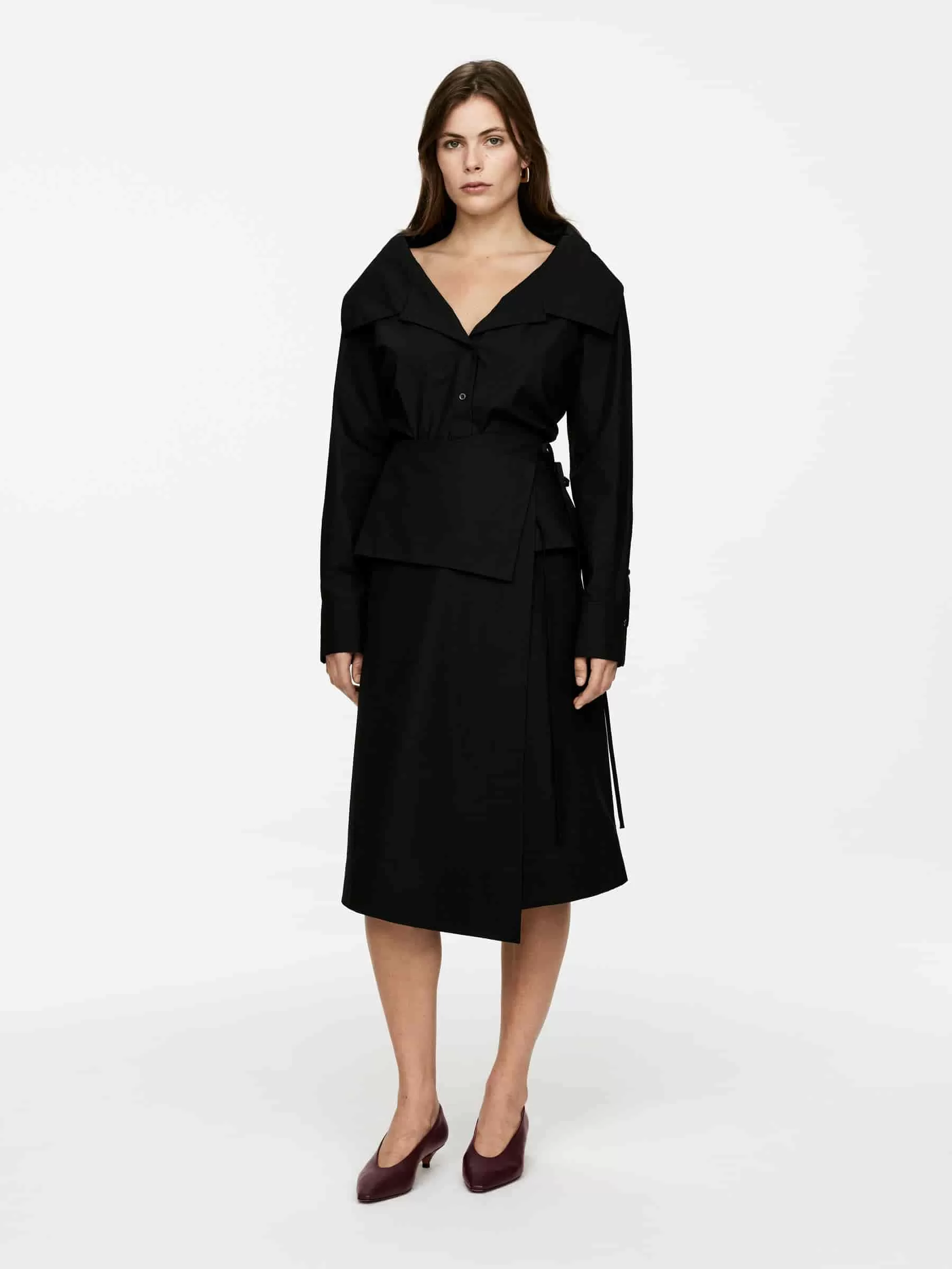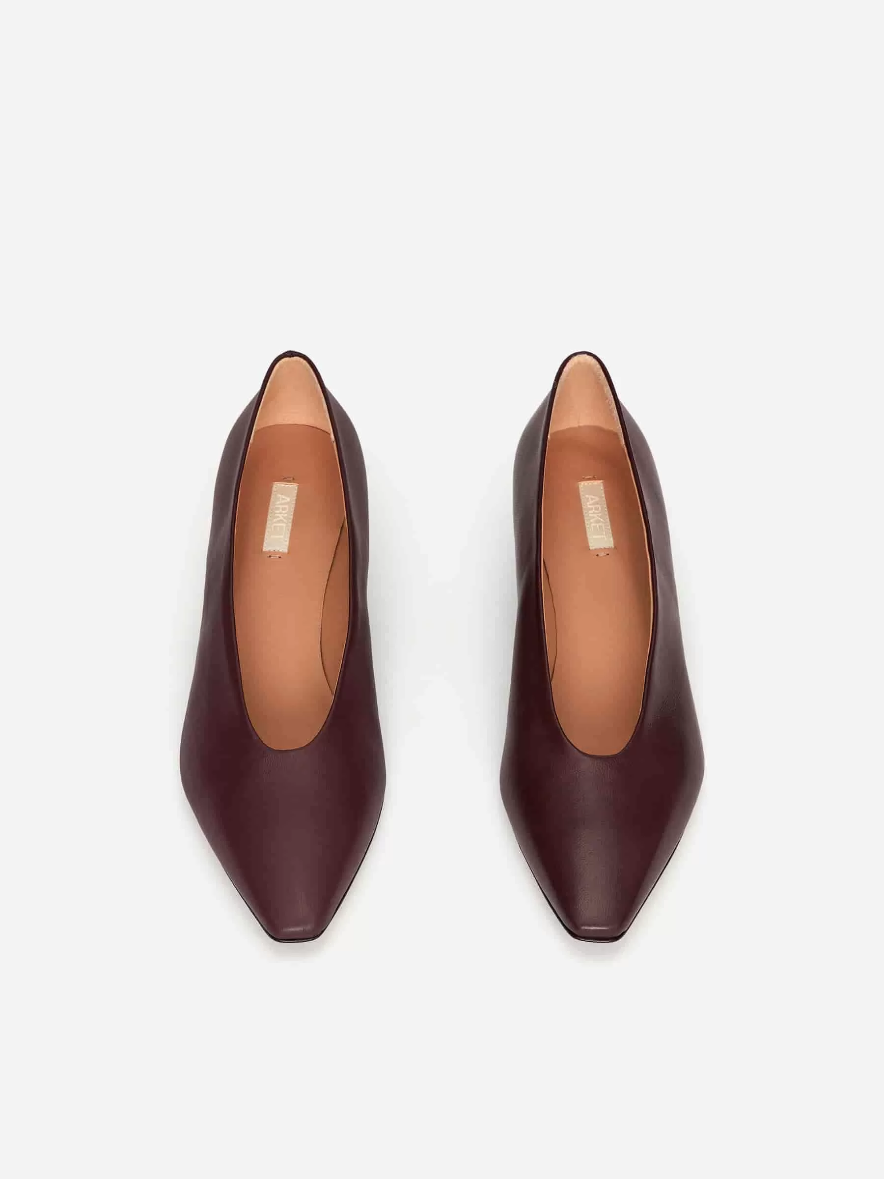 Pumps aus Leder im 80er-Jahre-Stil mit V-förmigem Obermaterial, niedrigem Absatz und spitzer Spitze.