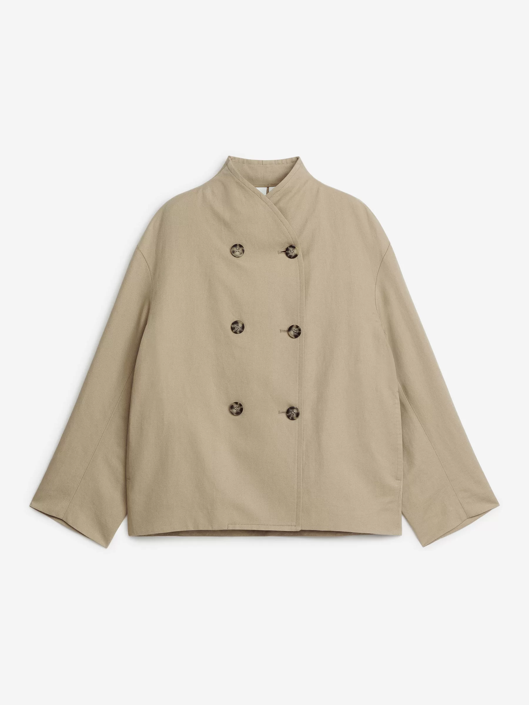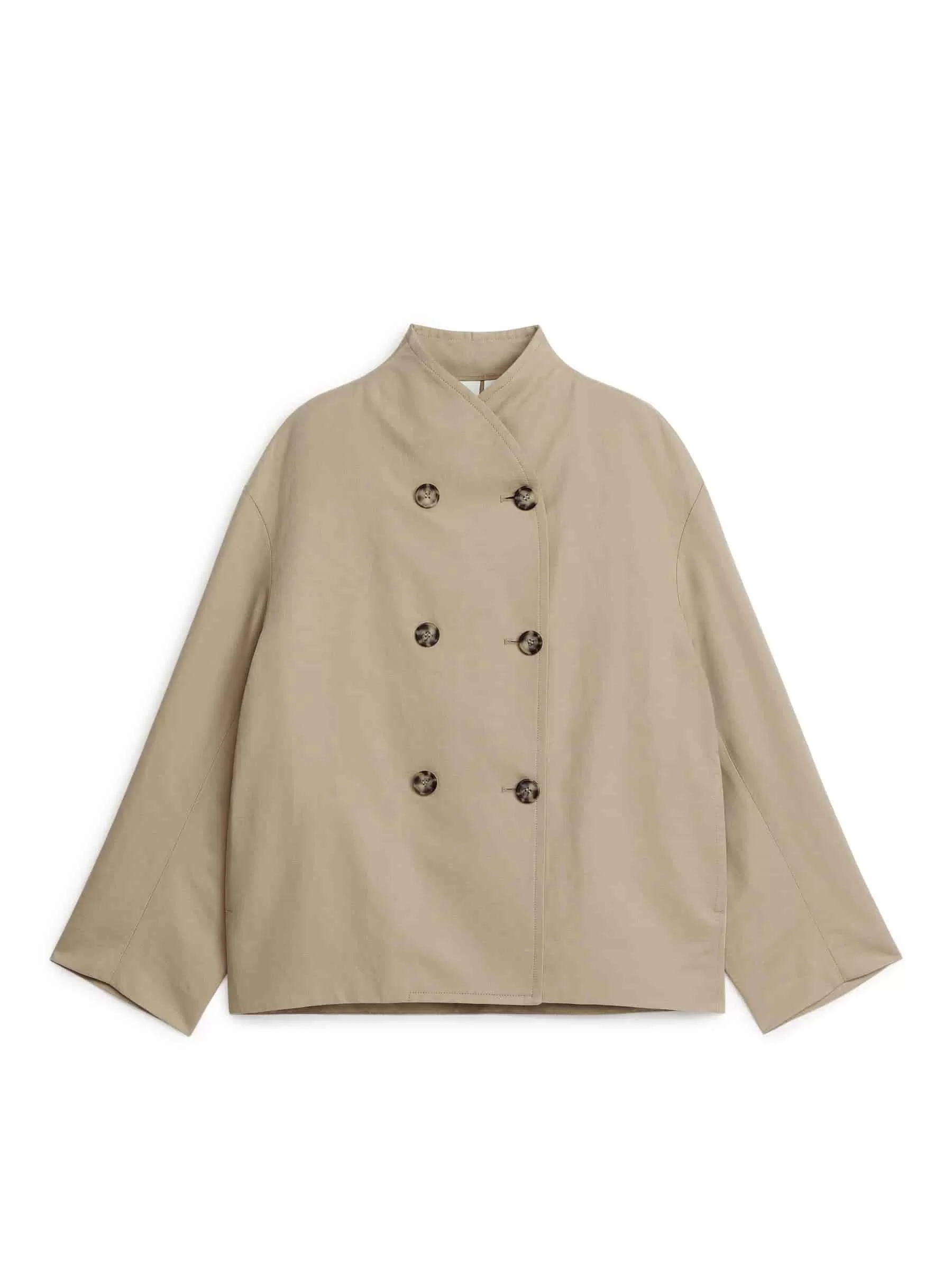 Zweireihige Jacke aus einer gewebten Mischung aus Leinen und Baumwolle. Für eine übergroße, leicht abgerundete Silhouette geschnitten und mit einer Schalfarbe versehen. Taschen an den Seitennähten. Ungefüttert.