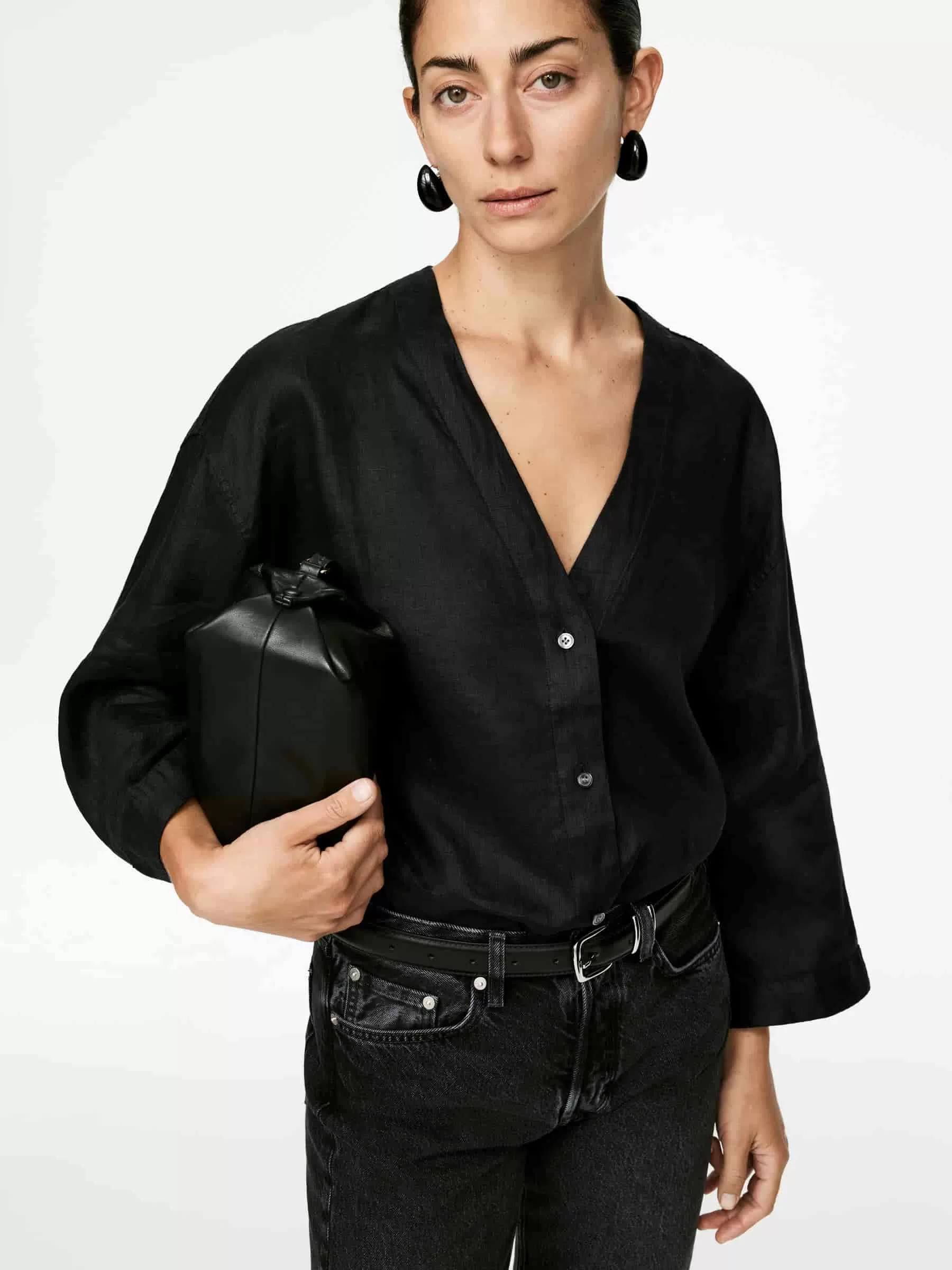 Kurzärmelige Bluse aus Leinen. Mit Knopfverschluss und lockerer Passform.