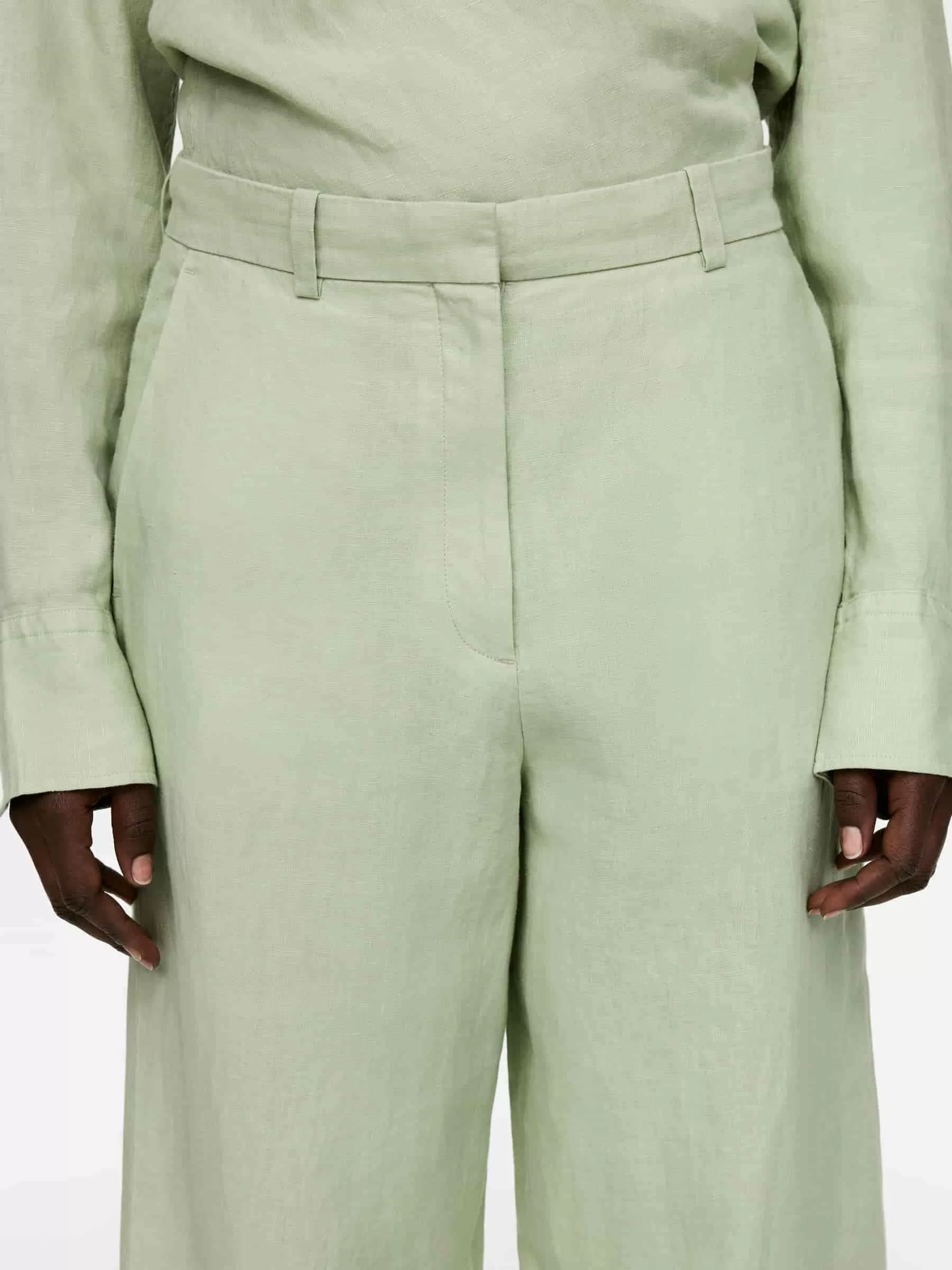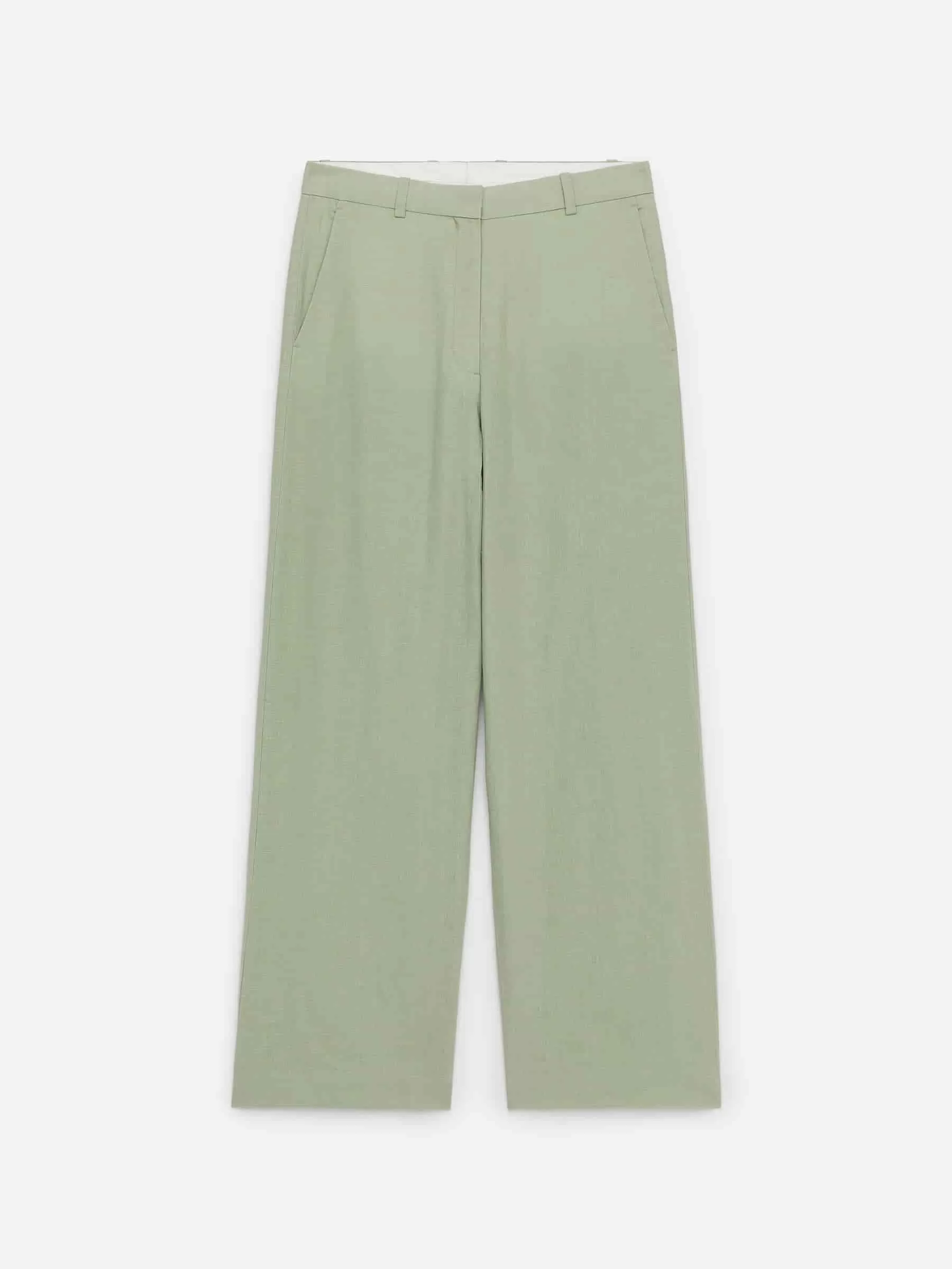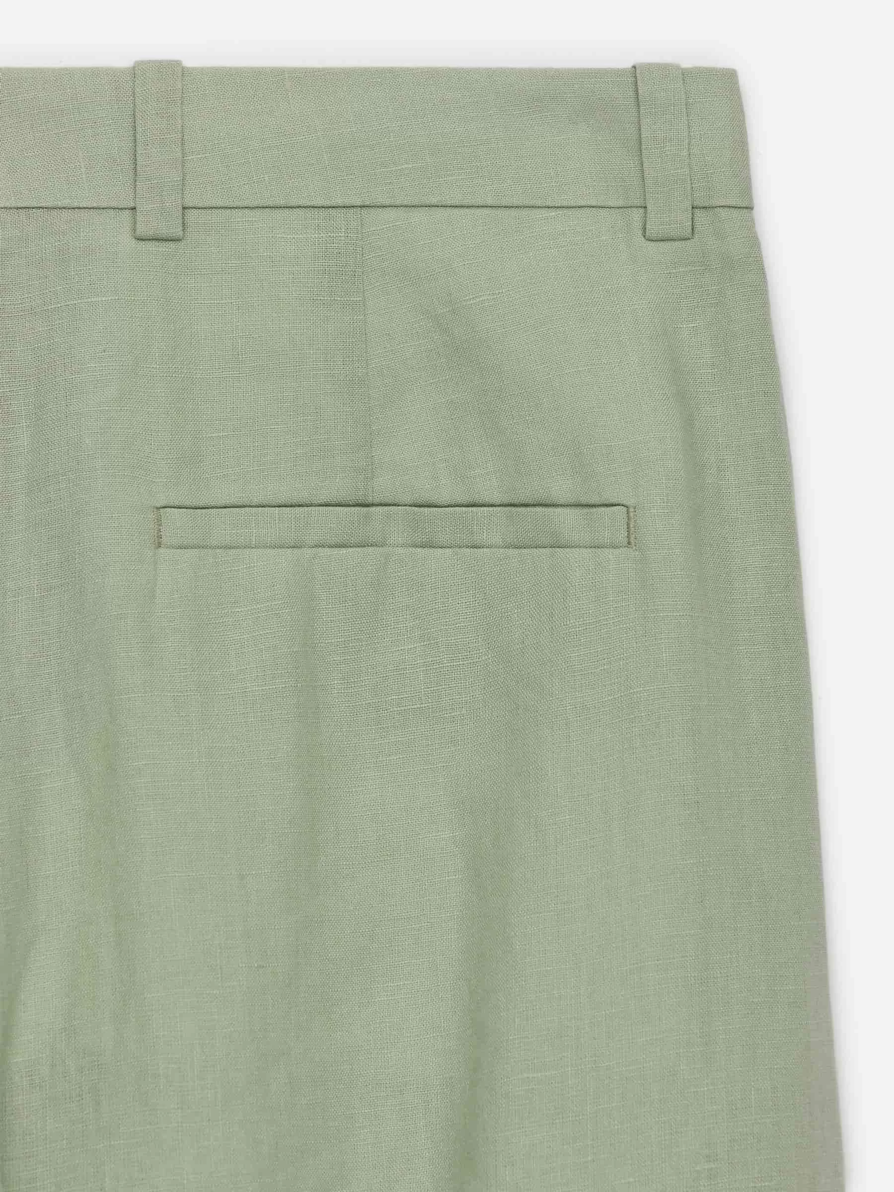 Hose mit mittelhohem Bund aus Leinen. Klettverschluss mit Reißverschluss im Hosenschlitz. Schräge Seitentaschen und Leistentaschen hinten.