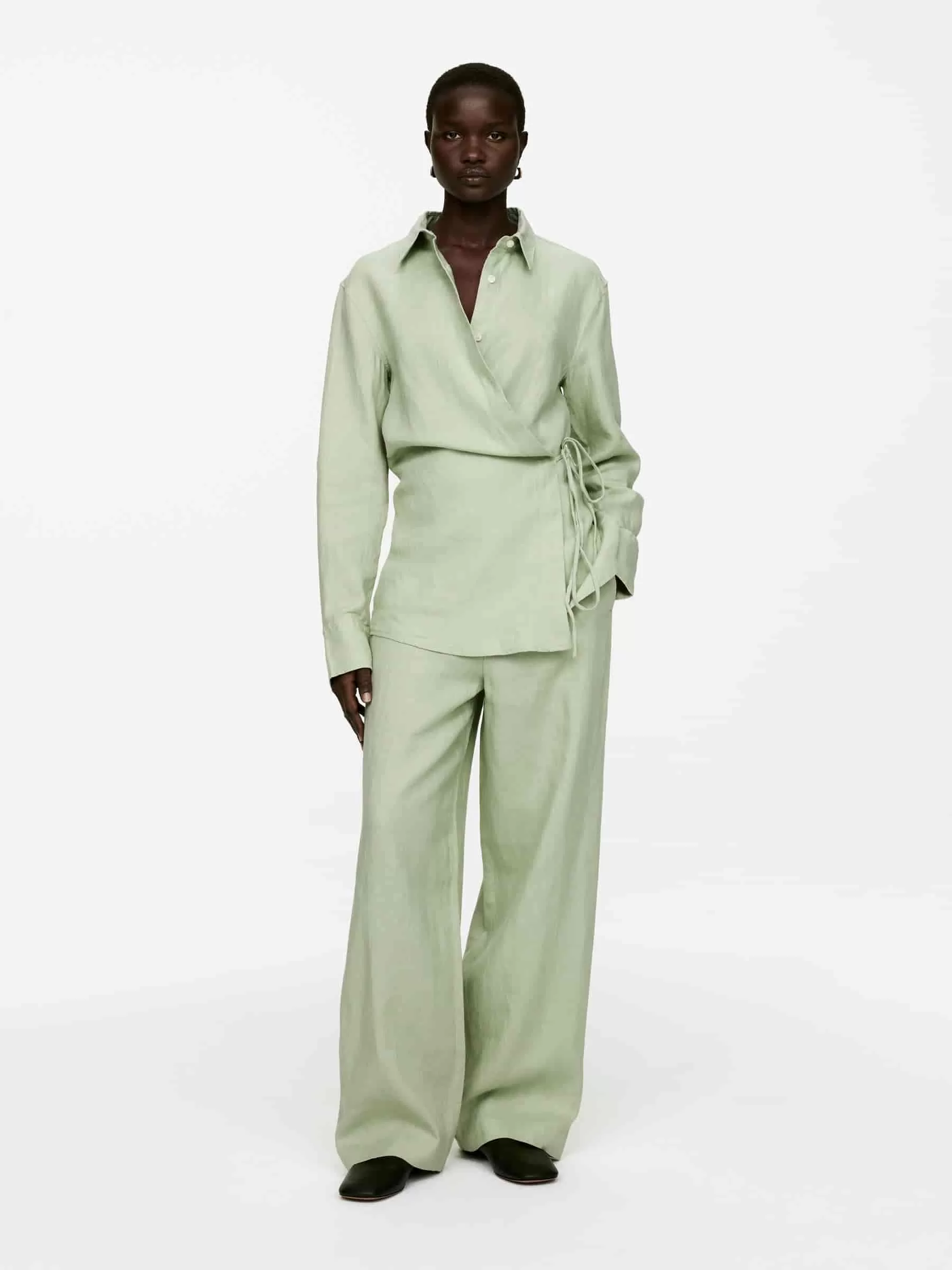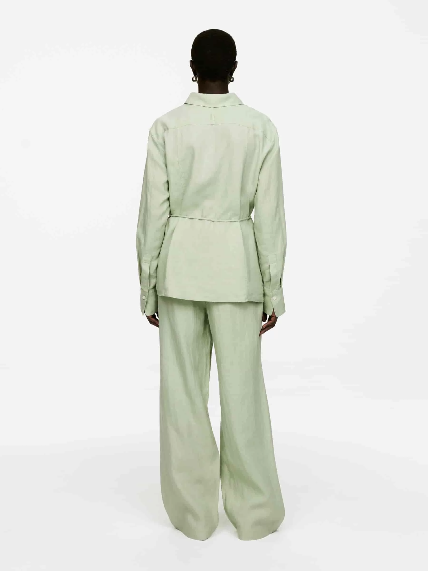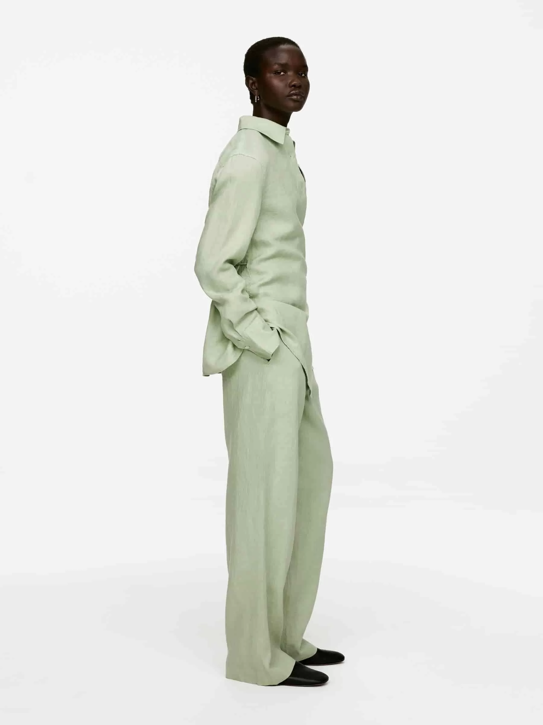Hose mit mittelhohem Bund aus Leinen. Klettverschluss mit Reißverschluss im Hosenschlitz. Schräge Seitentaschen und Leistentaschen hinten.