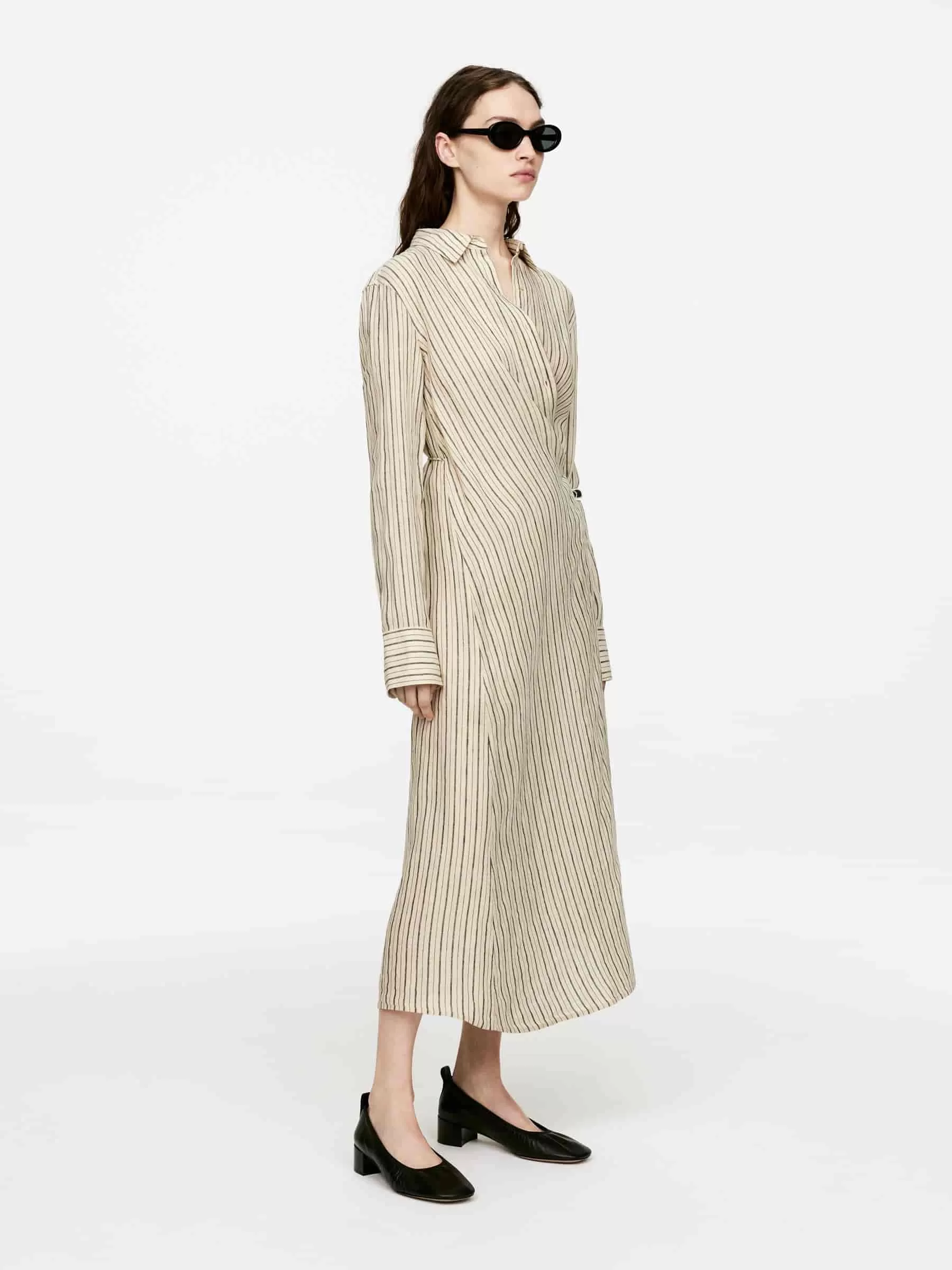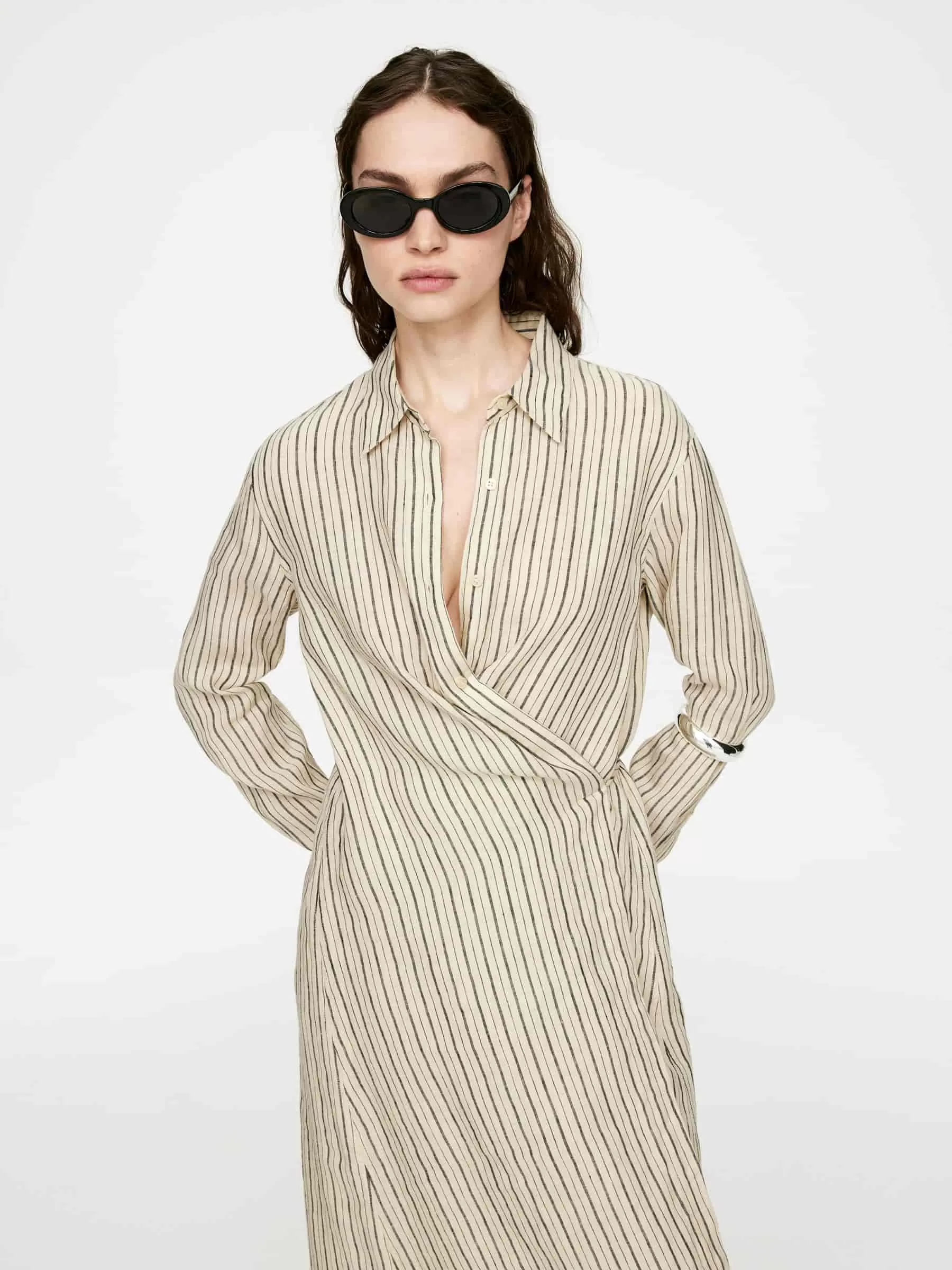 ARKE Damen Leinenkleid mit Wickeldetail Beige/Schwarz