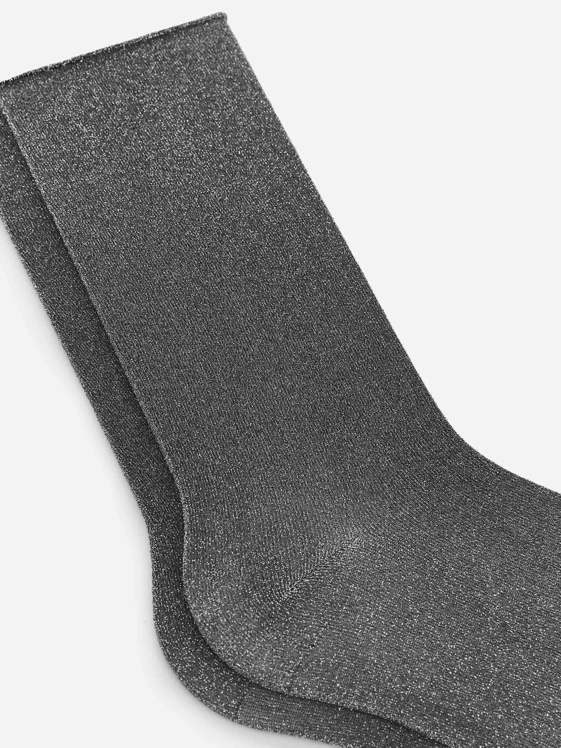 Mit einem Lurexfaden gestrickte Socken für einen Glitzereffekt. Gerollte Kanten.