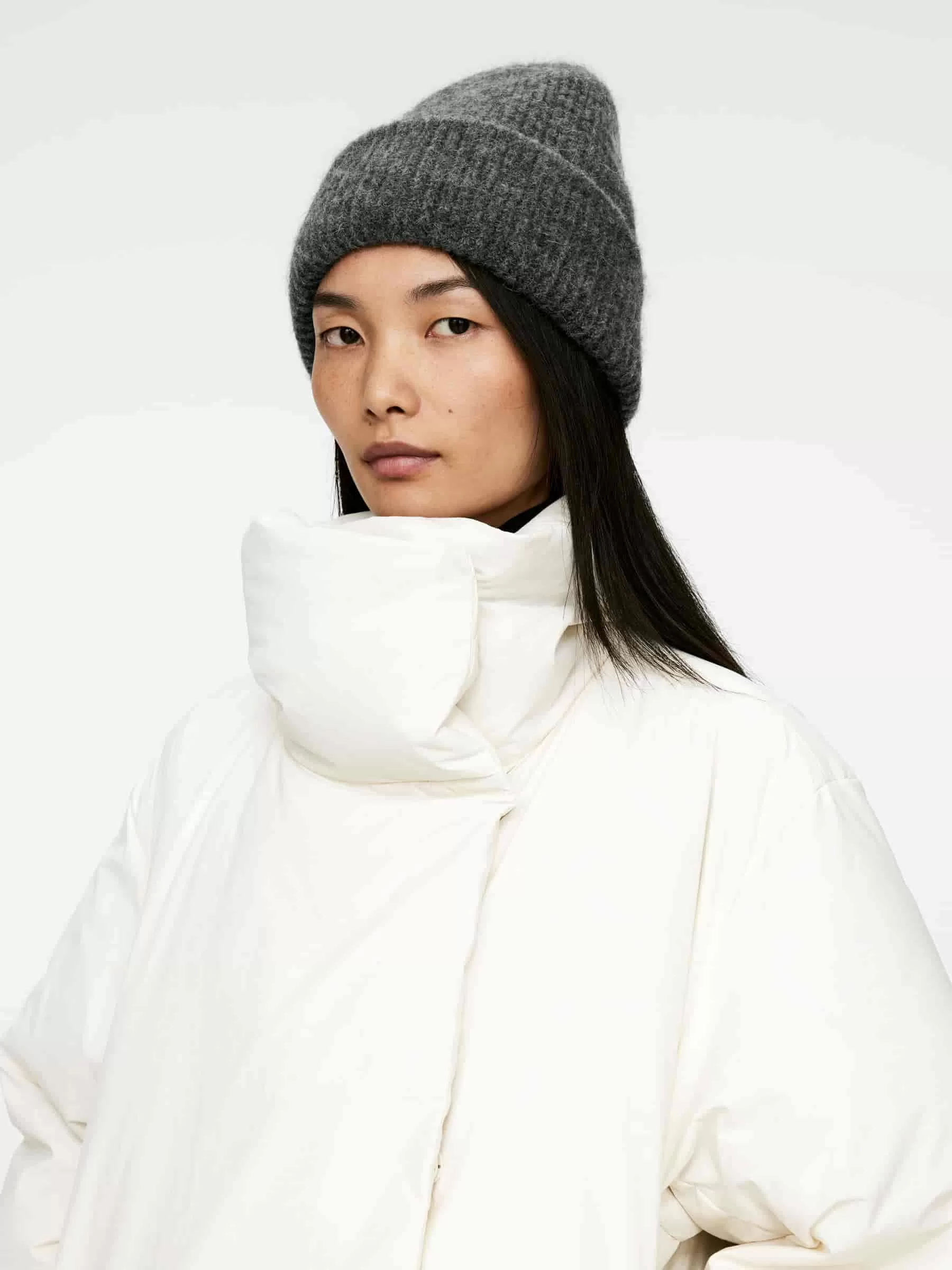 Klobige Rippstrickmütze aus einer Mischung aus Alpaka, Wolle und Polyester. Mit einer taillierteren Form und einer breiten Krempe, die gefaltet oder ungefaltet getragen werden kann. Dieser Stil besteht aus 31 % RAS-Alpaka und 32 % RWS-Wolle (TE-00047206). Produkte, die nach dem Responsible Wool Standard (RWS) und dem Responsible Alpaca Standard (RAS) zertifiziert sind, enthalten Wolle und Alpakafasern von Farmen, die unabhängig nach Tierschutz- und Landmanagementanforderungen zertifiziert sind.