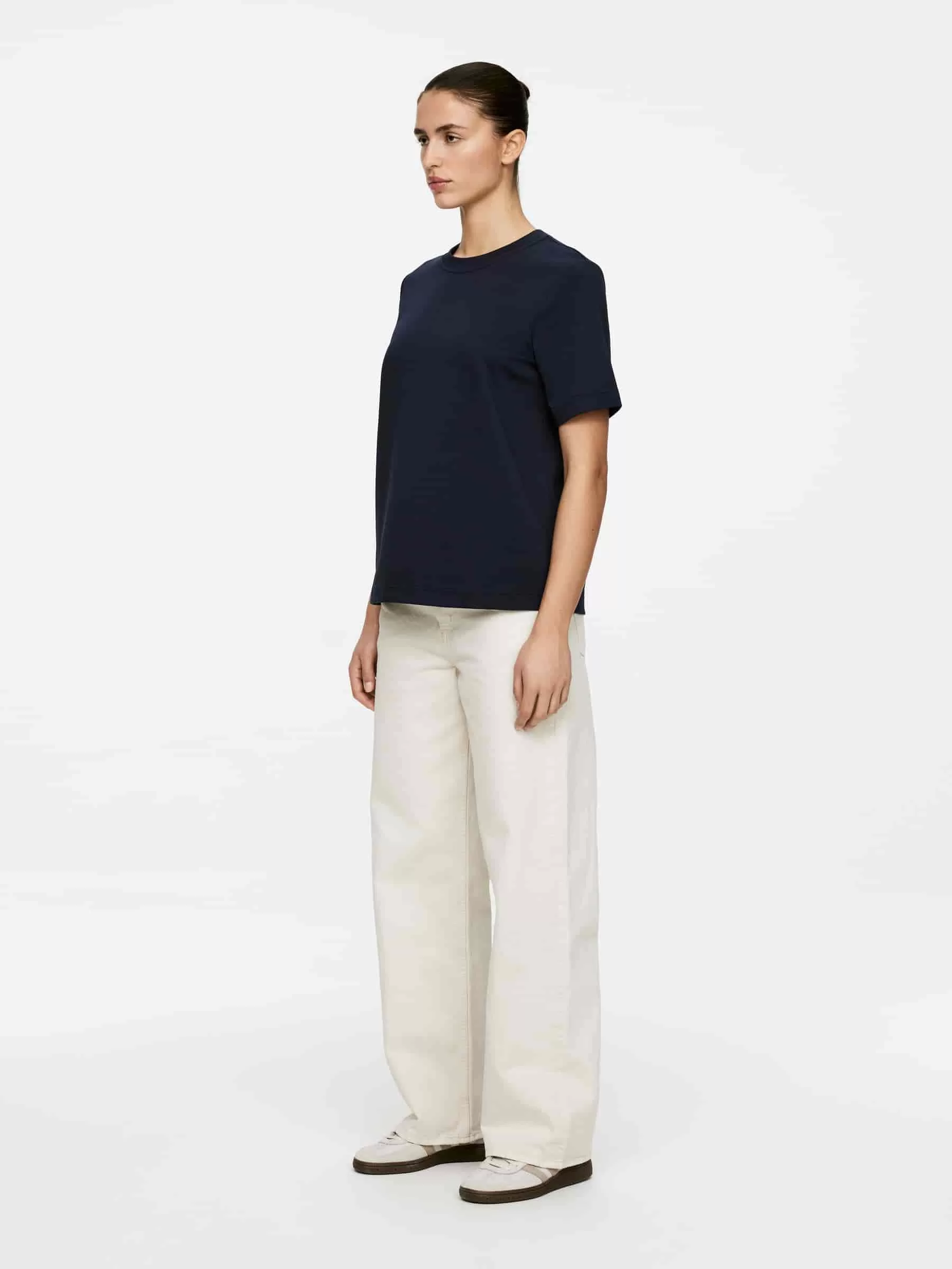 T-Shirt aus schwerem Interlock-Jersey. Die robuste, aber weiche Haptik sorgt für einen eleganten Look, der in Form bleibt. Ein kurzärmliges Modell mit rundem Ausschnitt und klassischer Passform.