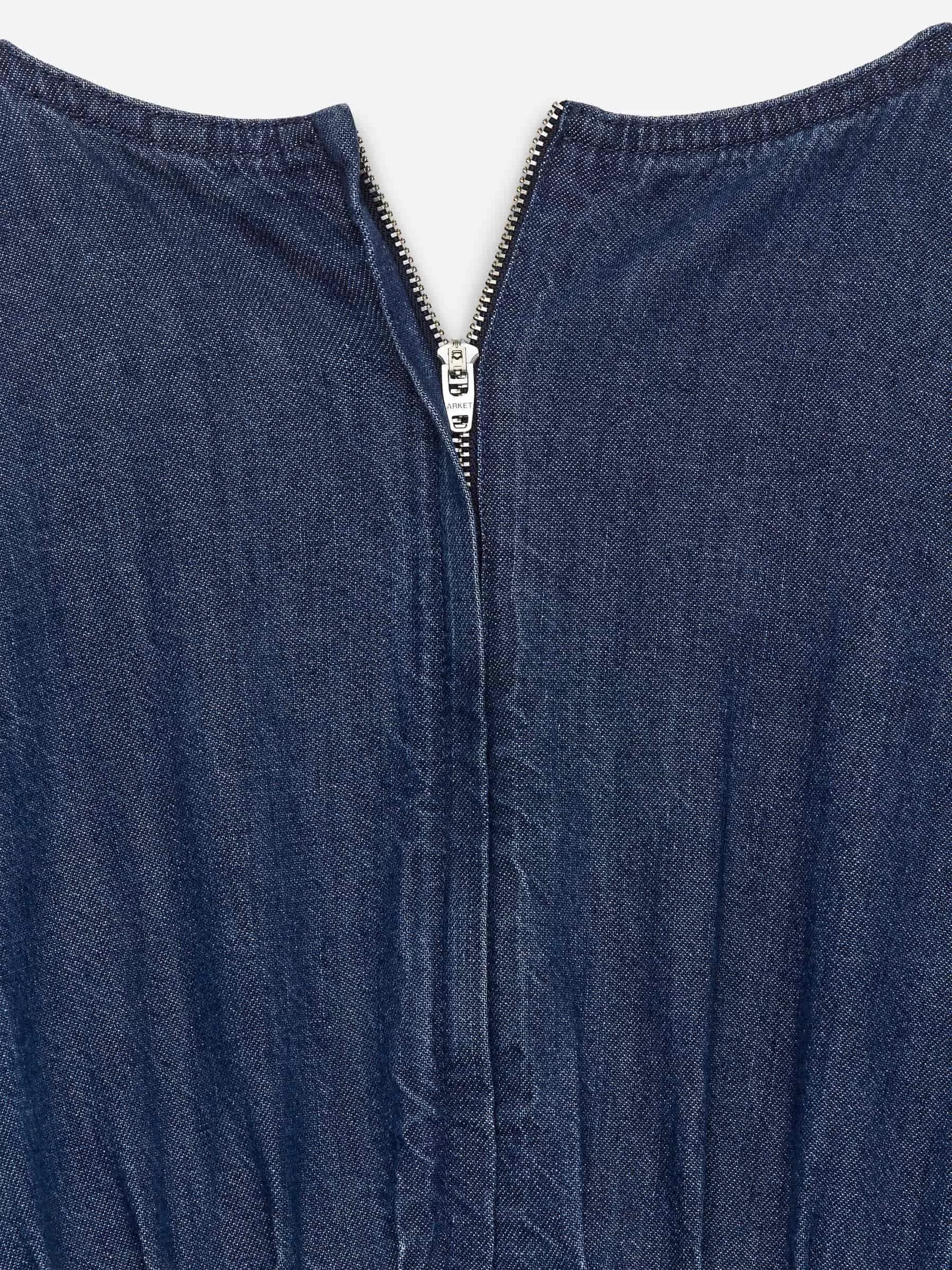 Jeans-Midikleid aus Baumwolle. Ein ärmelloses Modell mit Falten an der Taille, Reißverschluss in der Rückenmitte und Seitentaschen. Normale Passform.