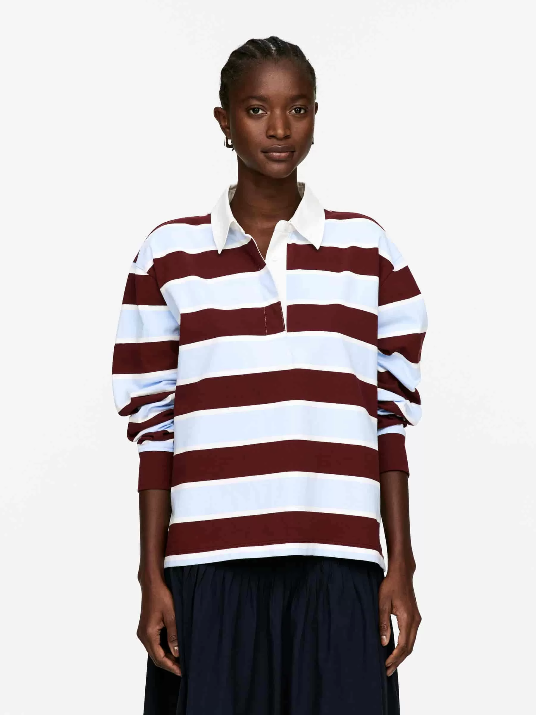 Poloshirt aus Twill-Webart aus Baumwolle. Mit langen Ärmeln und Kragen in Kontrastfarbe. Verdeckte Knopfleiste mit fünf versteckten Knöpfen. An den Seiten geteilt.