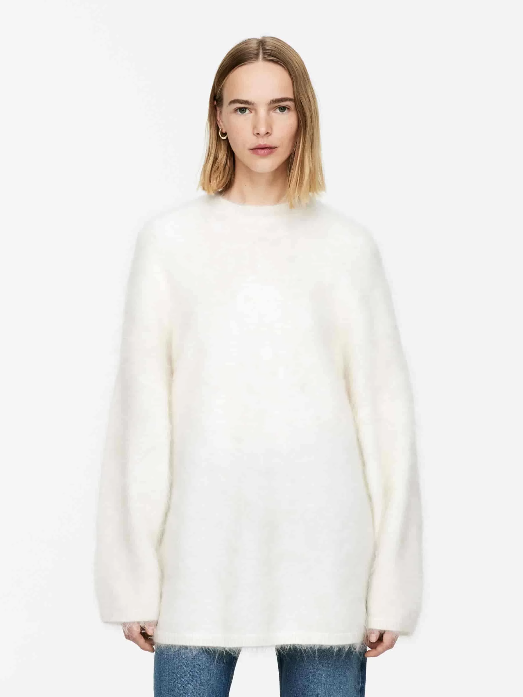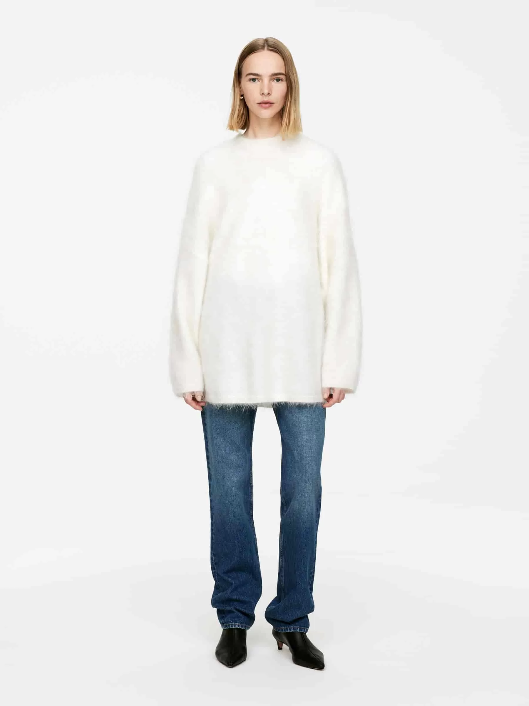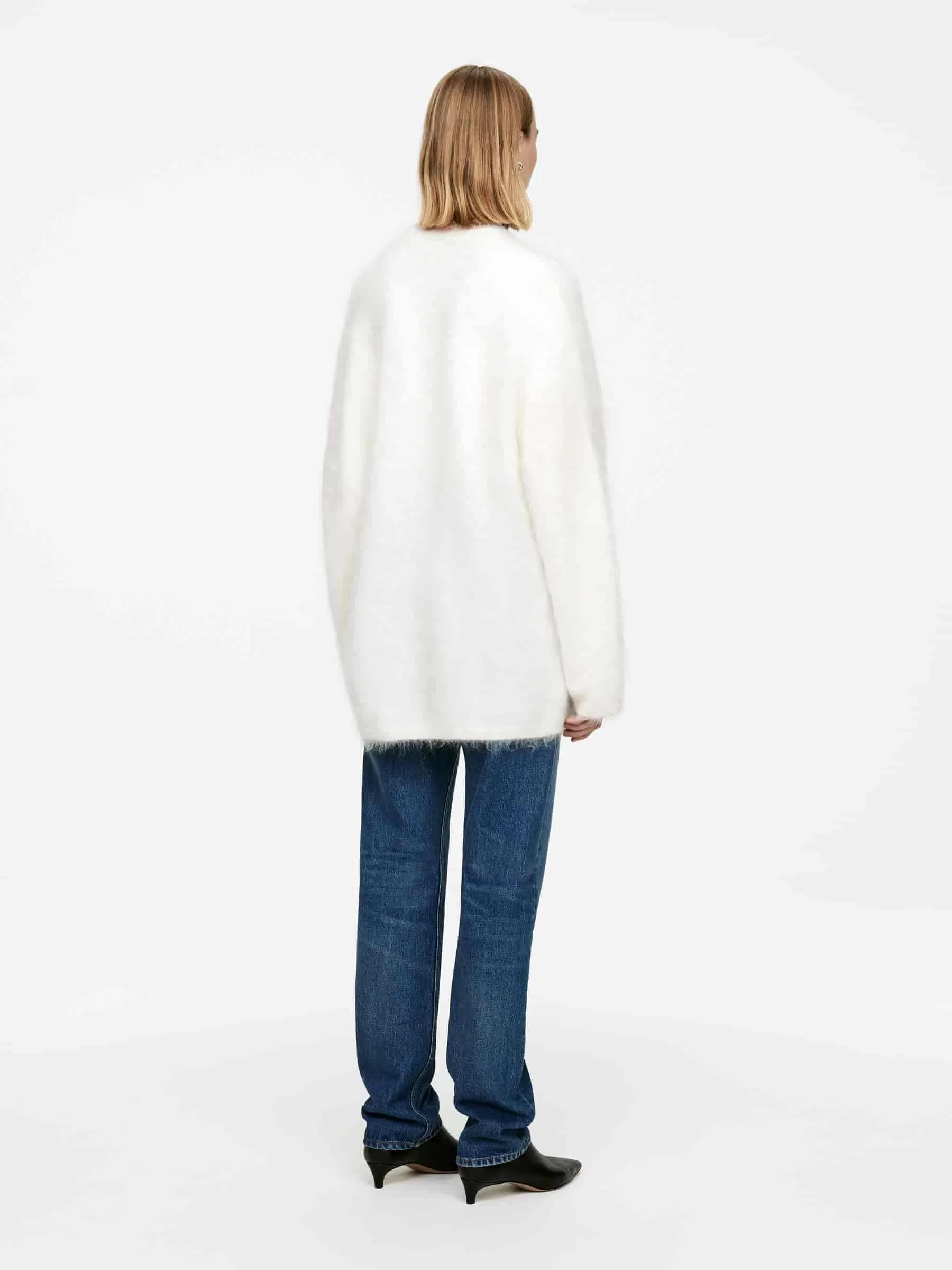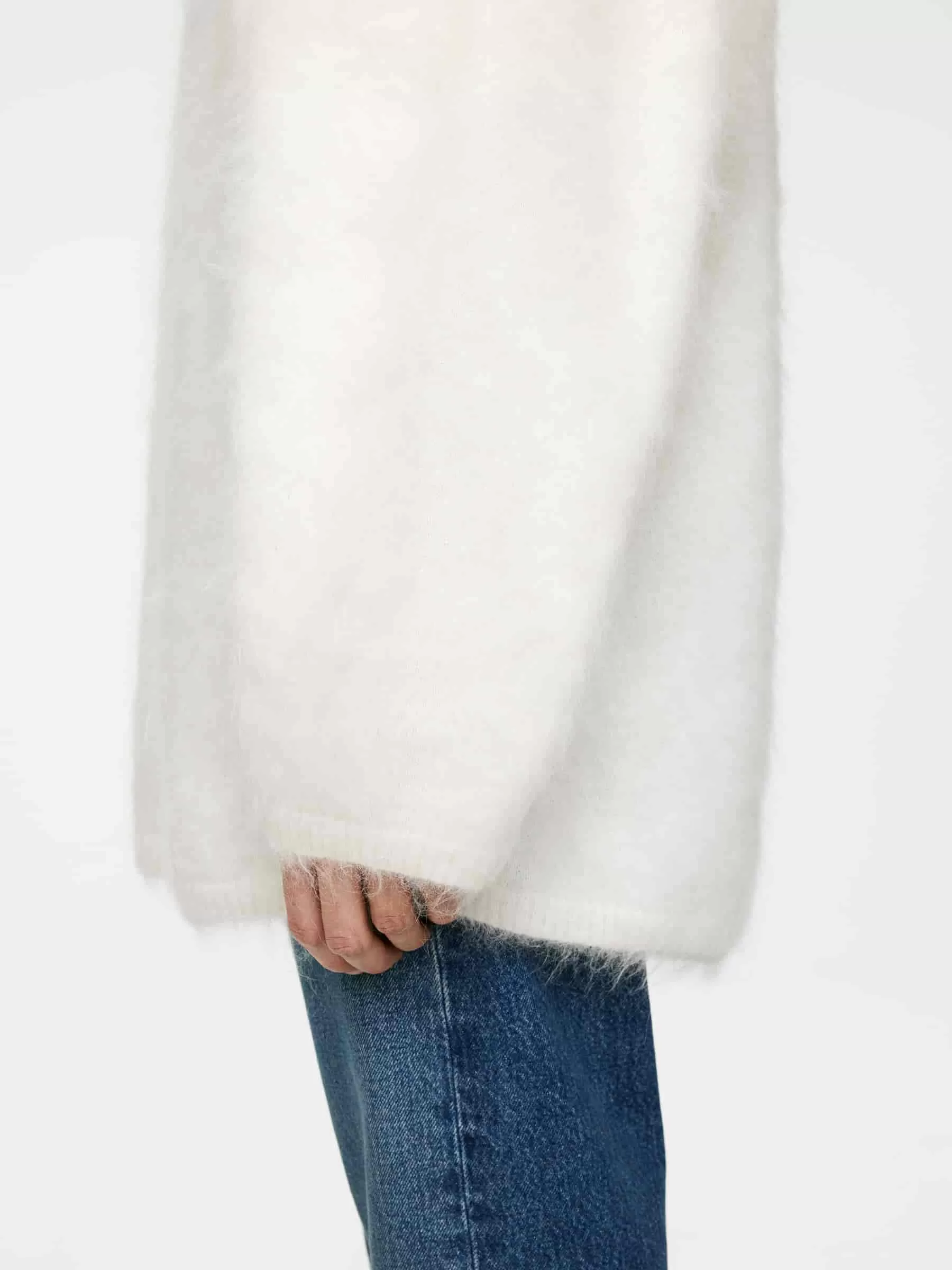 Langer Pullover aus einer Woll-Mohair-Mischung. Ein glatt gestrickter Stil mit Rundhalsausschnitt und einer übergroßen Passform. Dieser Pullover enthält 45 % RMS-Mohair und 17 % RWS-Wolle (TE-00047206). Produkte, die nach dem Responsible Wool Standard (RWS) und dem Responsible Mohair Standard (RMS) zertifiziert sind, enthalten Wolle und Mohairfasern von Farmen, die unabhängig nach Tierschutz- und Landbewirtschaftungsanforderungen zertifiziert sind.