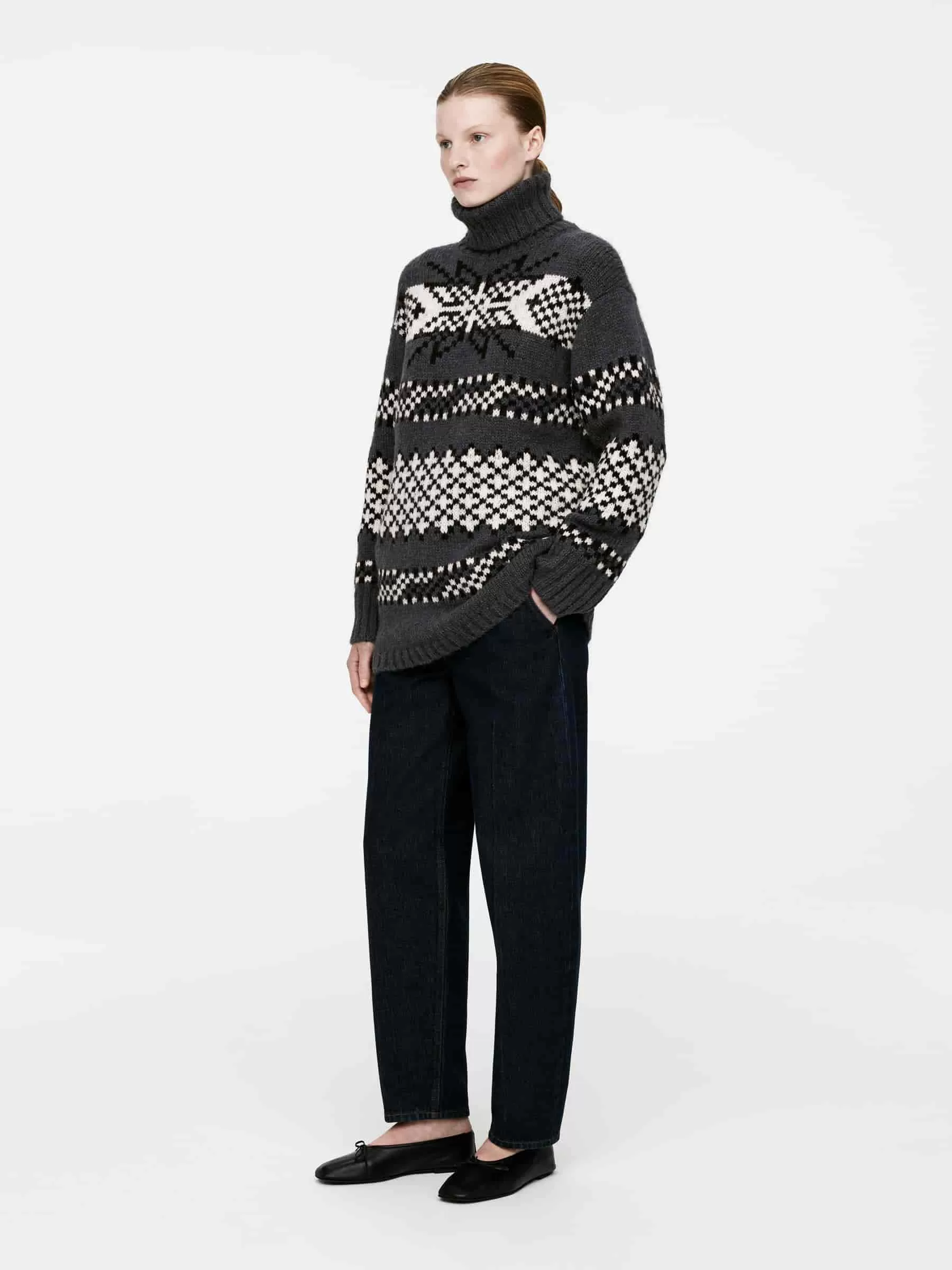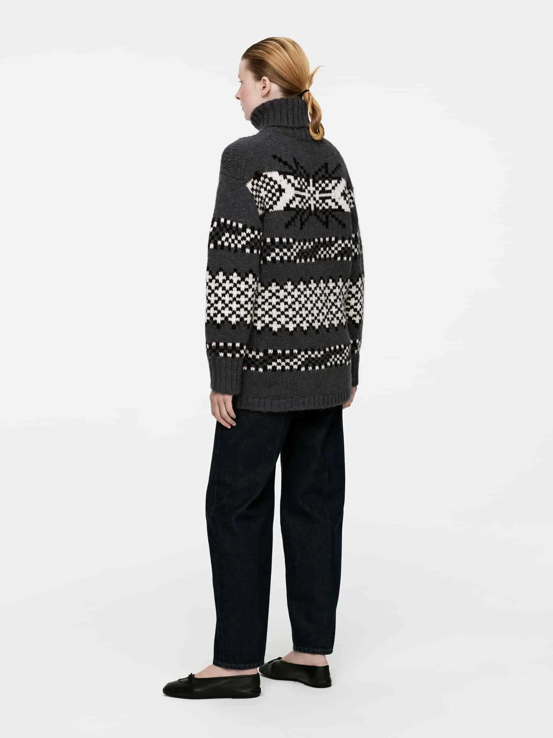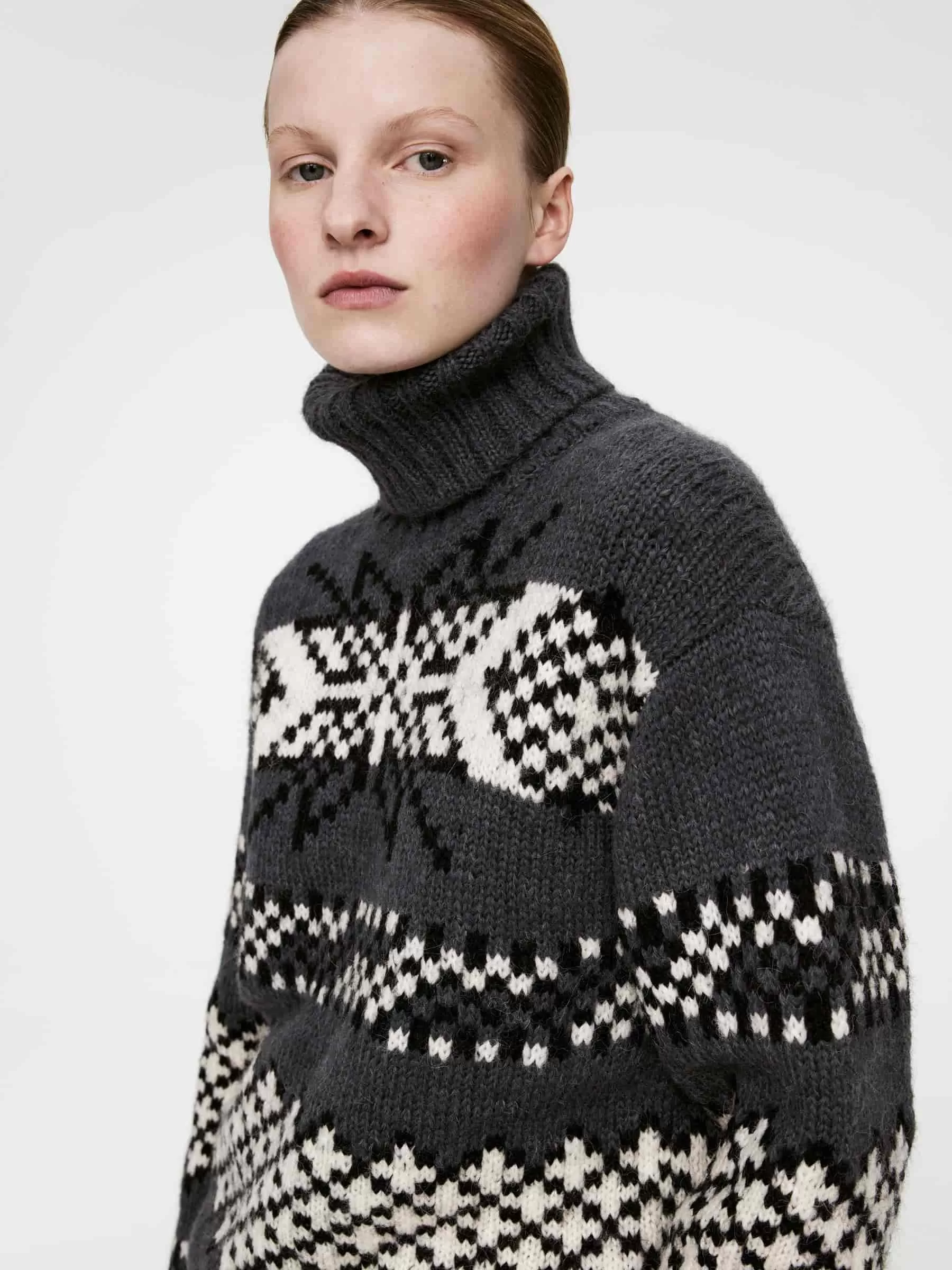 Jacquard-Strickpullover aus einer Mischung aus Wolle und Alpaka. Mit Rollkragen und gerippten Abschlüssen. Entspannte Passform. Dieser Stil besteht aus 44 % RAS-Alpaka und 56 % RWS-Wolle (TE-00047206). Produkte, die nach dem Responsible Wool Standard (RWS) und dem Responsible Alpaca Standard (RAS) zertifiziert sind, enthalten Wolle und Alpakafasern von Farmen, die unabhängig nach Tierschutz- und Landmanagementanforderungen zertifiziert sind.