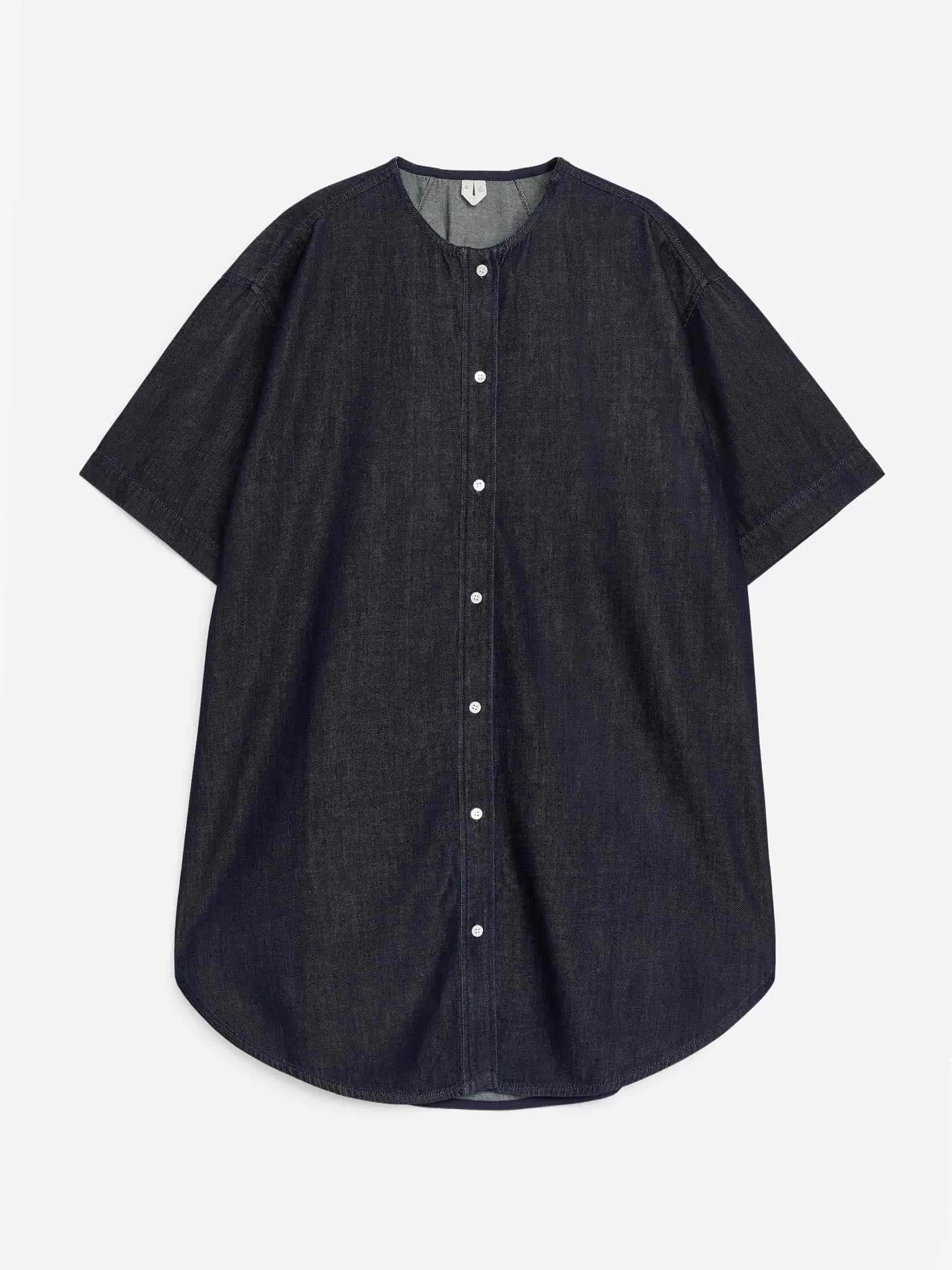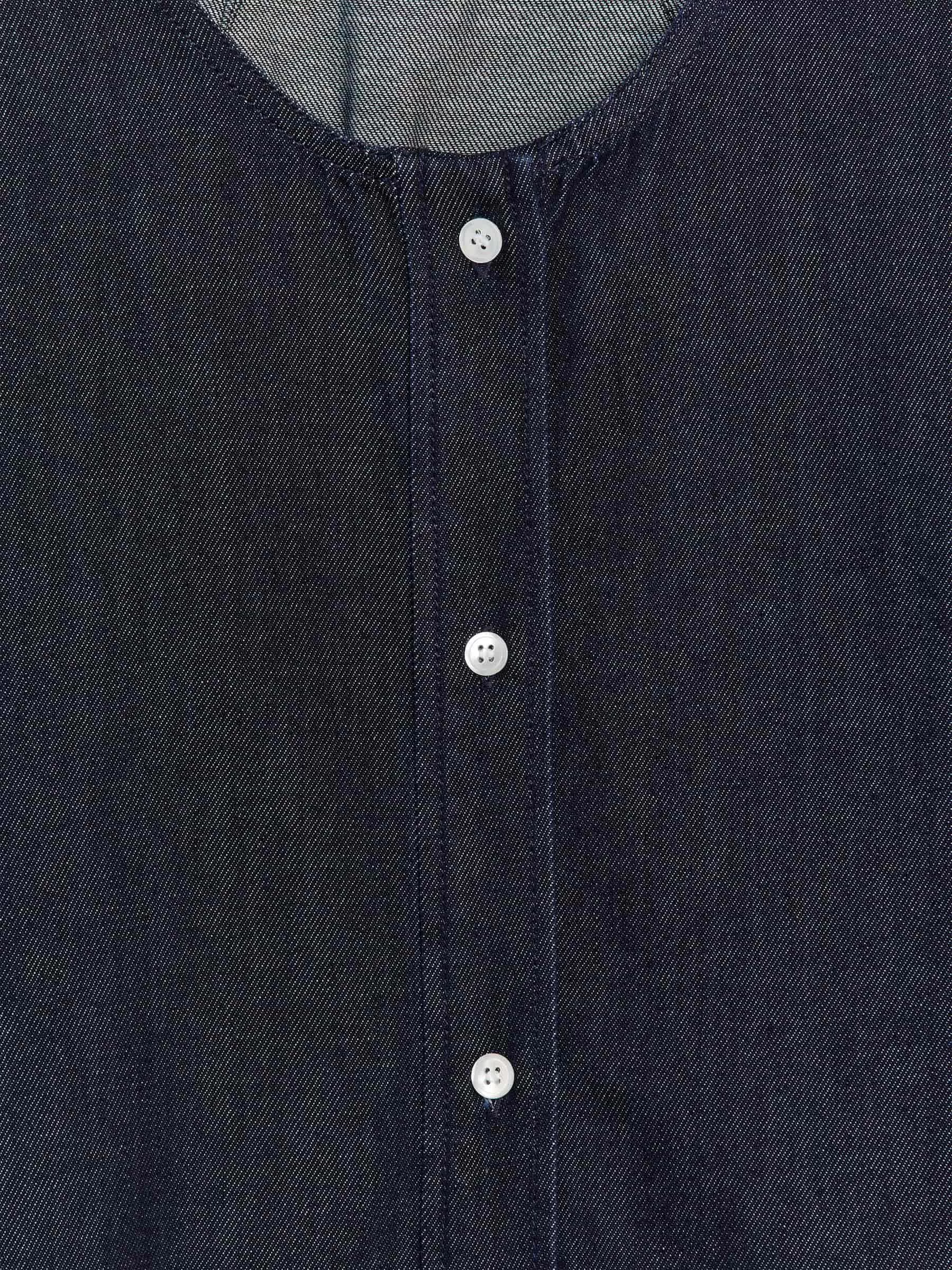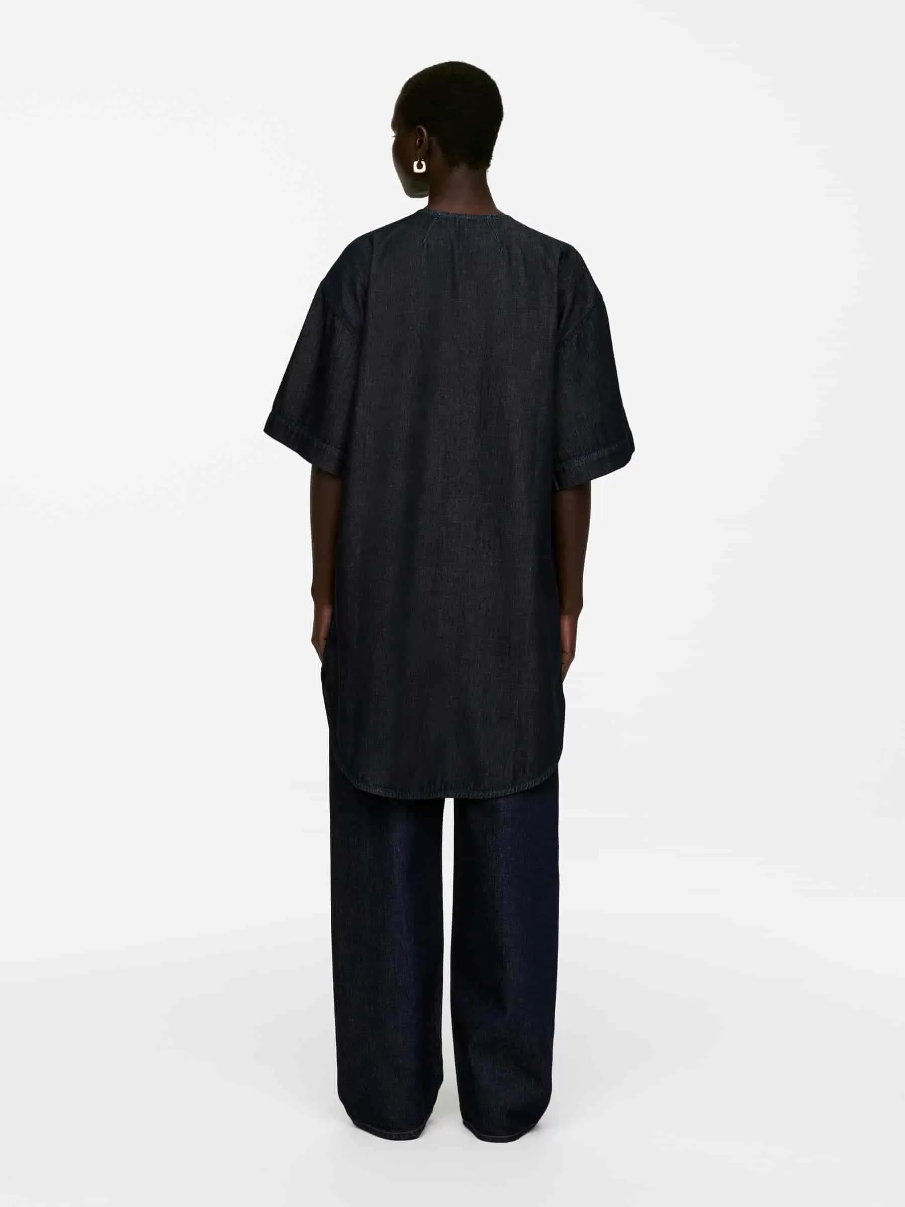 Kurzärmelige Tunika aus einer weichen Baumwoll-Lyocell-Mischung. Dies ist ein kragenloses Modell mit Knopfverschluss und lockerer Passform.