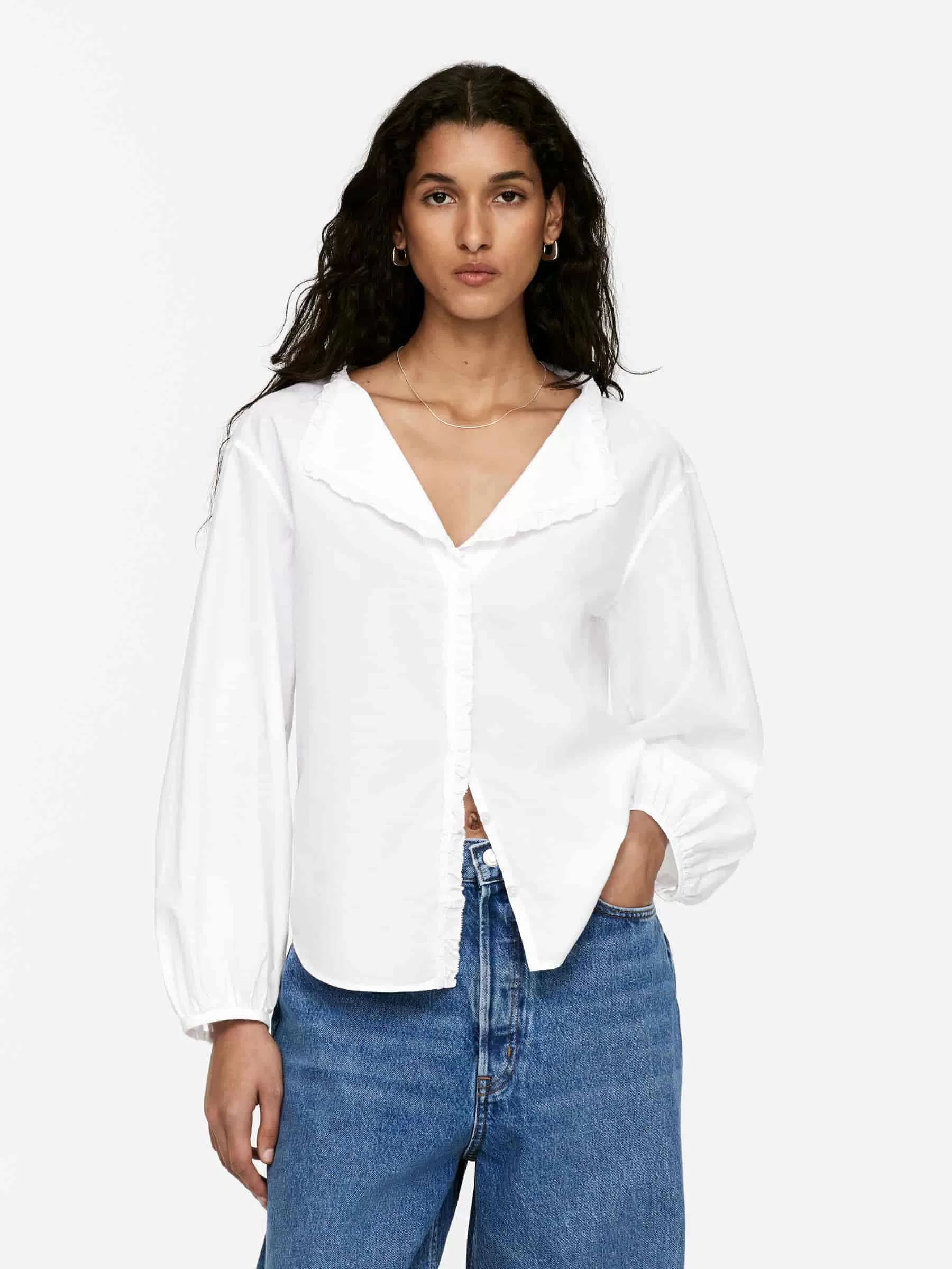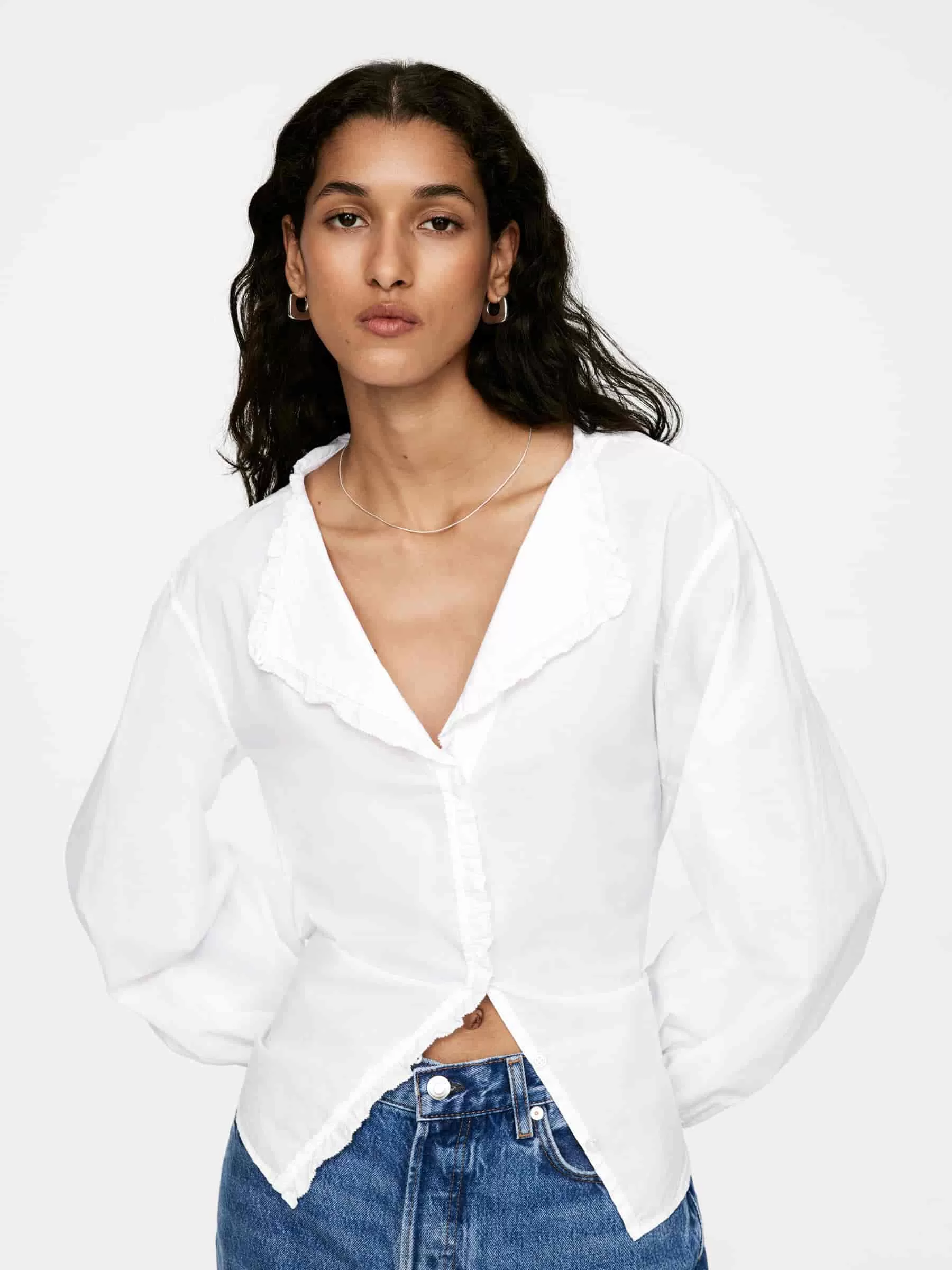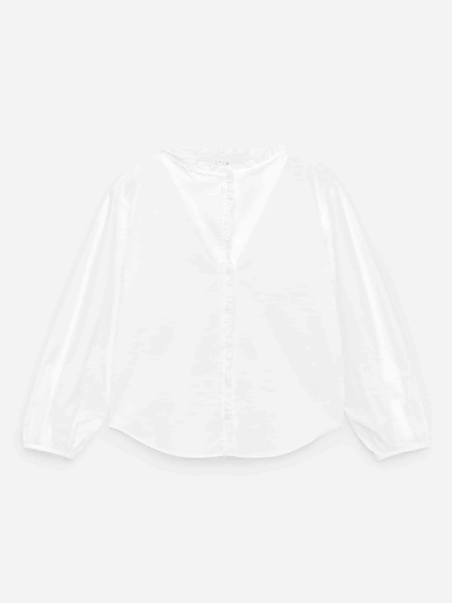 Langarmbluse aus Baumwolle. Mit Rüschen vorne, Knopfverschluss und Raffungen an den Manschetten. Normale Passform.