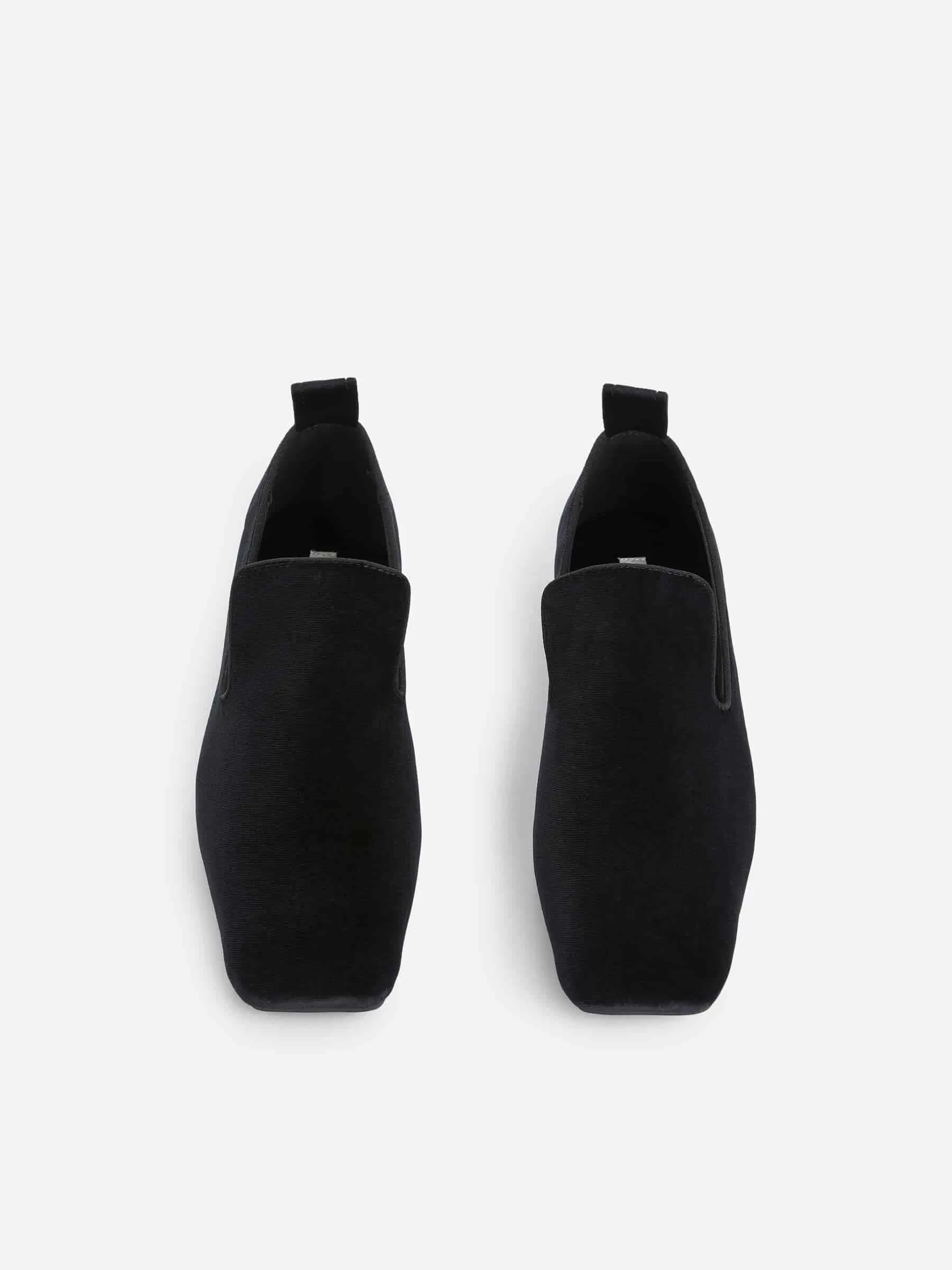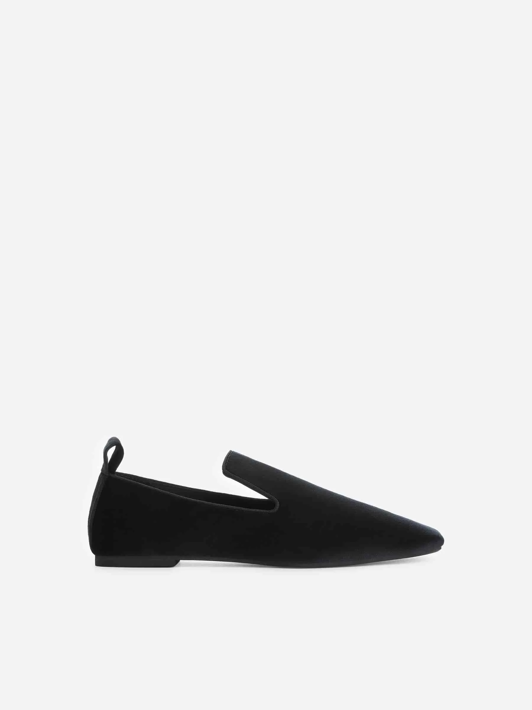Indoor-Samt-Loafer aus weichem Samt. Ausgestattet mit einer eckigen Zehenpartie, einer Schlaufe hinten und einem Zierbesatz am Obermaterial.