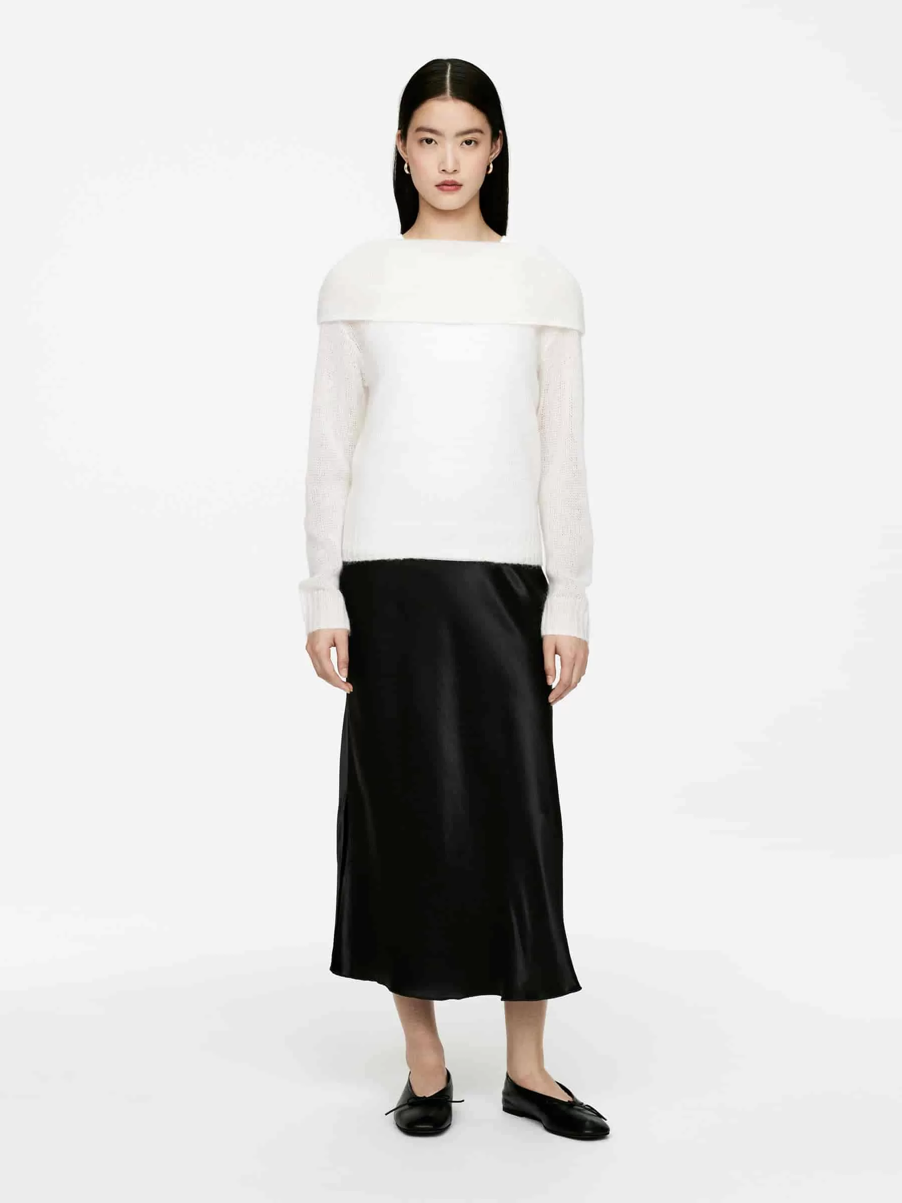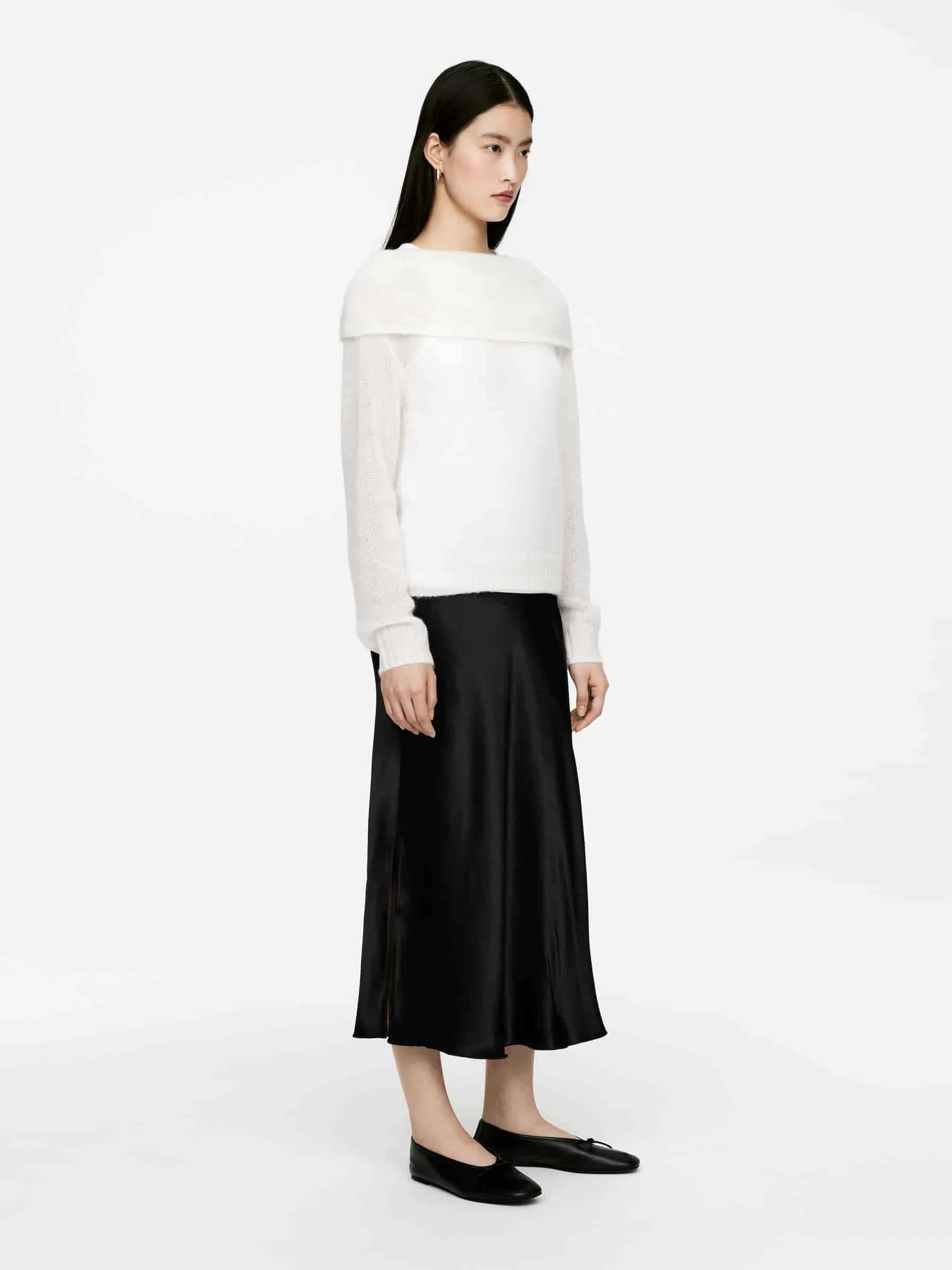 Dieser Rock ist aus einem schräg geschnittenen Satingewebe gefertigt und hat eine schmeichelnde, leicht geriffelte Passform. Ein schlichtes Design mit elastischem Ripsband am Bund und verdecktem Reißverschluss an der Seitennaht. Der Rock ist so geschnitten, dass er bis knapp unter das Knie reicht. Ungefüttert.