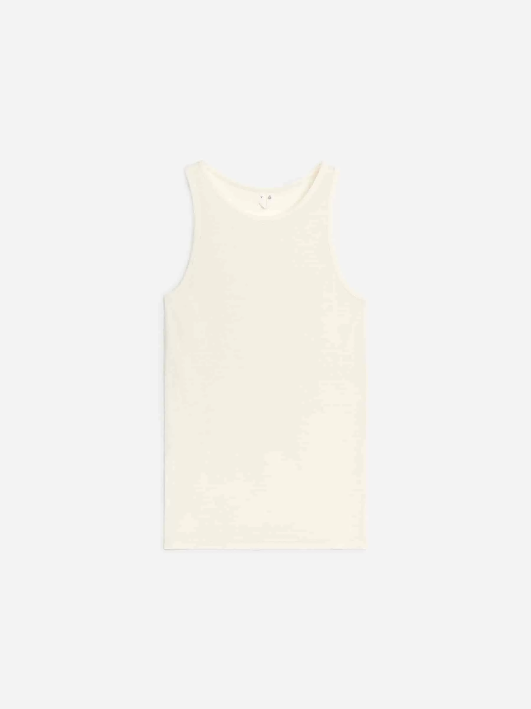 Ein schmal geschnittenes Tanktop aus Seide, das sich weich anfühlt, leicht ist und sich ideal als Basisschicht eignet. Gerippter Stoff, der eine natürliche Dehnbarkeit ermöglicht.