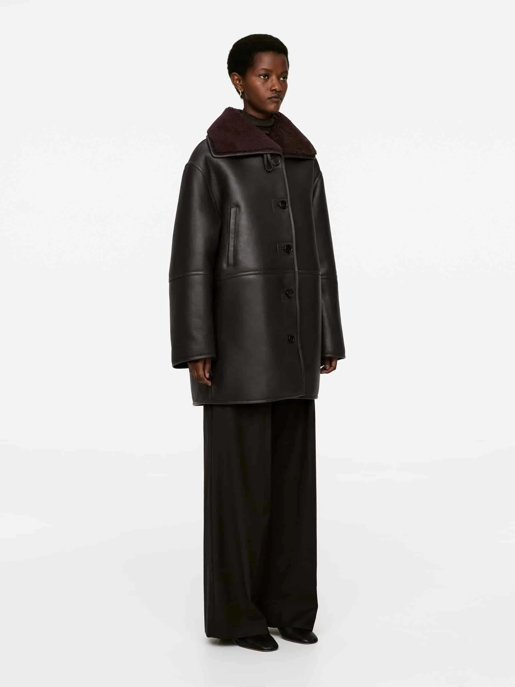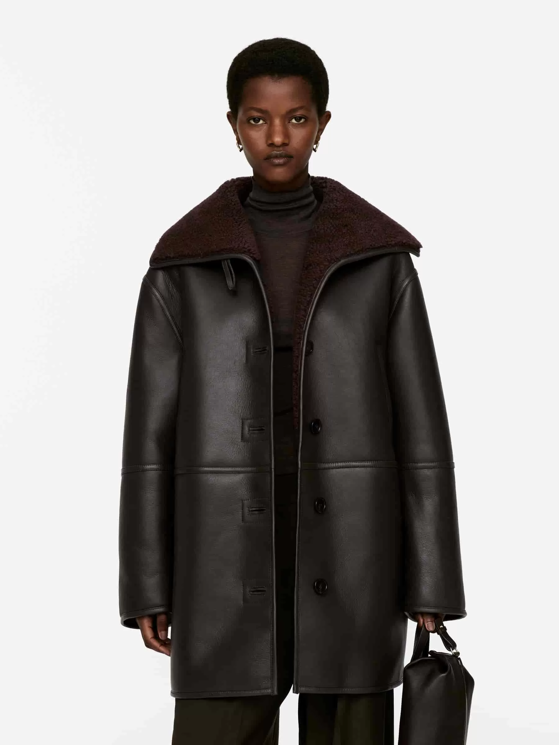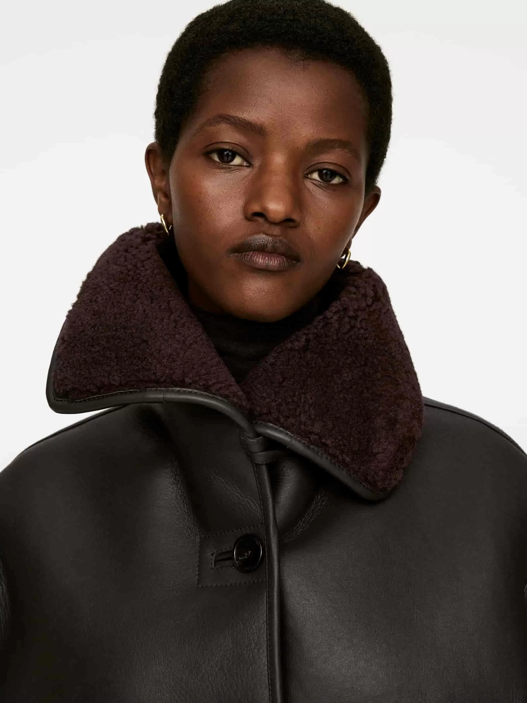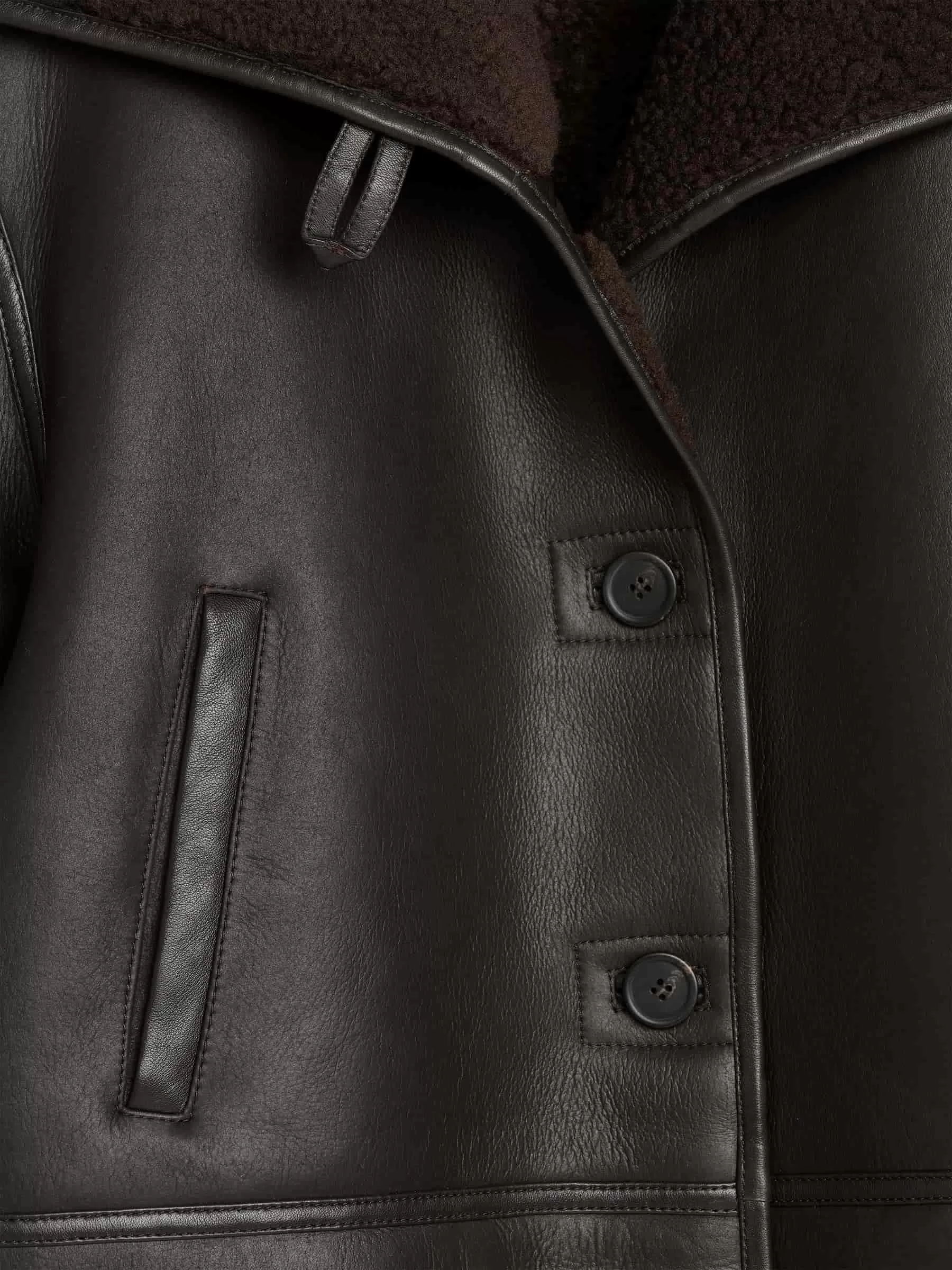 Einreihige Lederjacke mit weicher Lammfell-Innenseite. Mit schmalen Leistentaschen, hoch- und herunterklappbarem Kragen und Knopfverschluss.