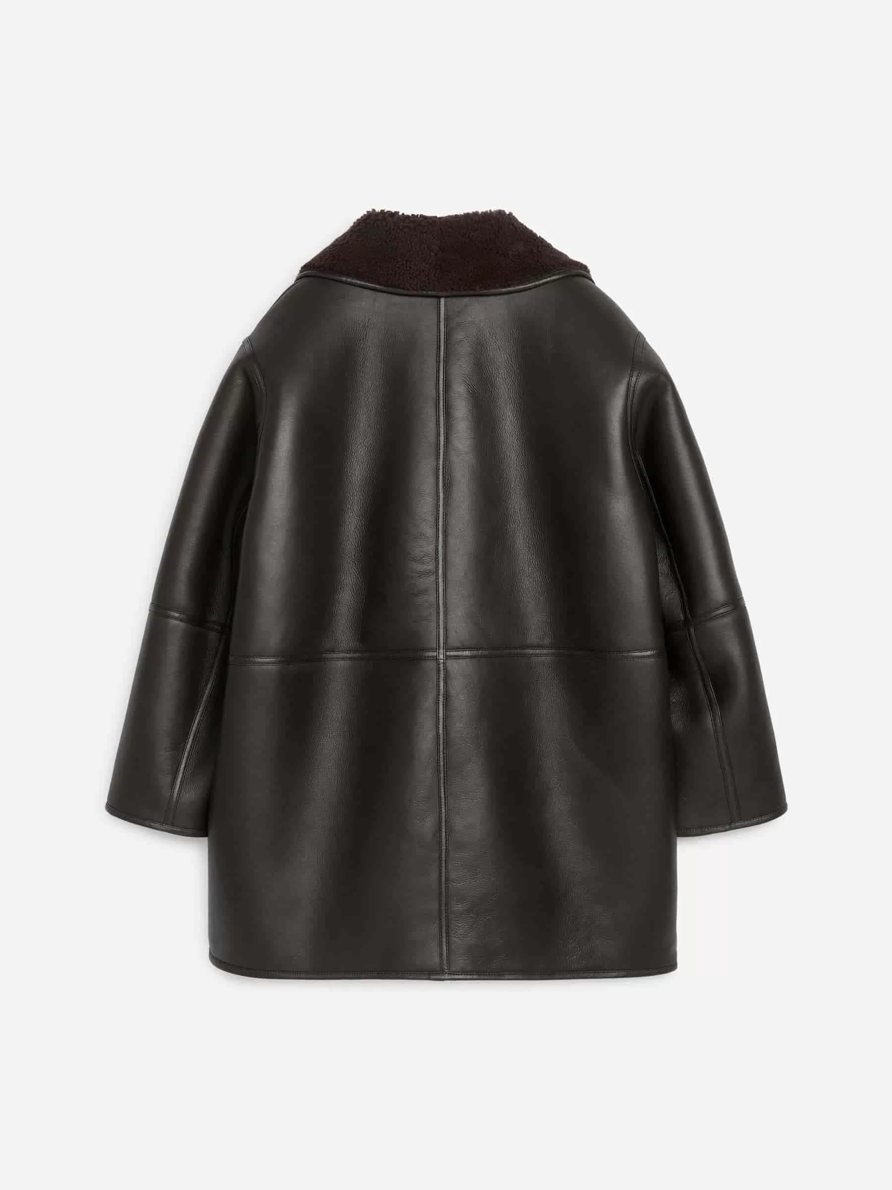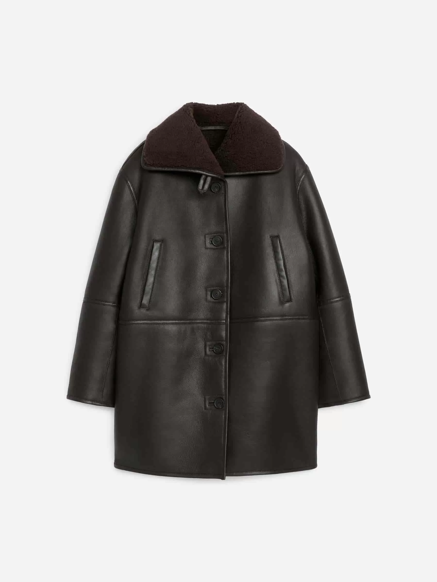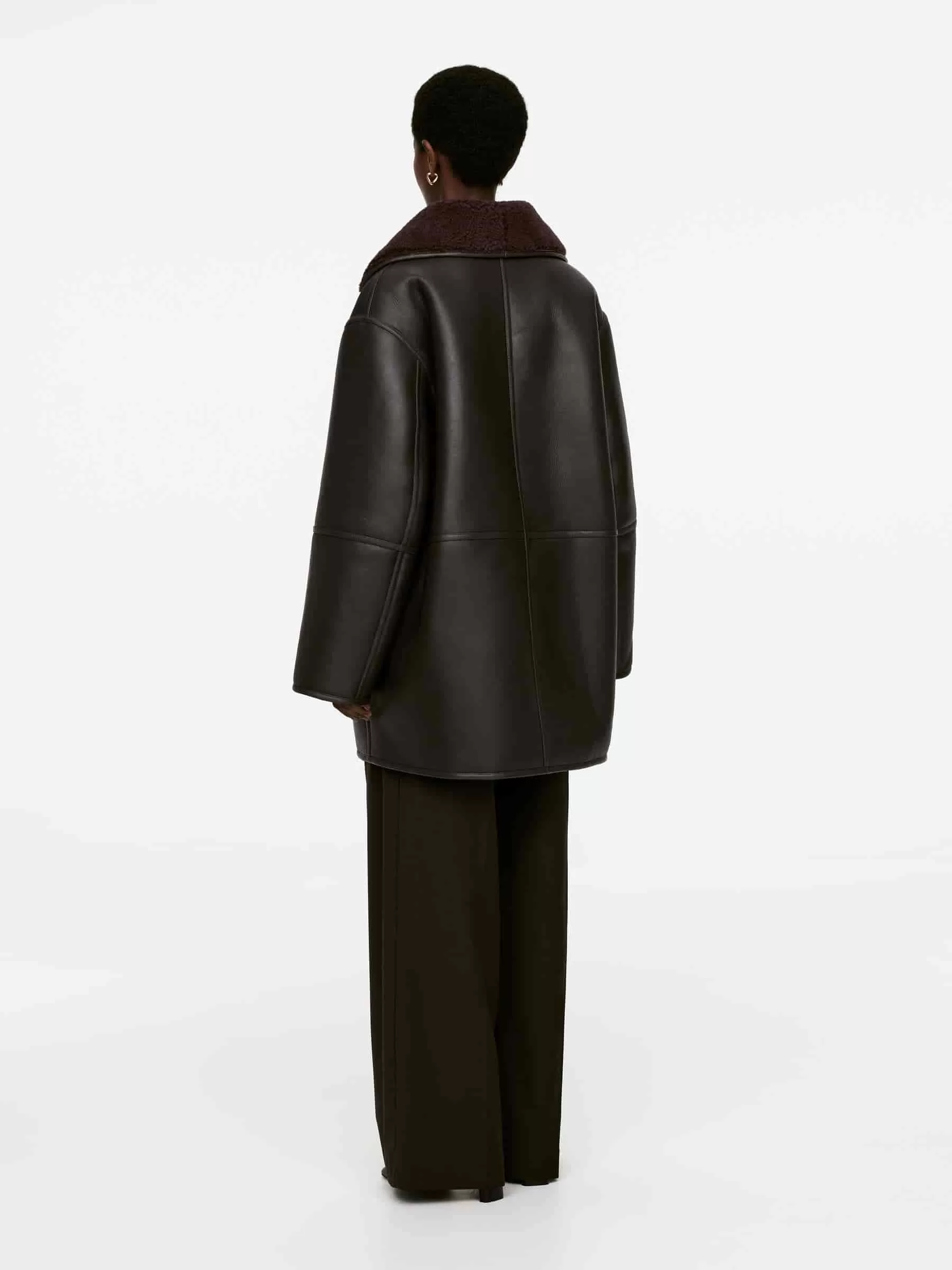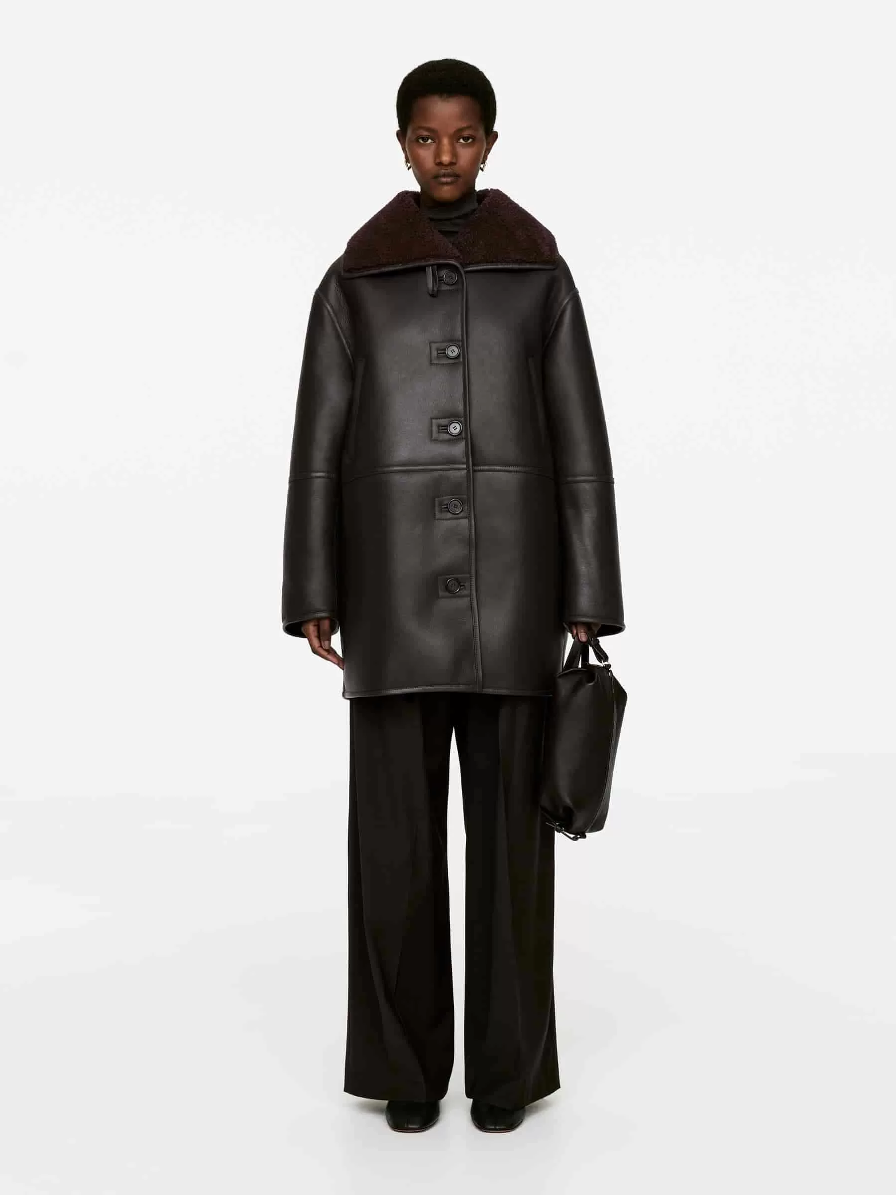Einreihige Lederjacke mit weicher Lammfell-Innenseite. Mit schmalen Leistentaschen, hoch- und herunterklappbarem Kragen und Knopfverschluss.