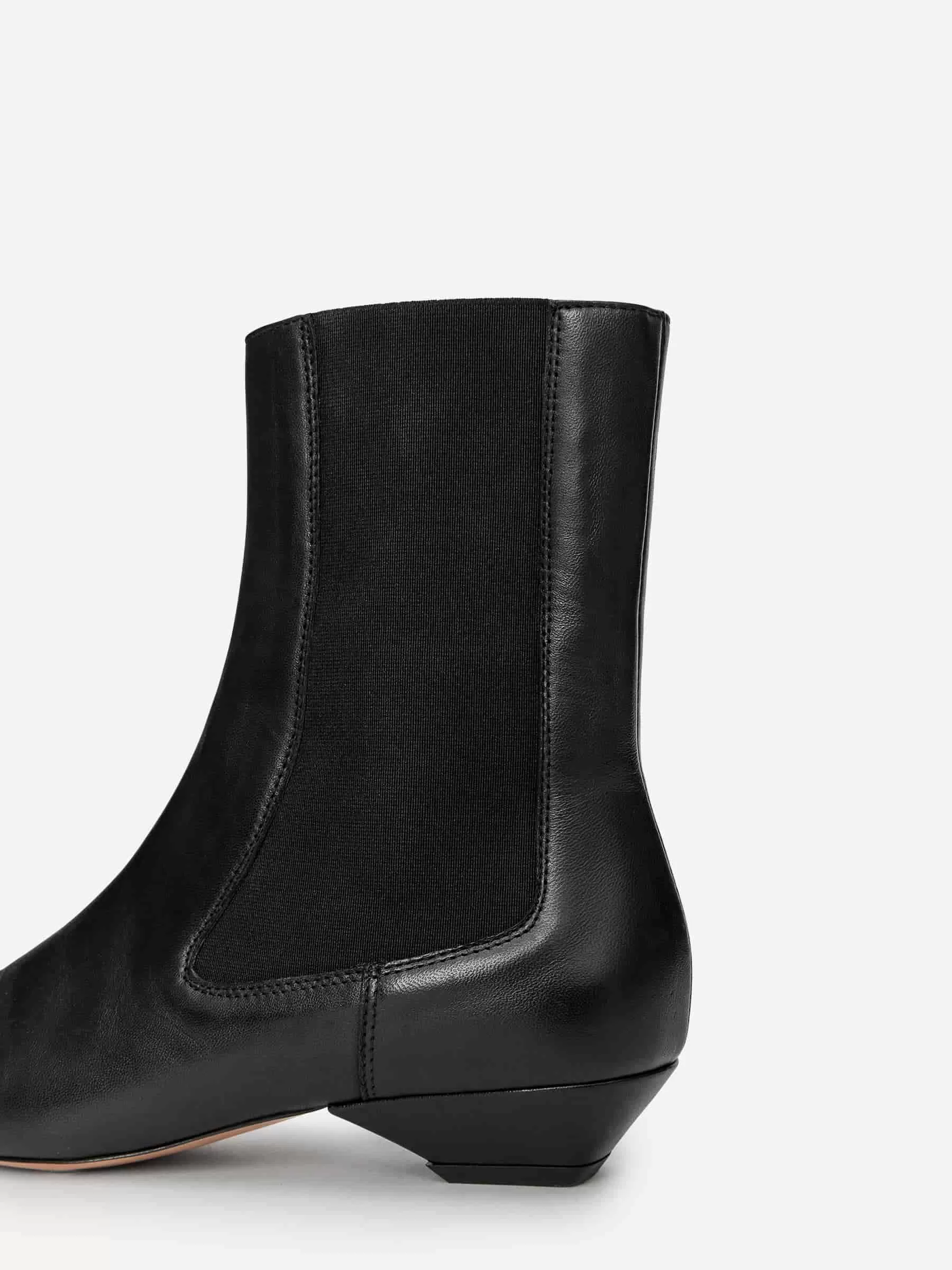 Stiefeletten aus geschmeidigem Leder, das einem chromfreien Gerbungsprozess unterzogen wurde. Ein schlankes Design mit spitzer Spitze und schrägem Absatz. Elastische Einsätze am Schaft. Absatzhöhe 3 cm.