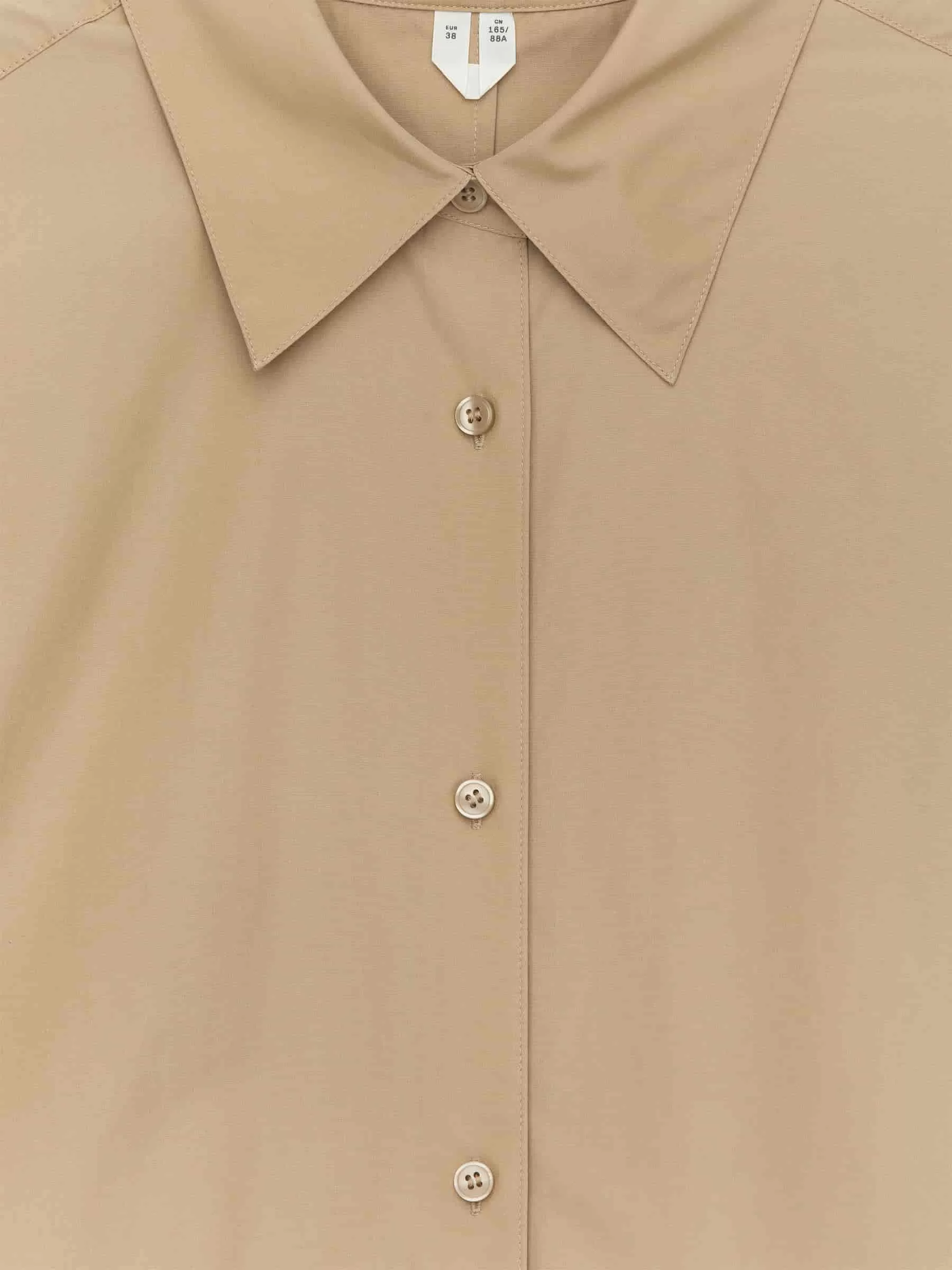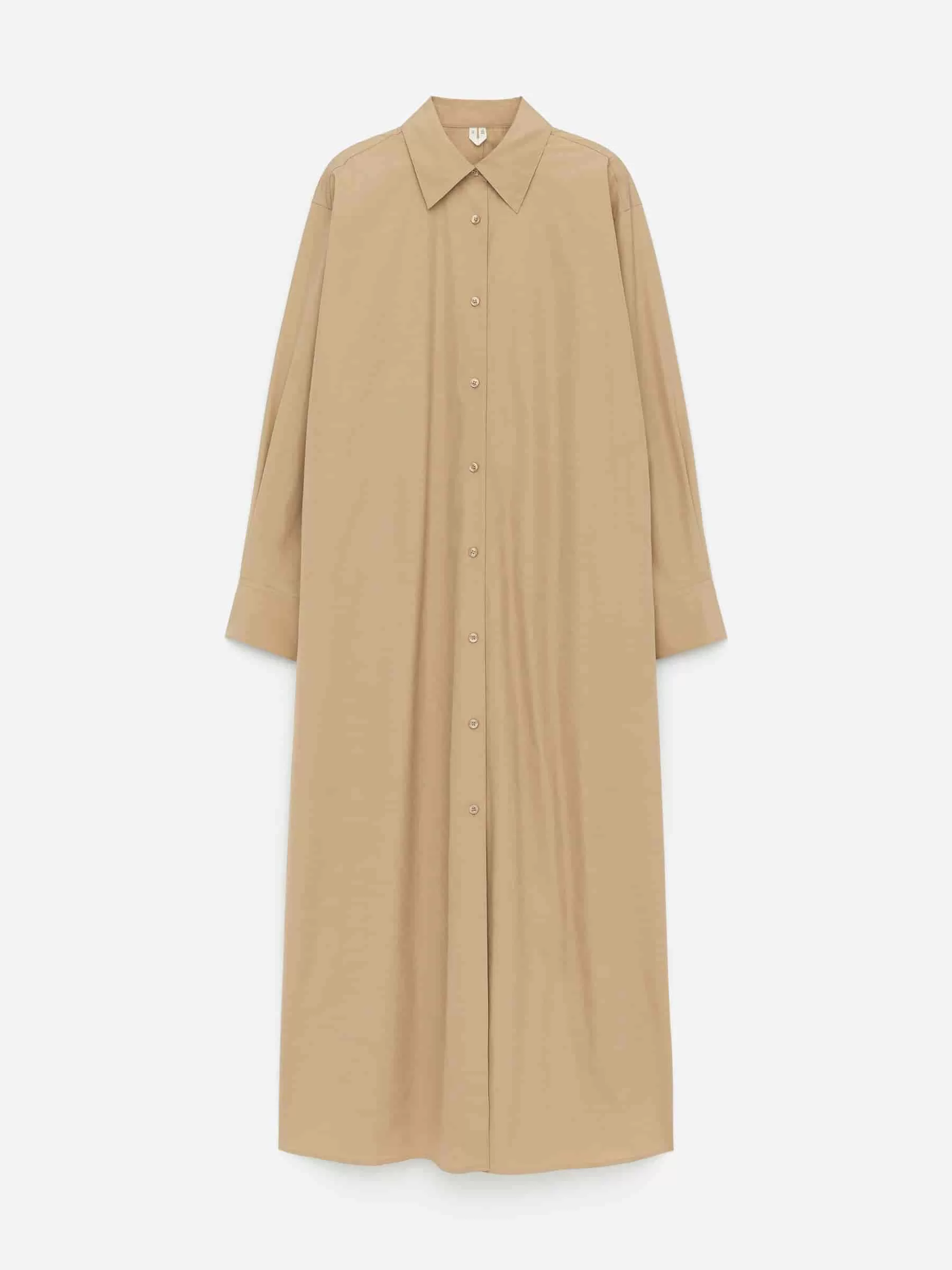 Hemdkleid in voller Länge mit übergroßer Passform. Es handelt sich um einen Button-Up-Stil mit Hemdkragen, seitlichen Nahttaschen und Schlitzen an den Seiten. Kellerfalte hinten in der Mitte. Ärmel mit überschnittenen Schulternähten und geknöpften Manschetten.