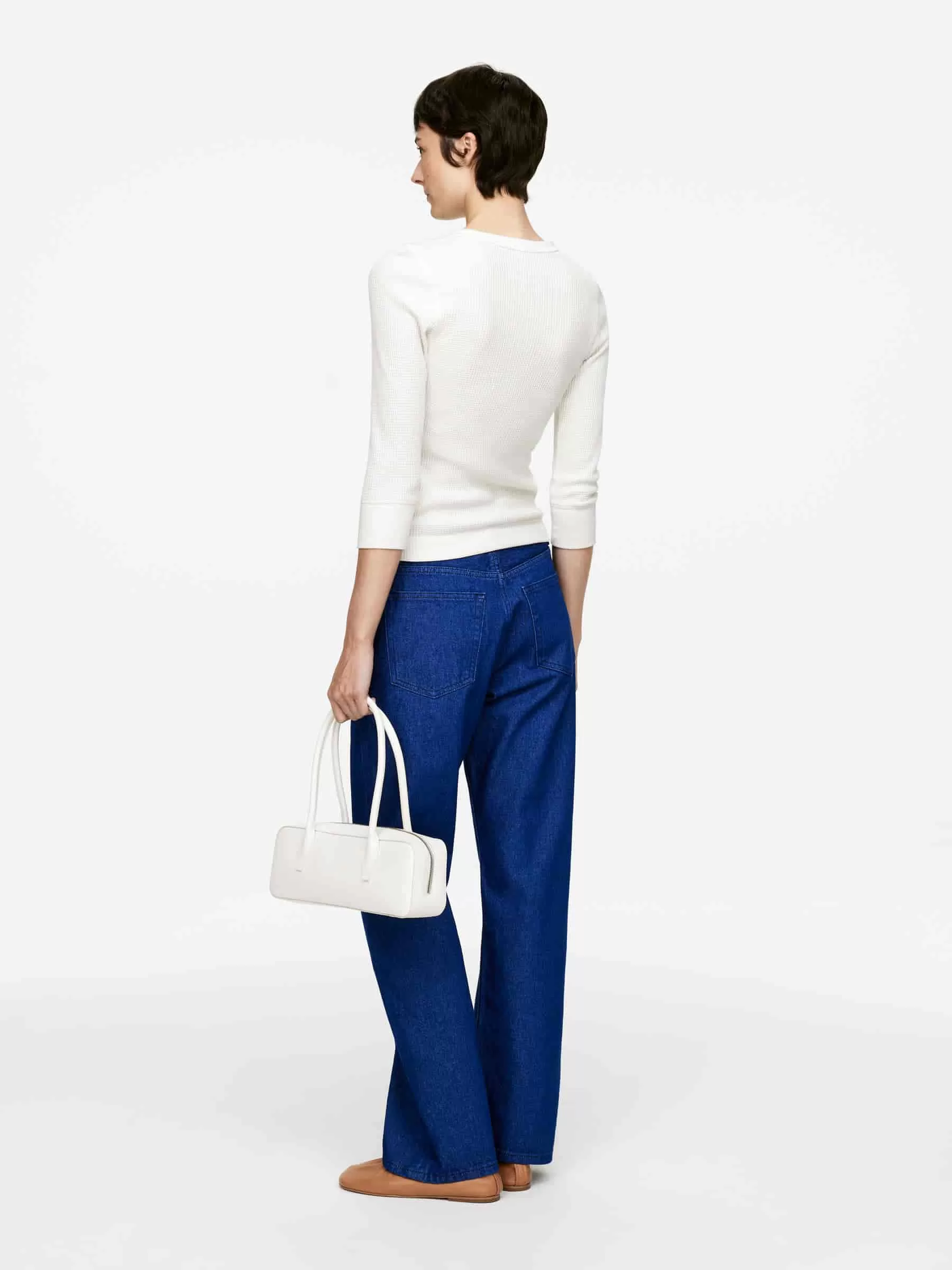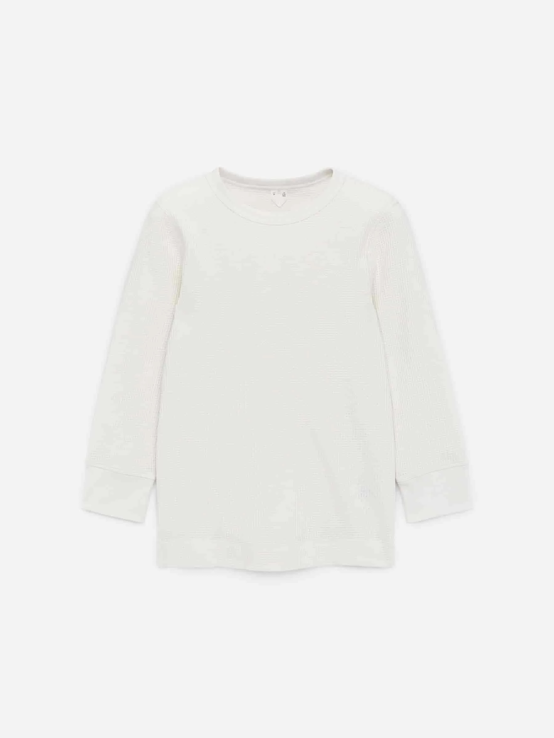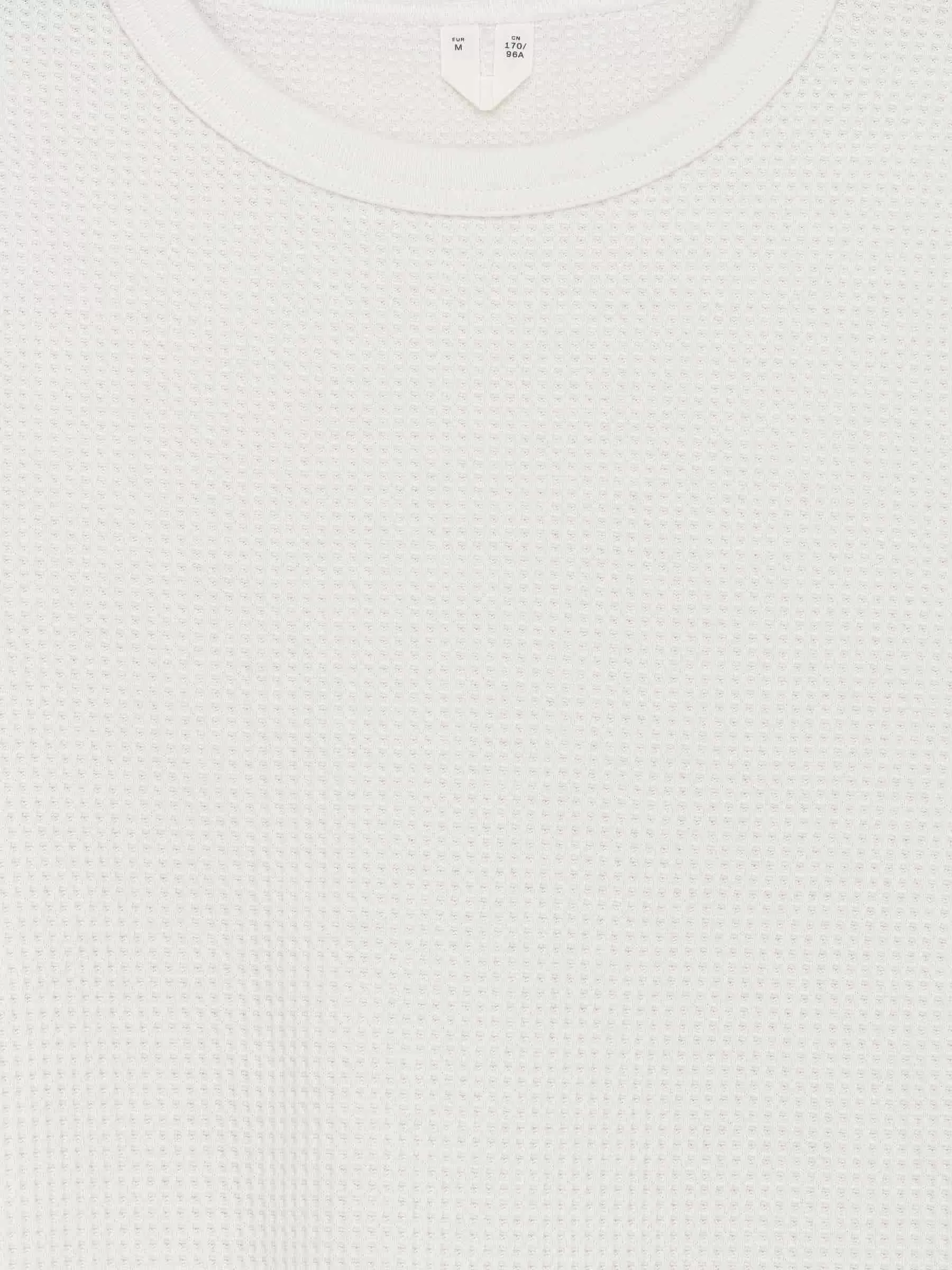 Schmal geschnittenes Oberteil aus Baumwolljersey mit Waffelstruktur. Ein Rundhals-Modell mit 3/4-Ärmeln und breiten Rippstrickbündchen. Kurzer Schlitz an den Seitennähten.