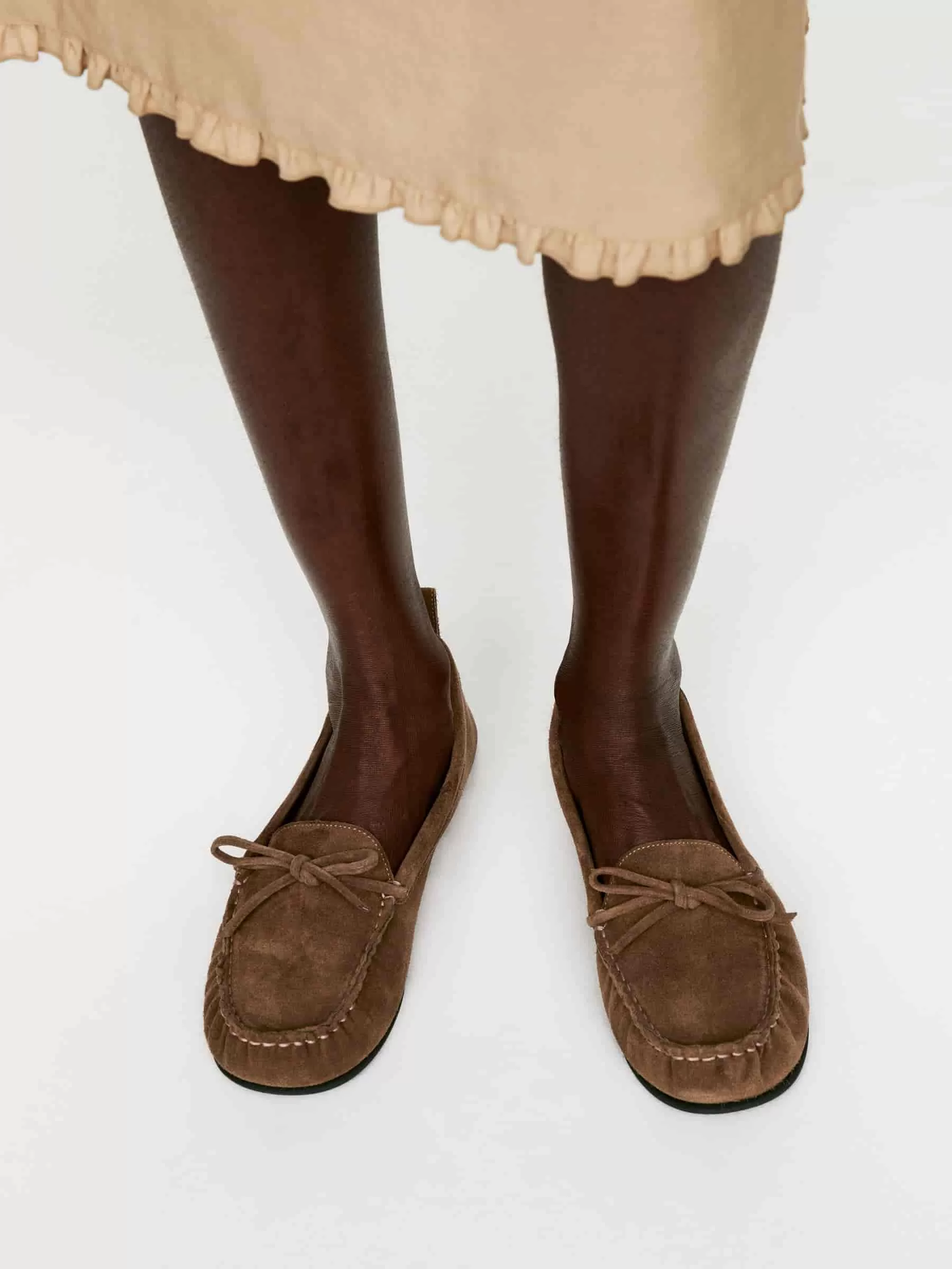 Mokassin-Loafer aus Wildleder mit dekorativer Obernaht, flachen Sohlen und Bindeverschluss.