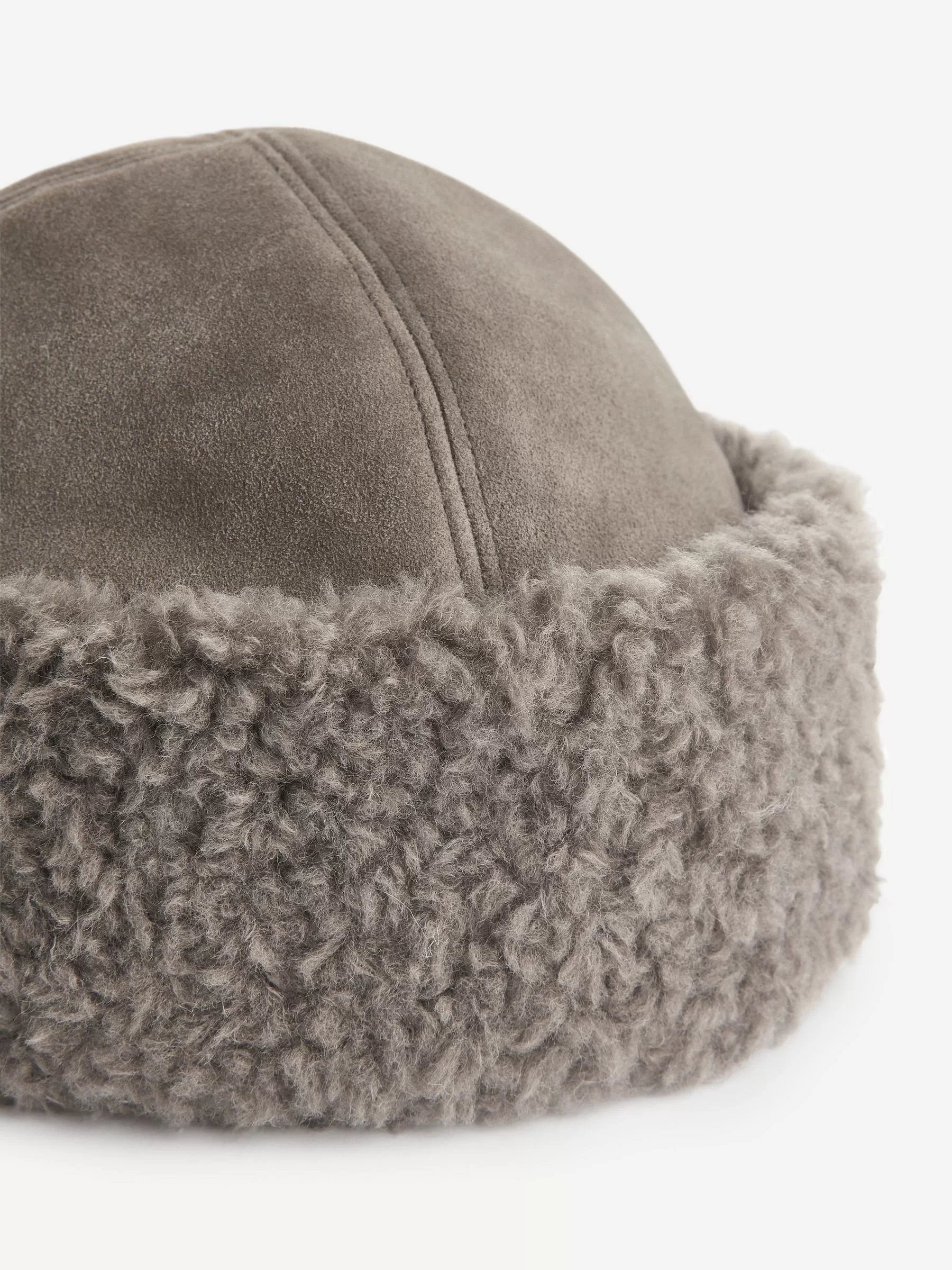 Gefütterte Wintermütze mit vierteiliger Krone aus Wildleder. Mit doppellagiger Krempe aus Flor.