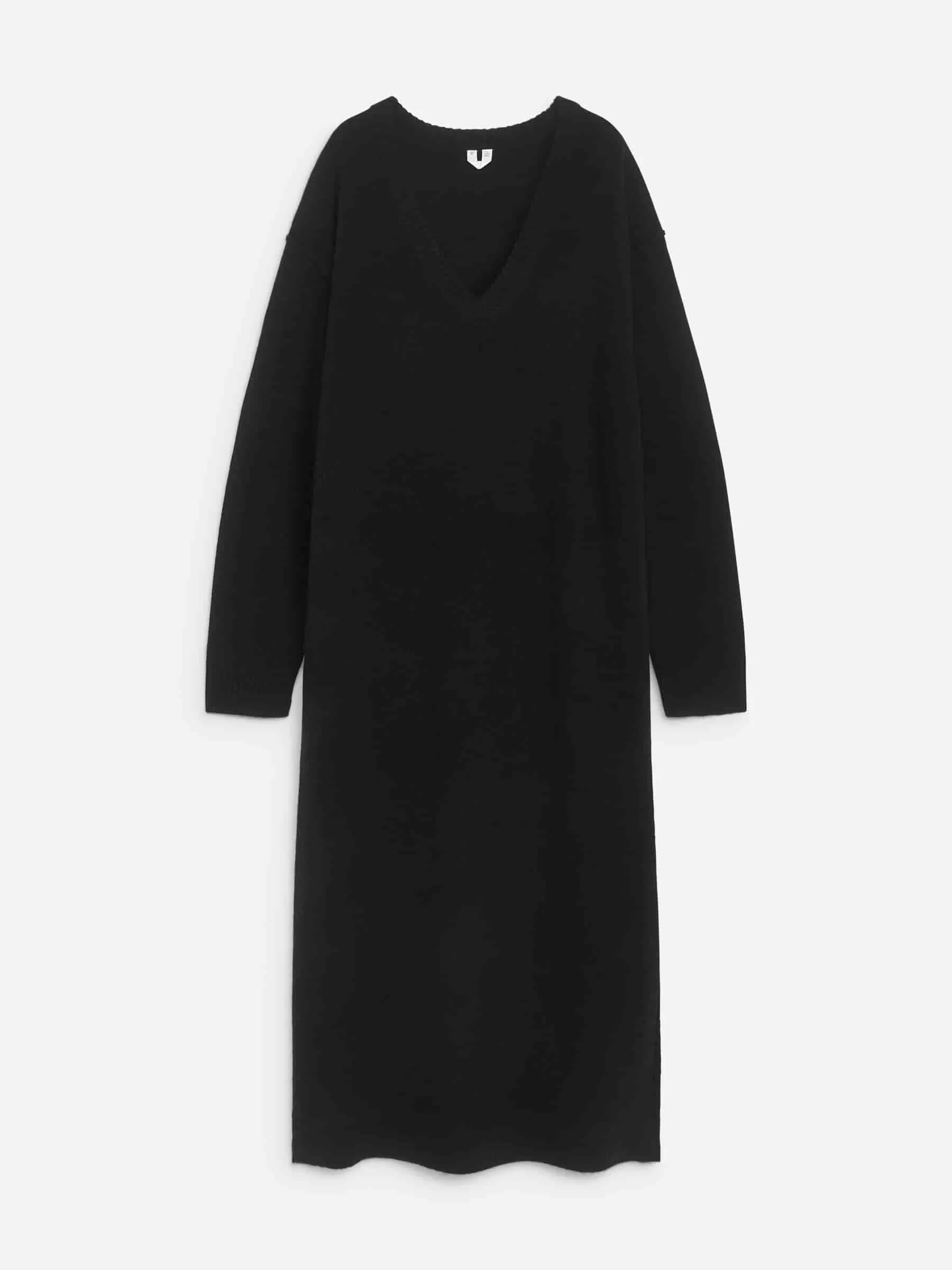 Maxikleid mit V-Ausschnitt aus Wolle gestrickt. Mit langen Ärmeln und gerader Silhouette. Das Kleid besteht aus 100 % RWS-Wolle (TE-00047206). Produkte, die nach dem Responsible Wool Standard (RWS) zertifiziert sind, enthalten Wollfasern von Farmen, die unabhängig nach Tierschutz- und Landbewirtschaftungsanforderungen zertifiziert sind.