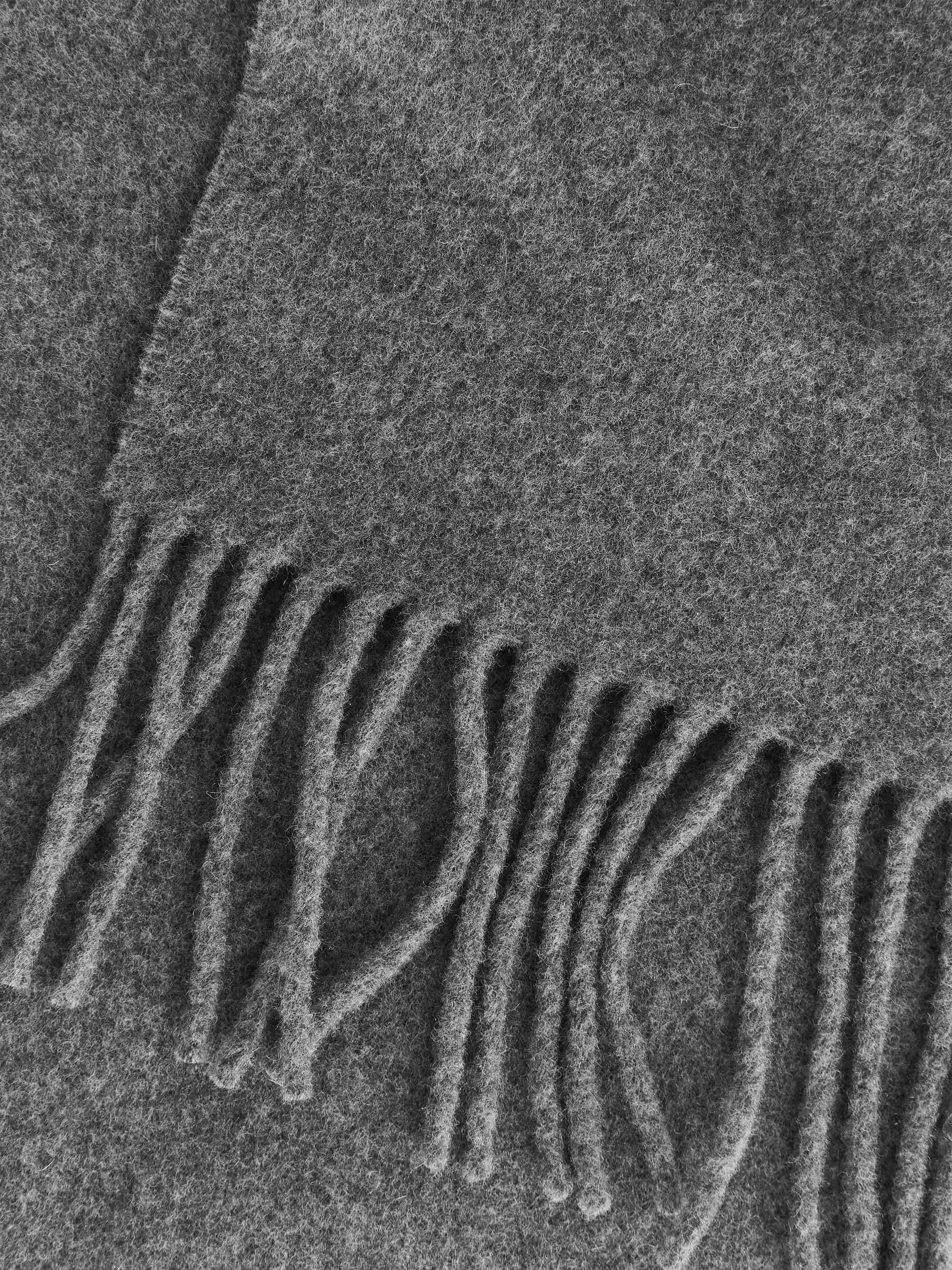 Schal dicht gewebt aus Wolle. Detailliert mit Fransen an den kürzeren Kanten. Maße: 27 cm x 250 cm.