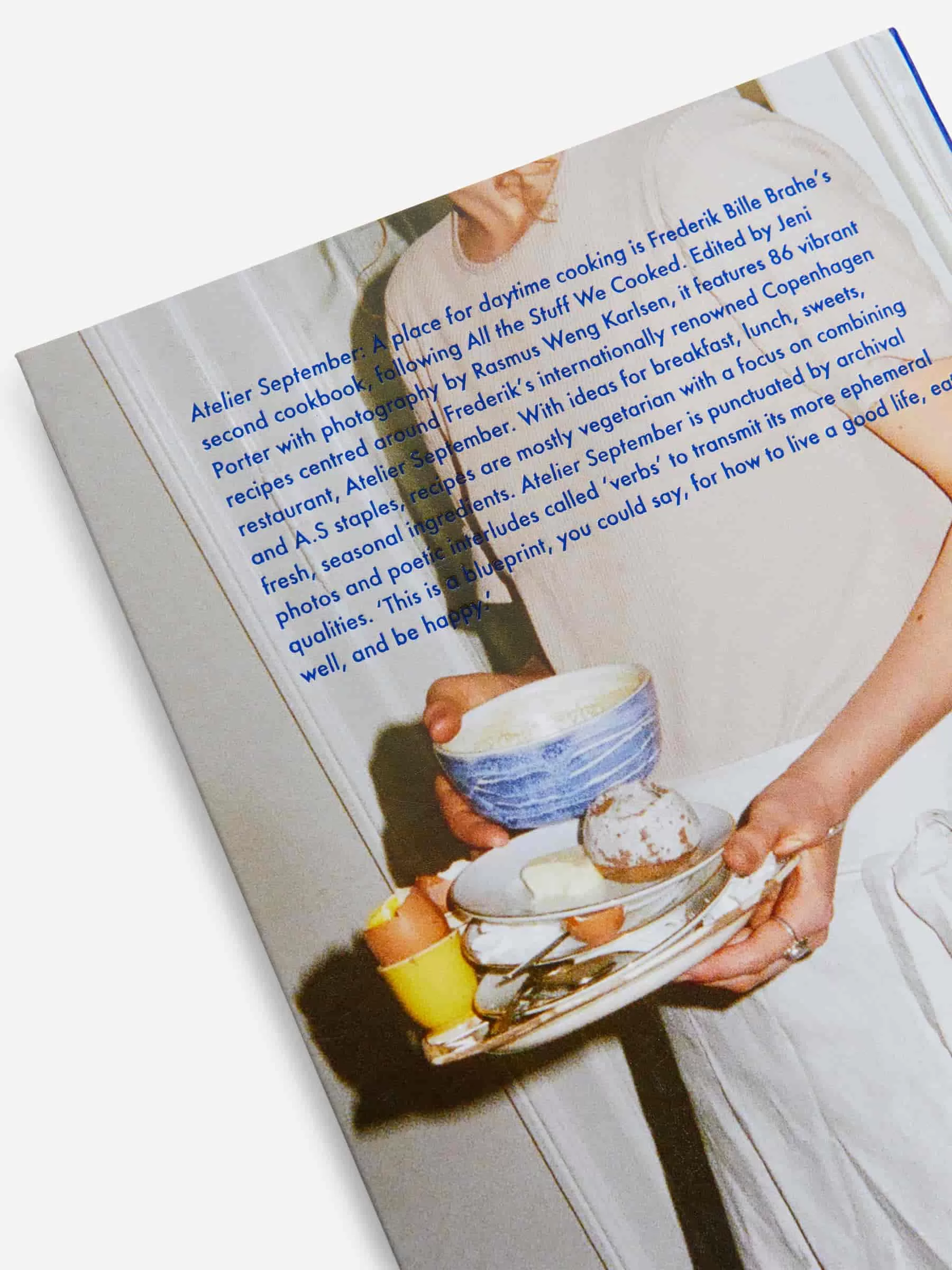 Atelier September: A place for daytime Cooking ist das erste Kochbuch, das dem renommierten Kopenhagener Restaurant gewidmet ist und 86 Rezepte von Besitzer Frederik Bille Brahe enthält. Herausgegeben von Jeni Porter und mit Fotografien von Rasmus Weng Karlsen. Herausgegeben von Apartamento.