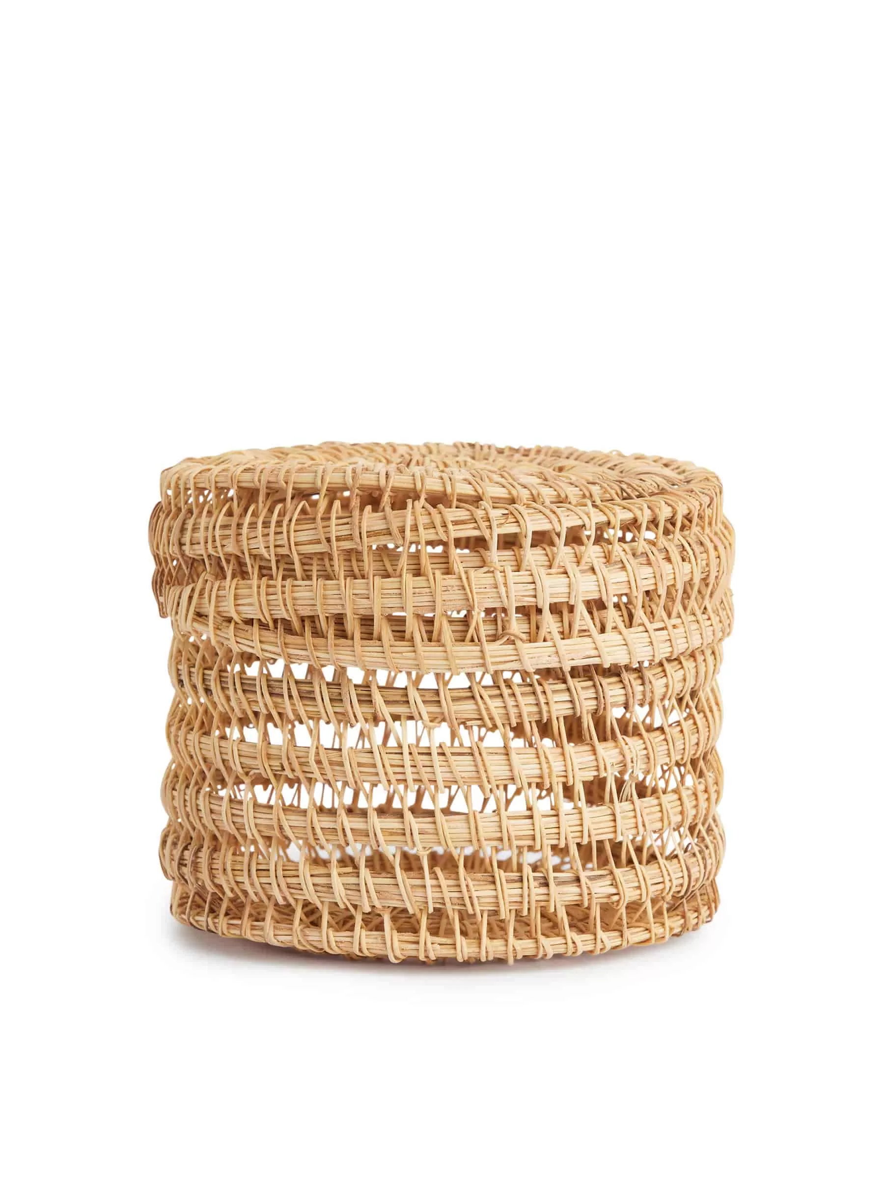 Aufbewahrungsbox mit Deckel aus Palmfaser gewebt. Breite 10,5 cm, Höhe 8 cm.