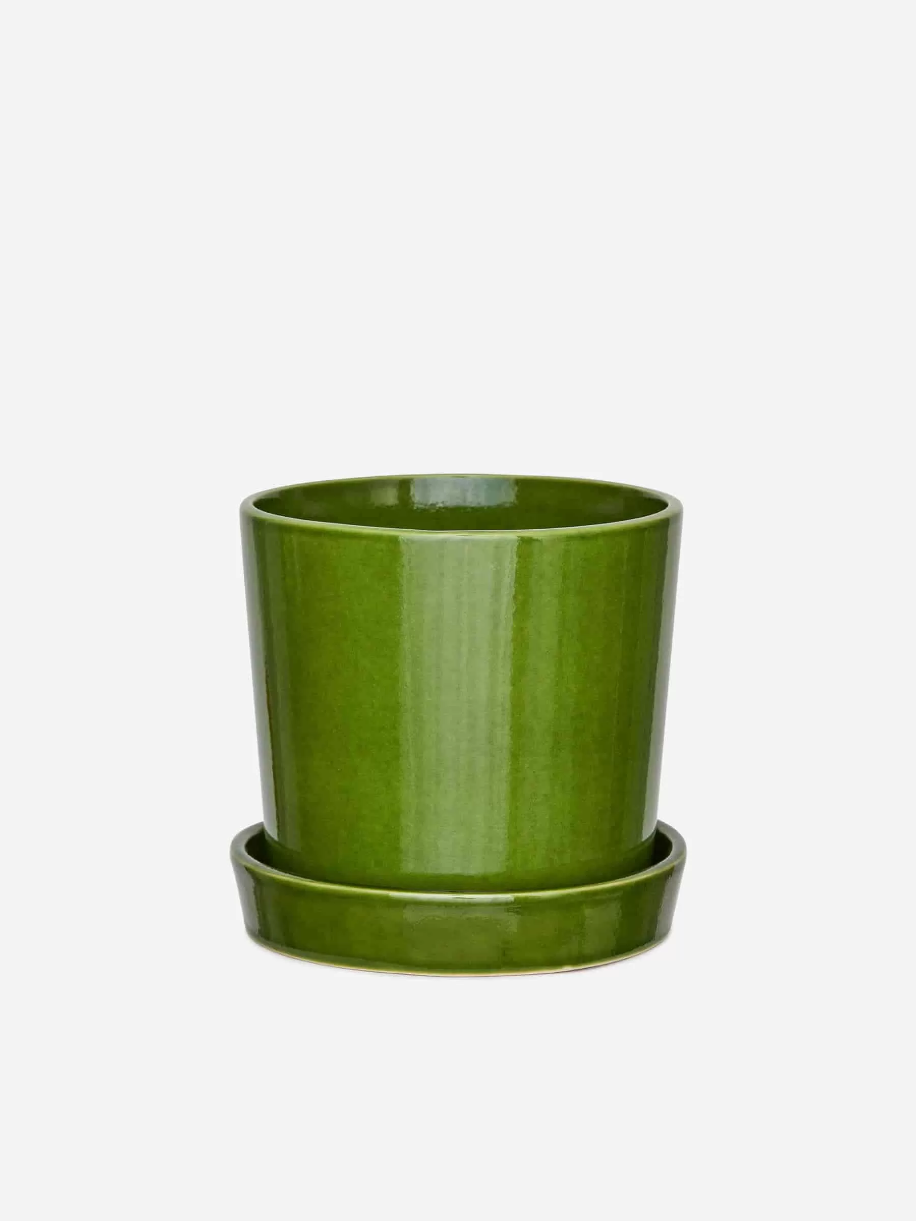 Ein Blumentopf aus glasiertem Steingut mit passender Untertasse. Loch im Boden und eine Untertasse mit hohem Rand, die überschüssiges Wasser auffängt. Topf: Höhe 170 mm, Durchmesser 180 mm. Untertasse: Höhe 35 mm, Durchmesser 185 mm.