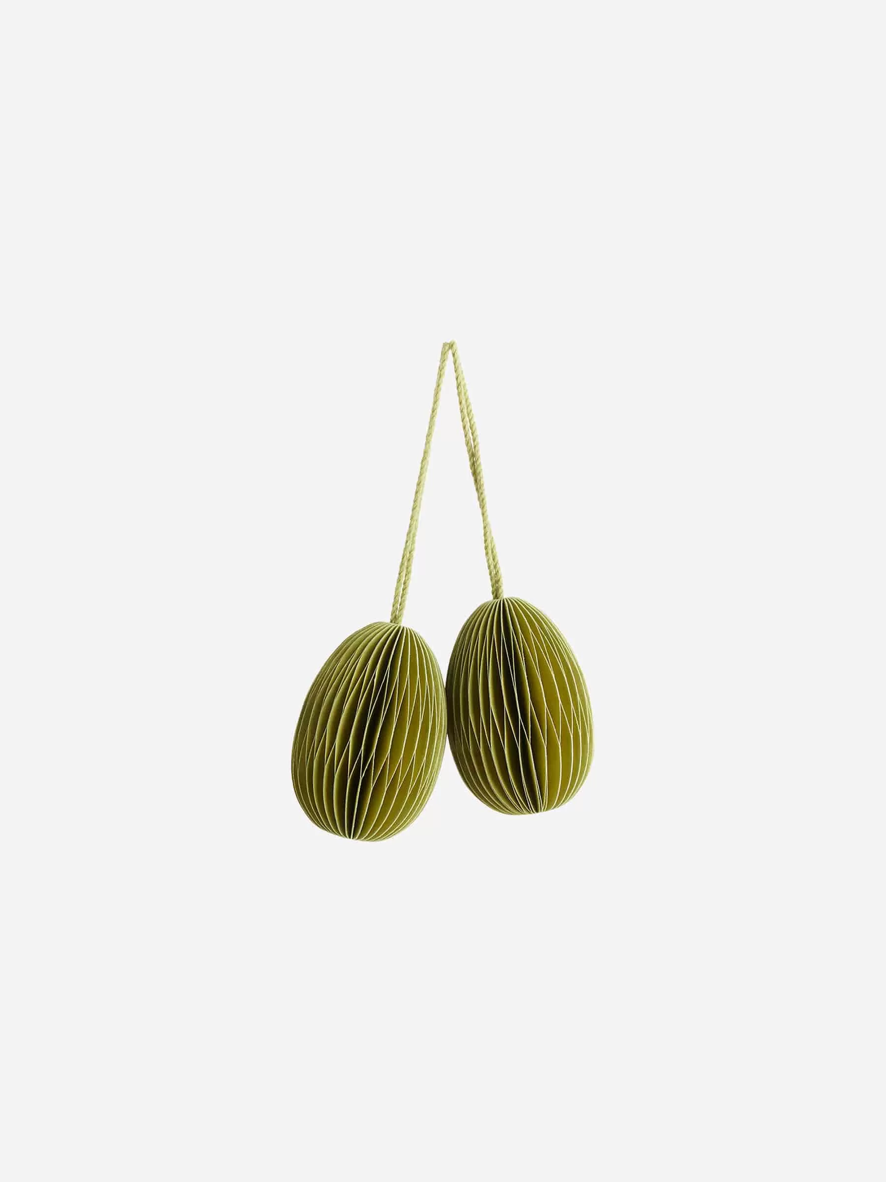 Ornamente aus stabilem Papier und einem Baumwollband zum einfachen Aufhängen. Höhe des Eies 4,8 cm. Breite 3,4 cm. Band 6 cm. Zweierpack.
